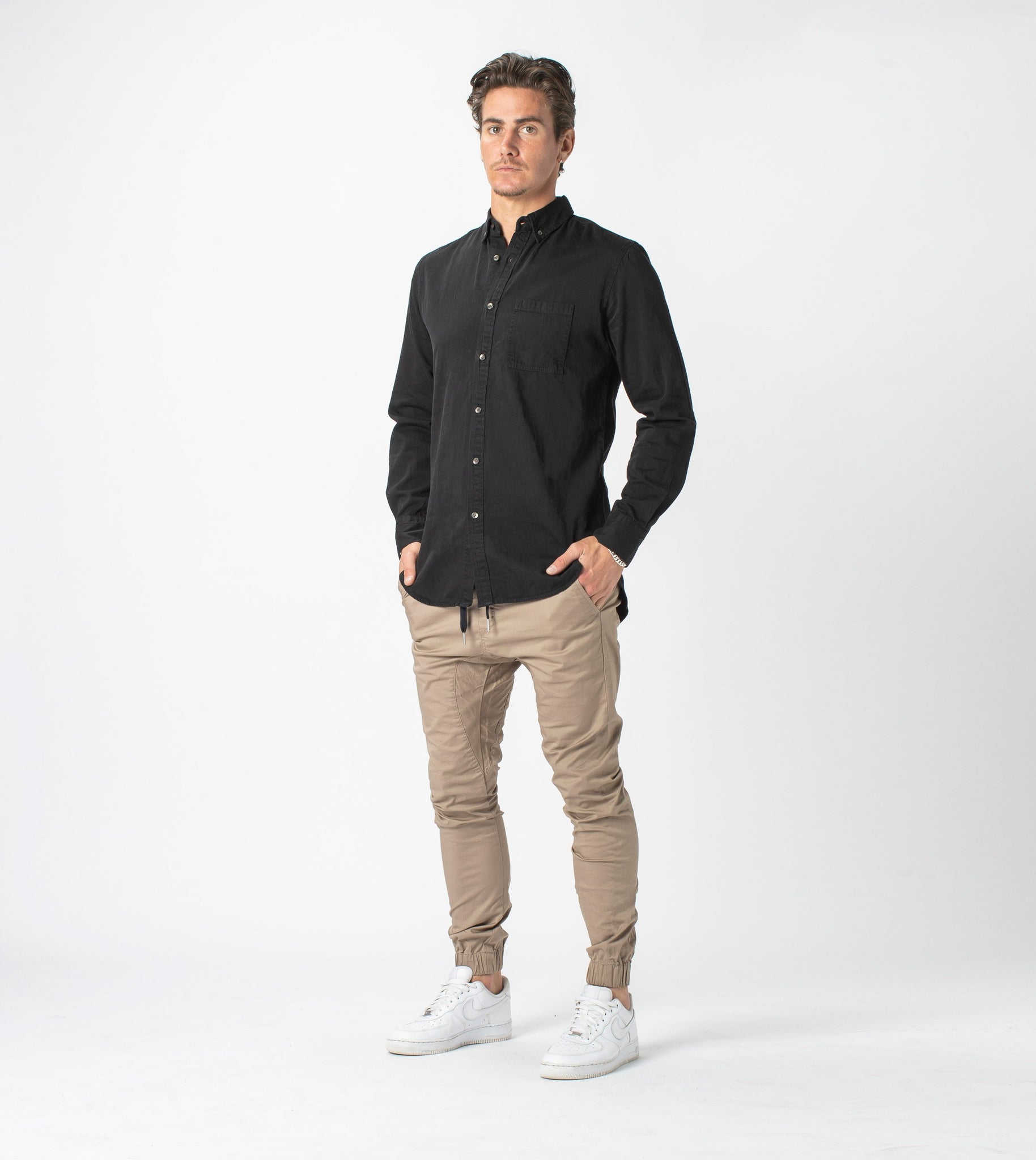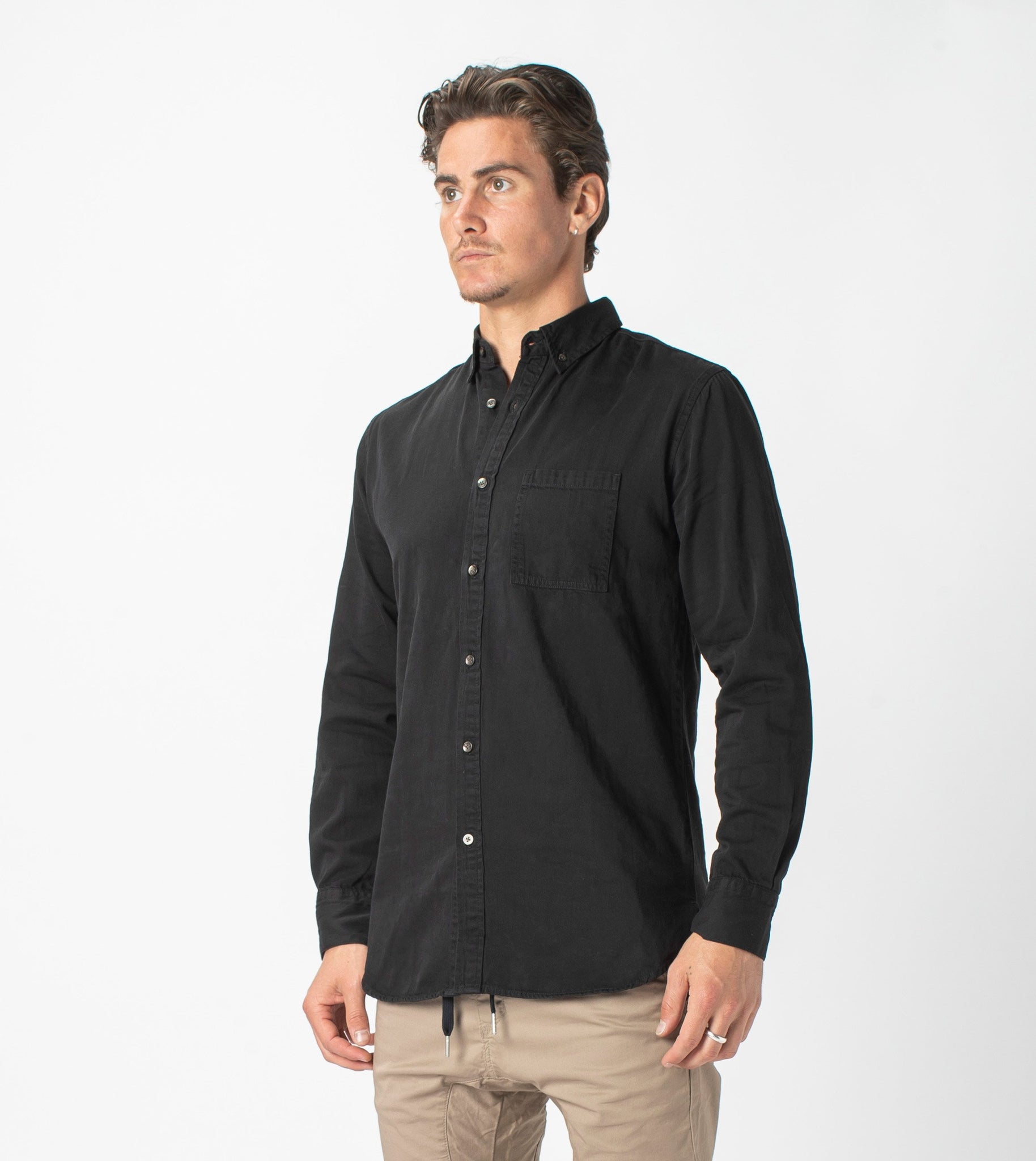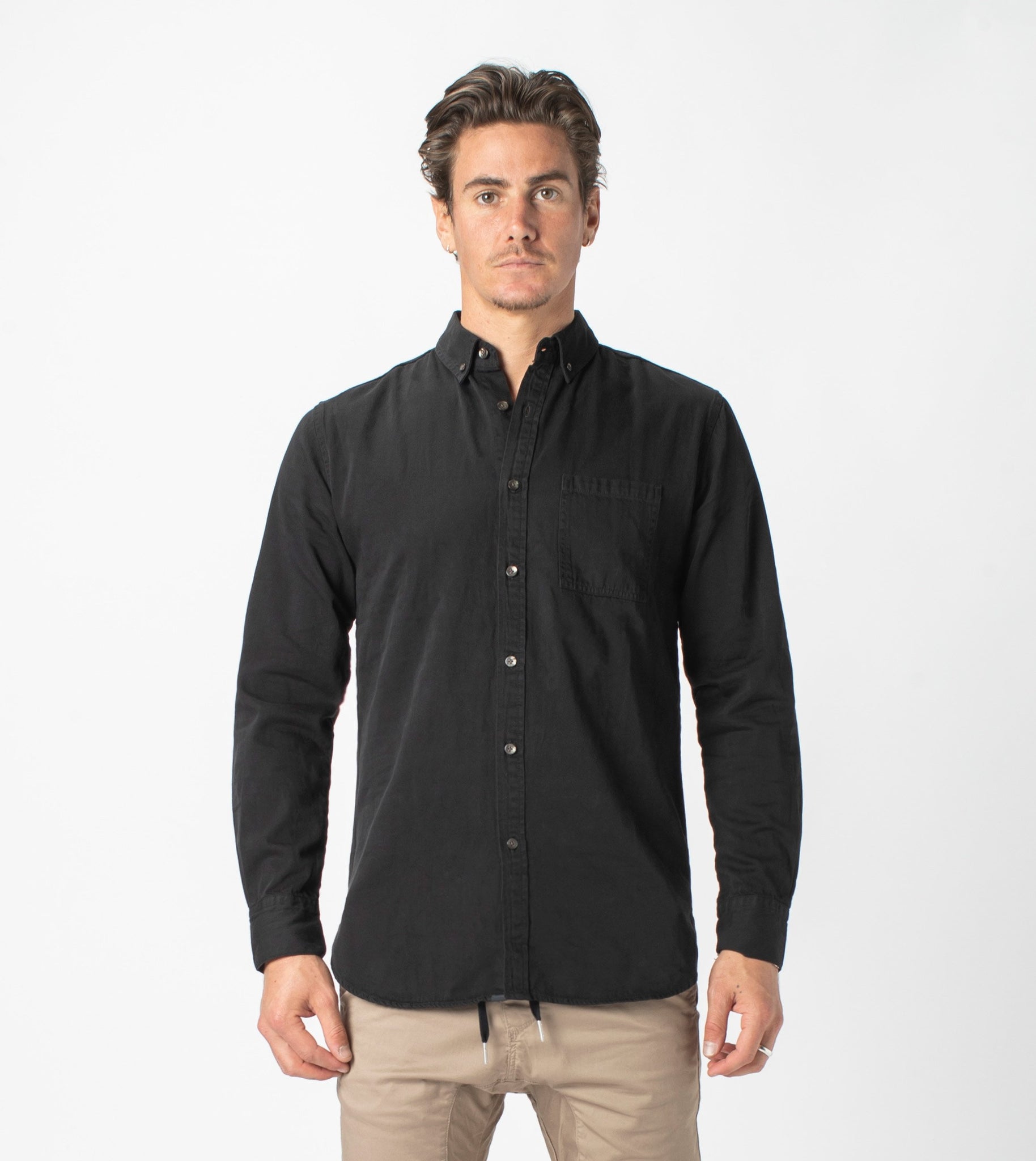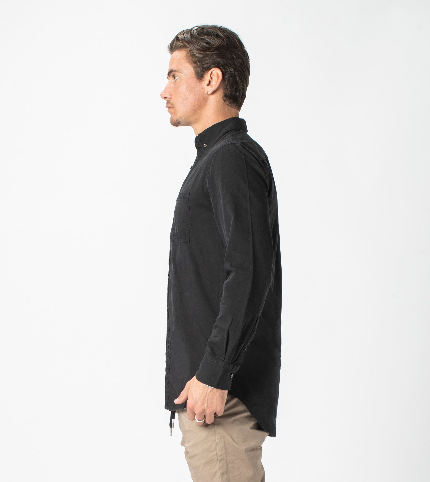 The ZANEROBE 7 Foot Denim LS Shirt in Washed Black - style with a ZANEROBE Box Tee & Sureshot Joggers to complete the look.
