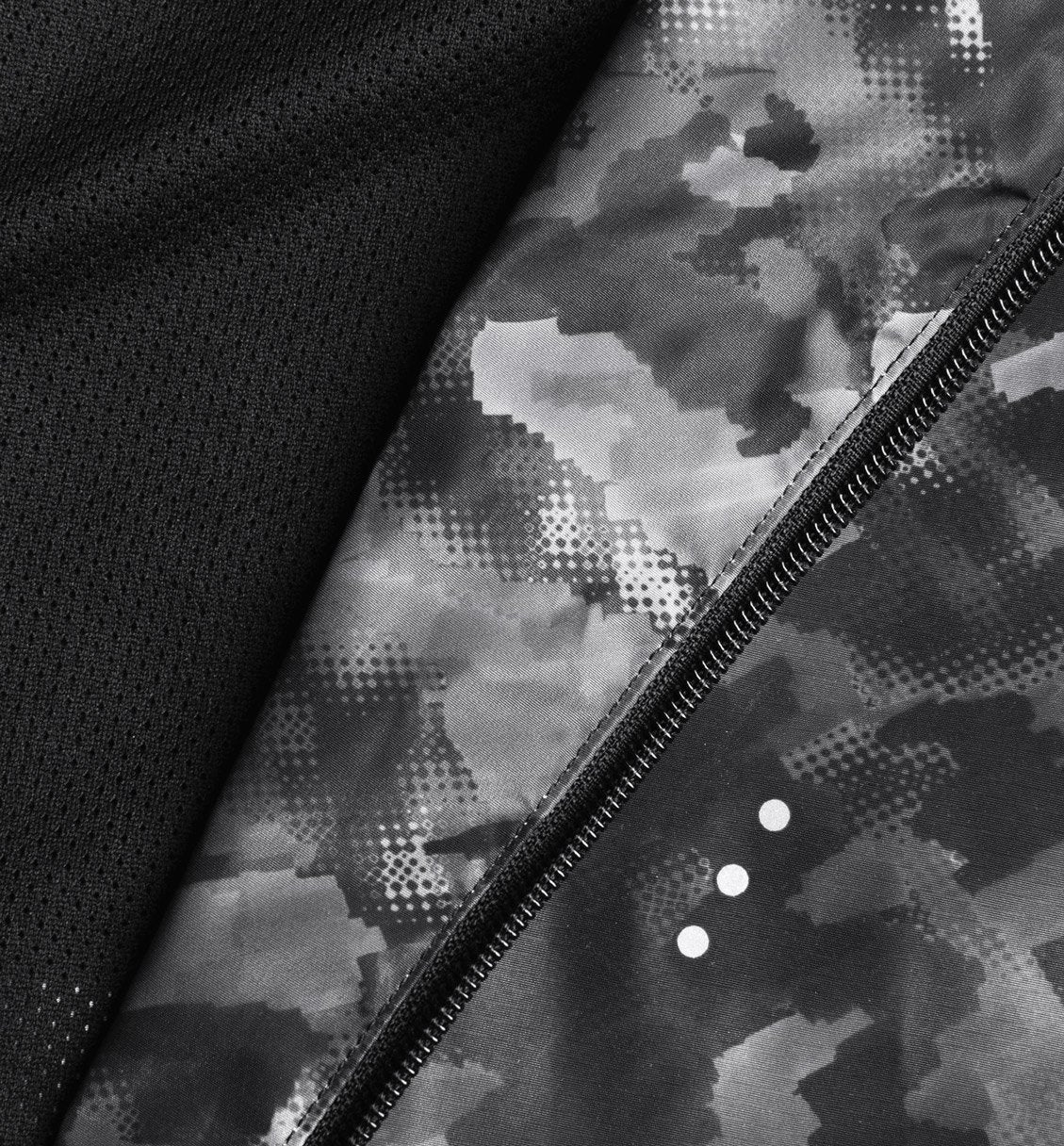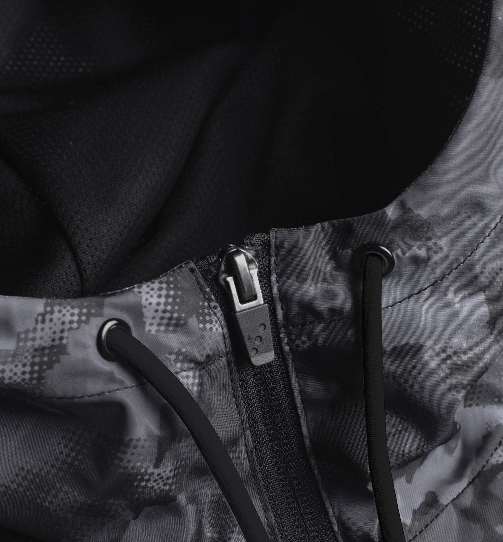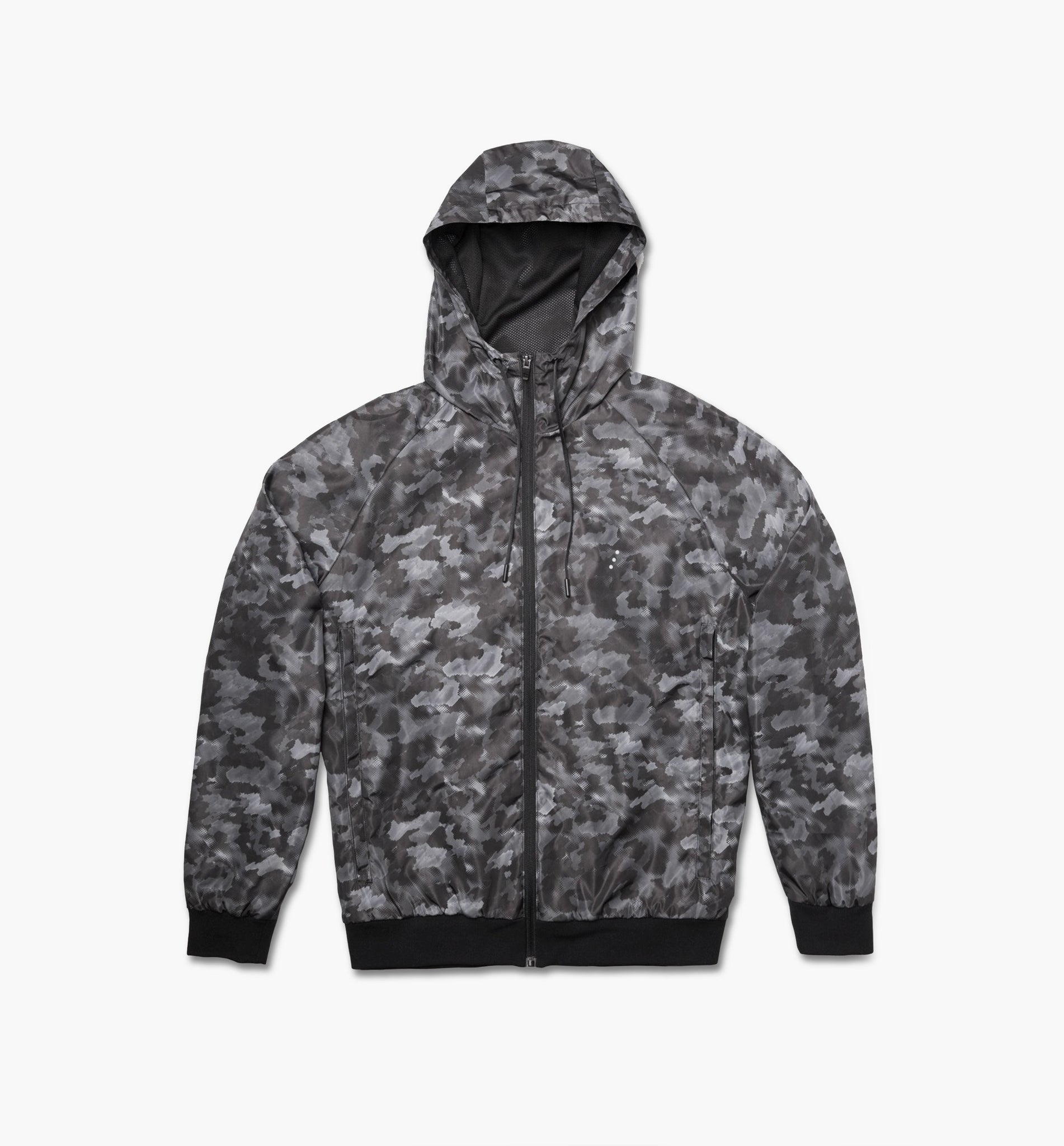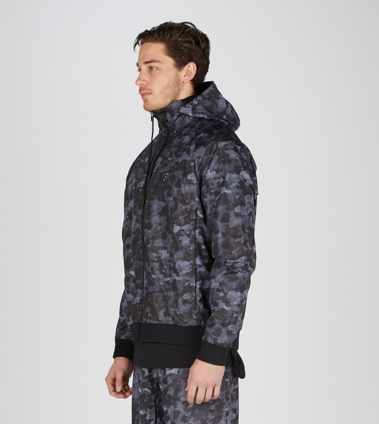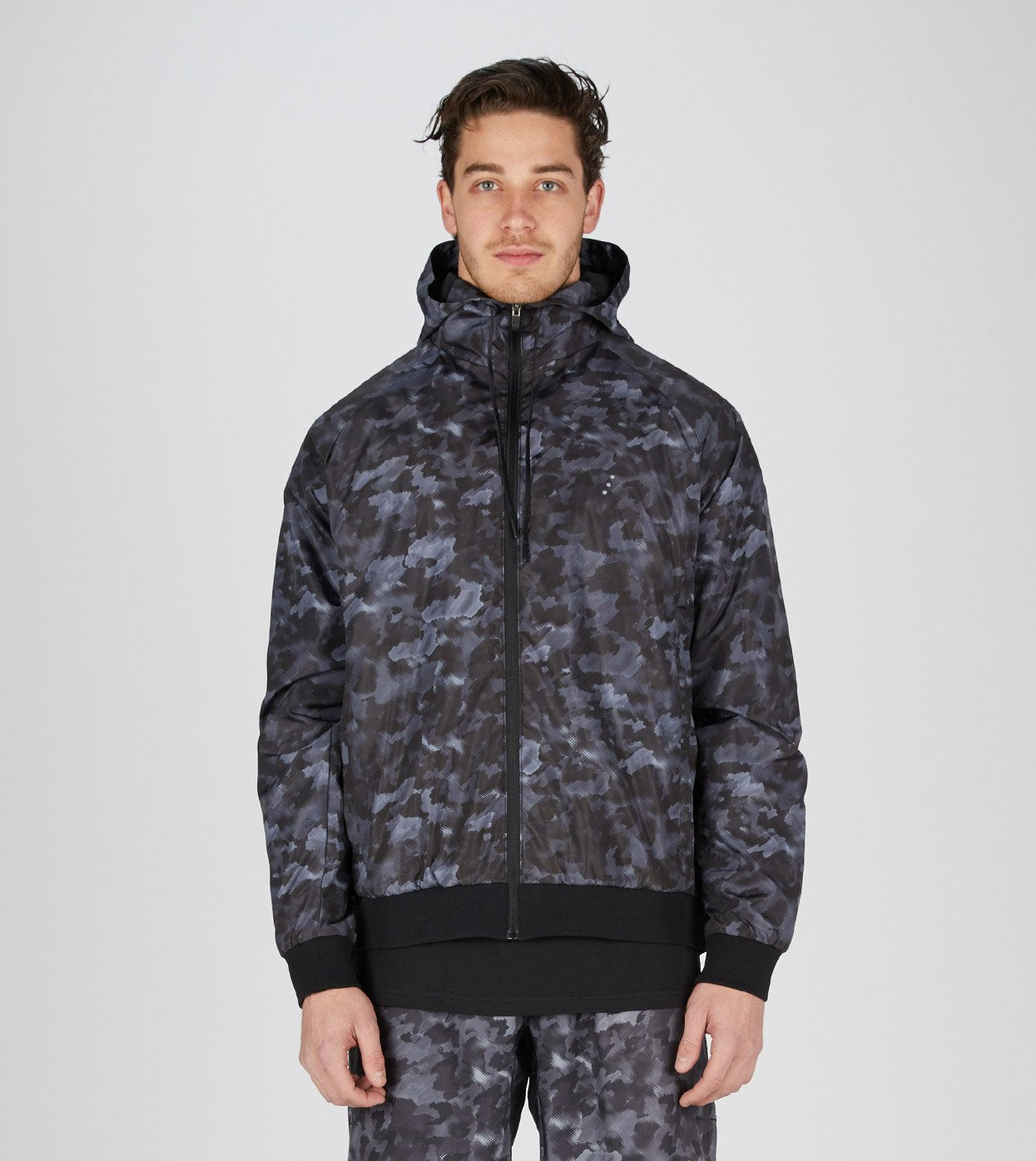 The ZANEROBE REC Air Spray Jacket in Black Camo - Mid-weight, zip-through jacket in a water-repellent and wind blocking fabrication. Highly durable outer with full internal mesh lining. Elongated zipper pockets, dual-designed as a cooling system when opened. Back body vent, technical rib cuffs and hem, heat transfer branding. Ideal for warm up, training & travel.
