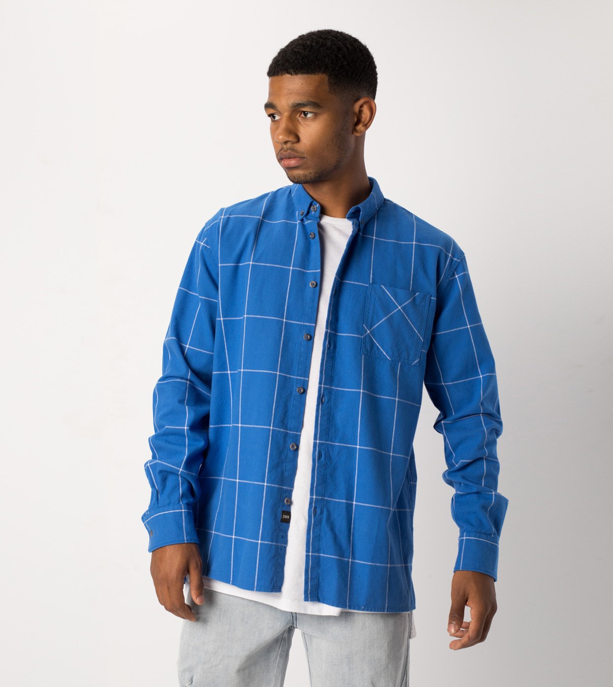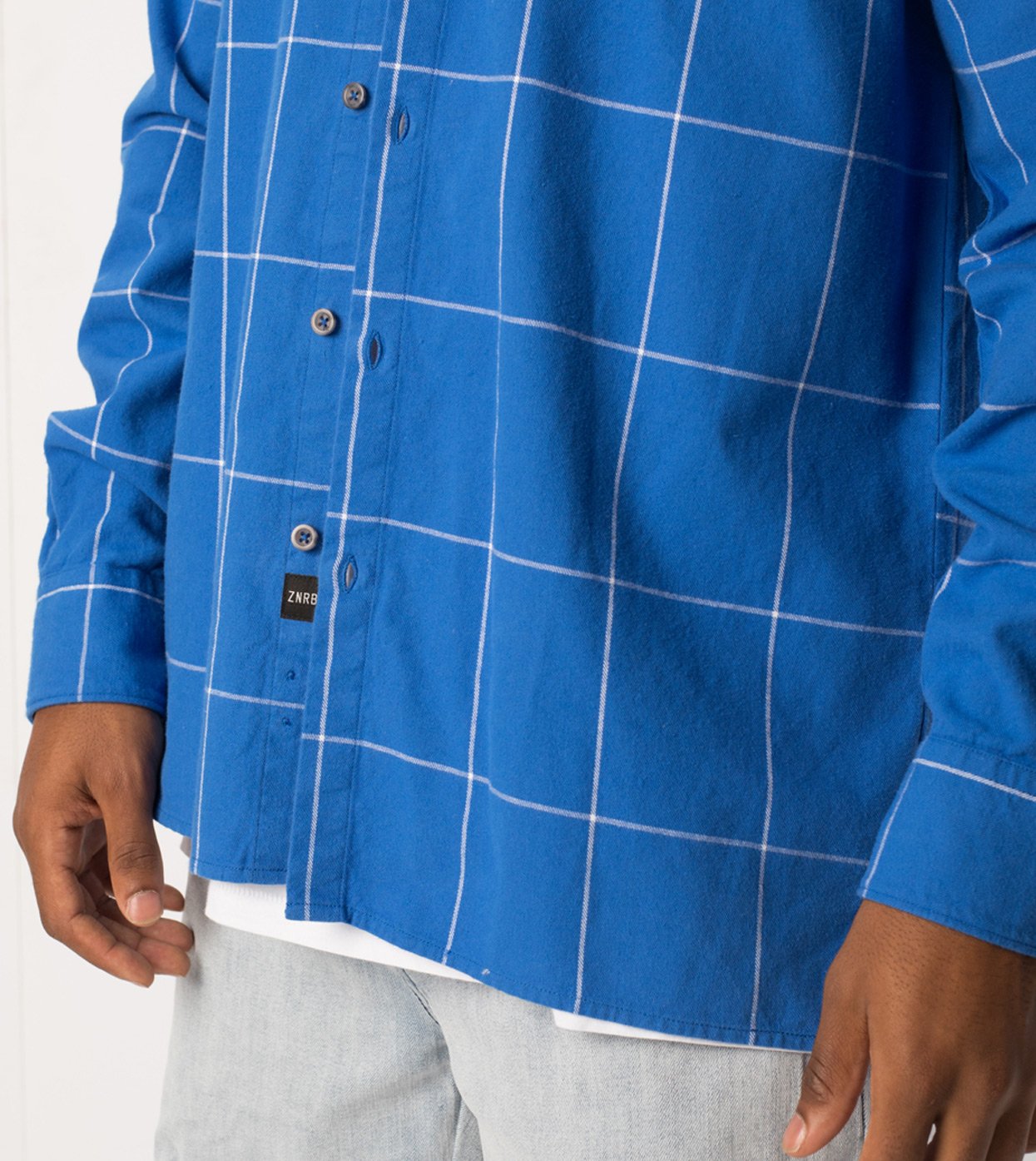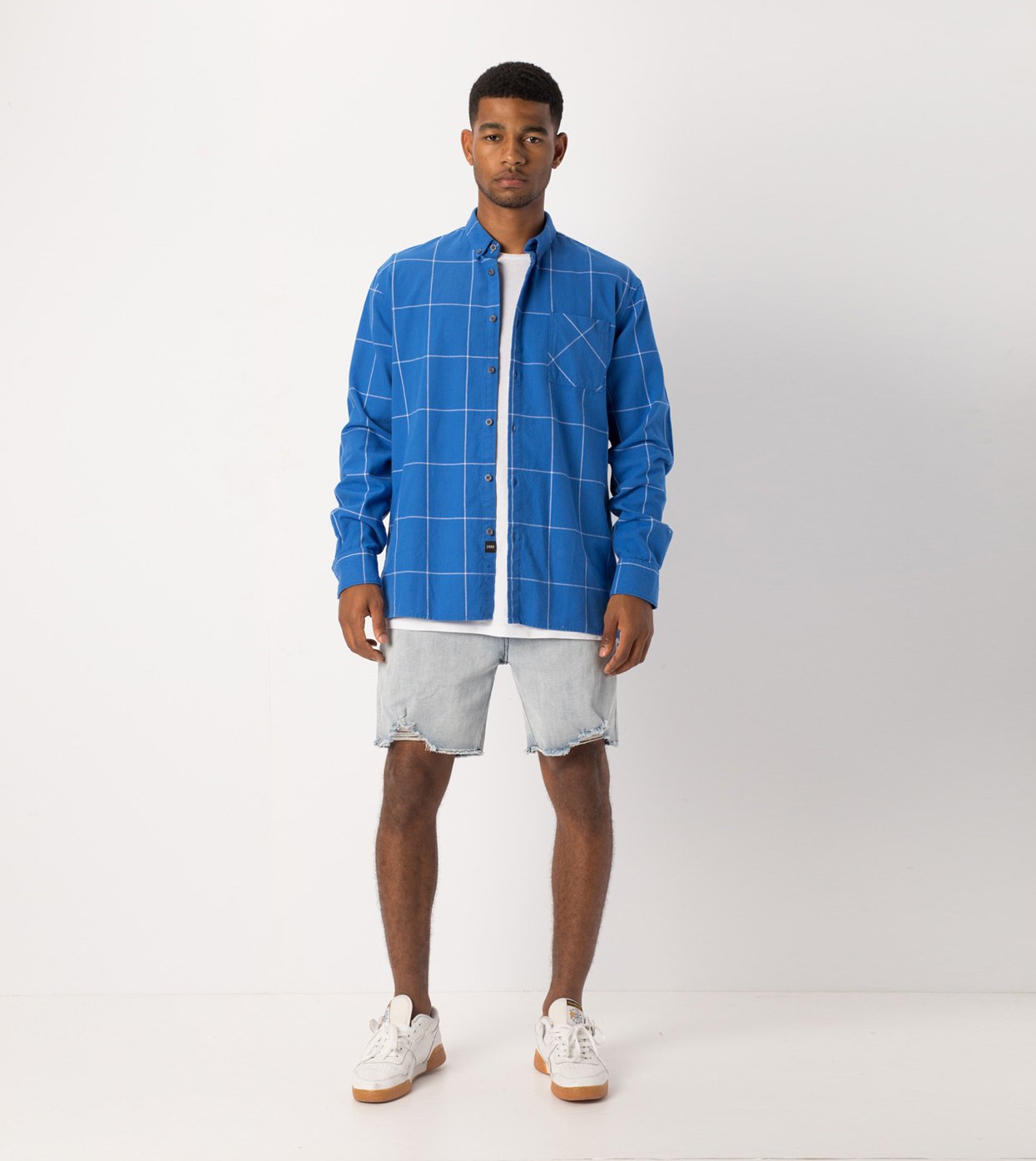 The ZANEROBE Align LS Shirt Cobalt/White - Boxy fit flannel shirt, long sleeves, classic button-down collar made from 100% cotton. We wear with Joe Blow Denim Shorts.
