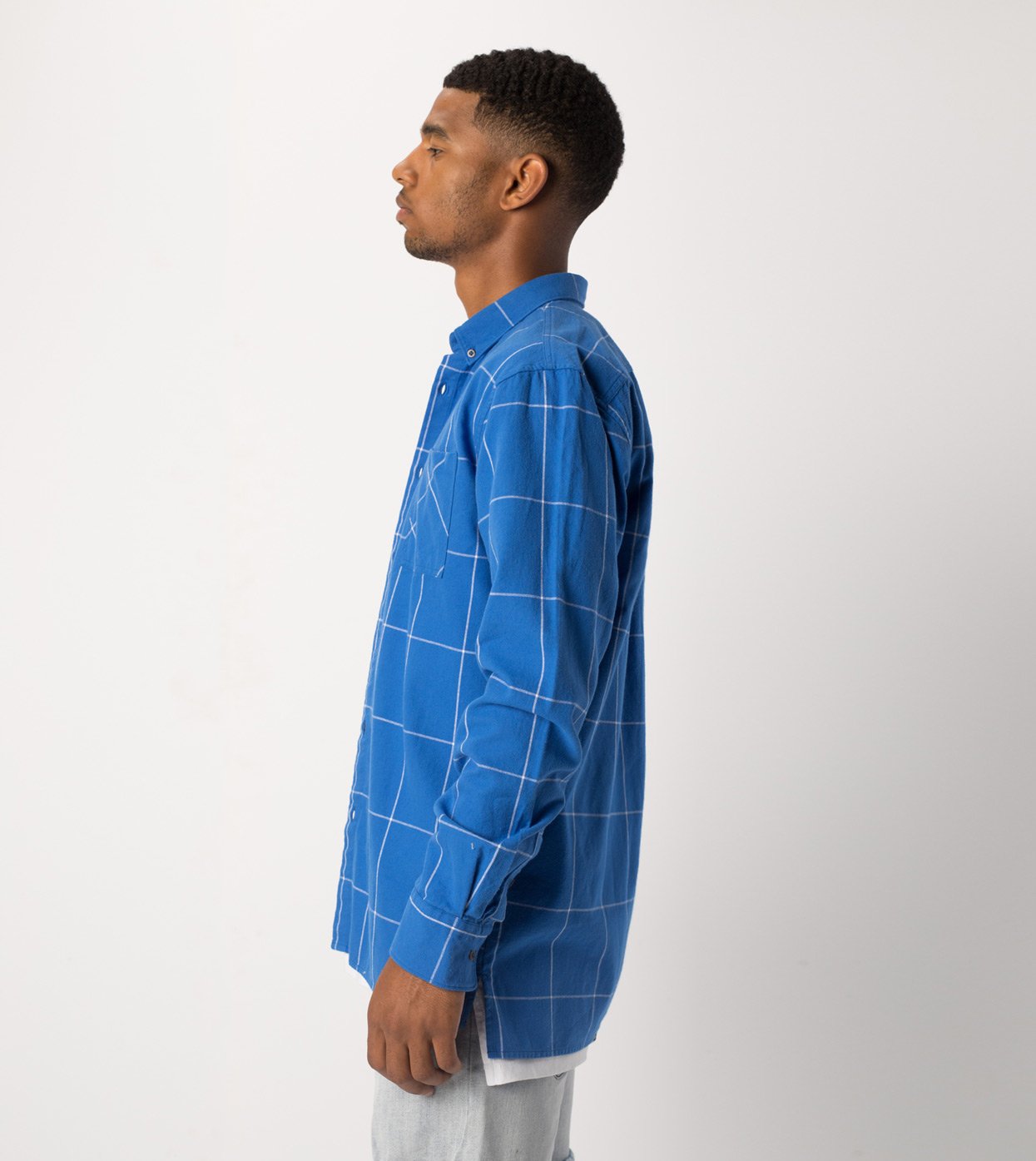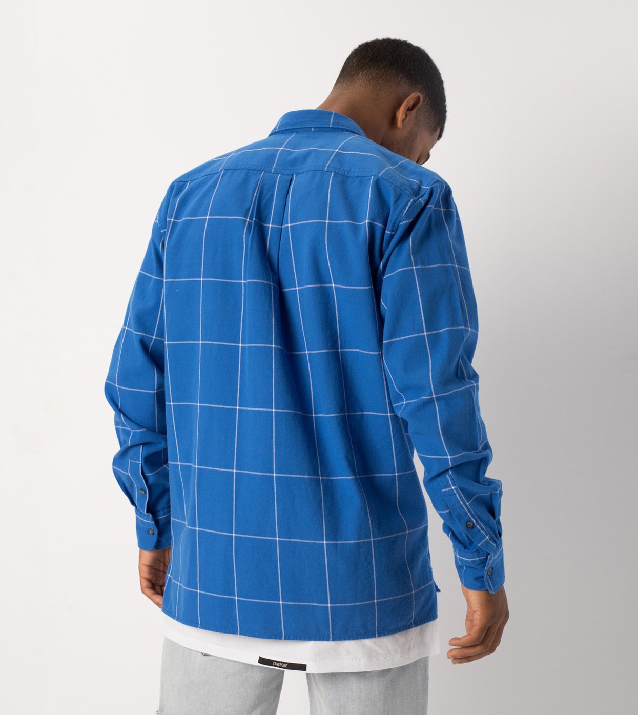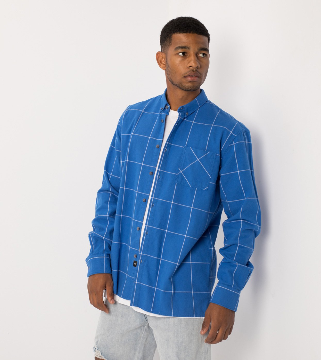 The ZANEROBE Align LS Shirt Cobalt/White - Boxy fit flannel shirt, long sleeves, classic button-down collar made from 100% cotton. We wear with Joe Blow Denim Shorts.