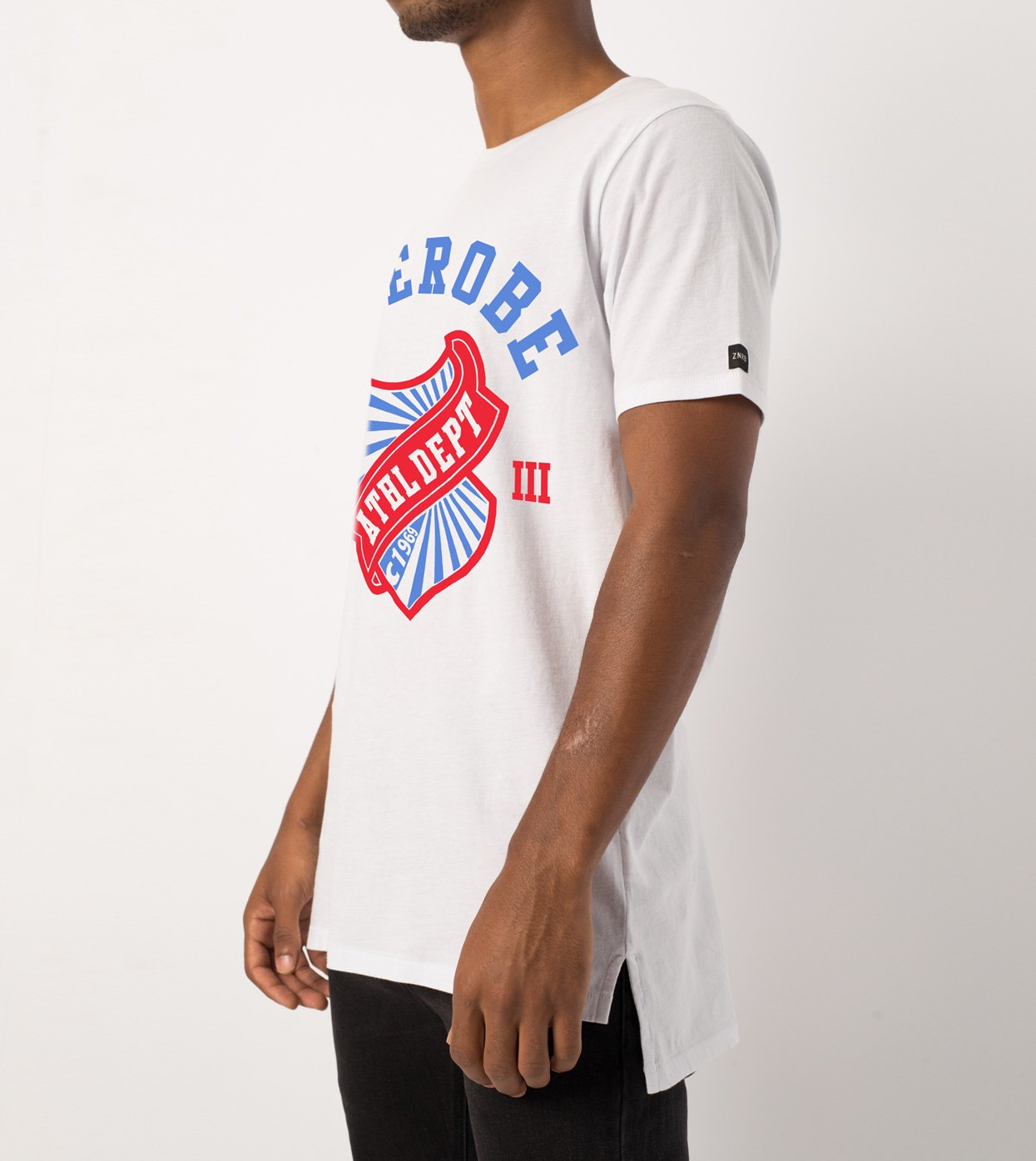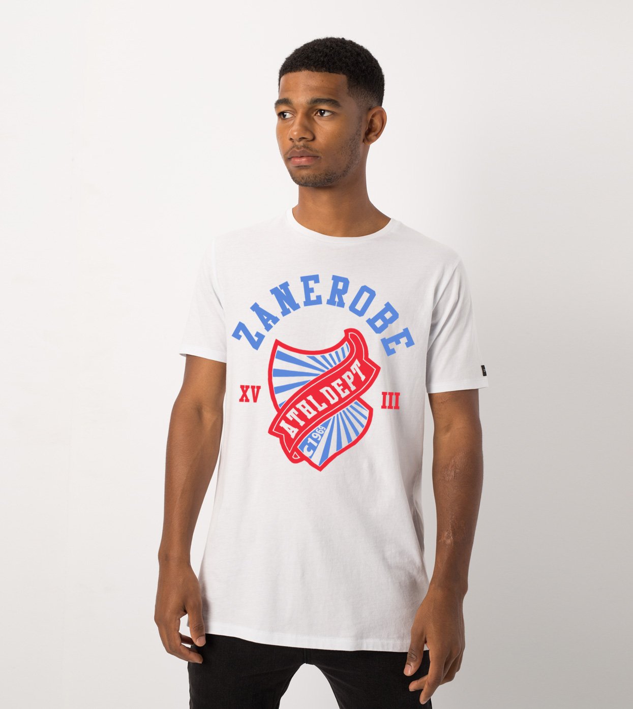 The ZANEROBE Athletic Dept Flintlock Tee in White - Limited Edition 15th Anniversary, online exclusive. Limited Quantity. Constructed in midweight 100% cotton jersey, exclusive heritage print, slightly elongated length, stepped hem and side split details. We wear with our signature Sureshot Joggers. Please note the back length is 83 cm on a size medium and this varies by 1 cm per size.