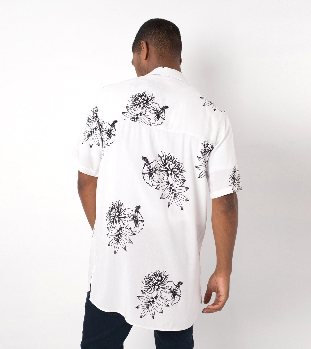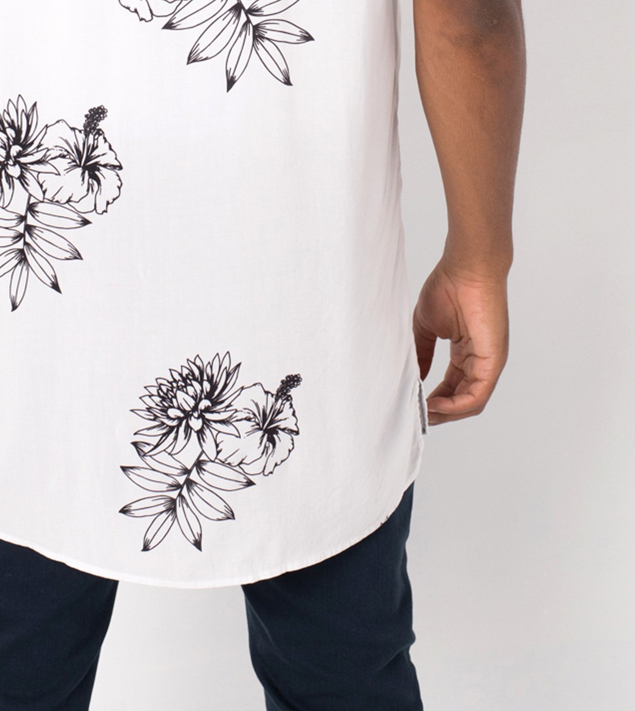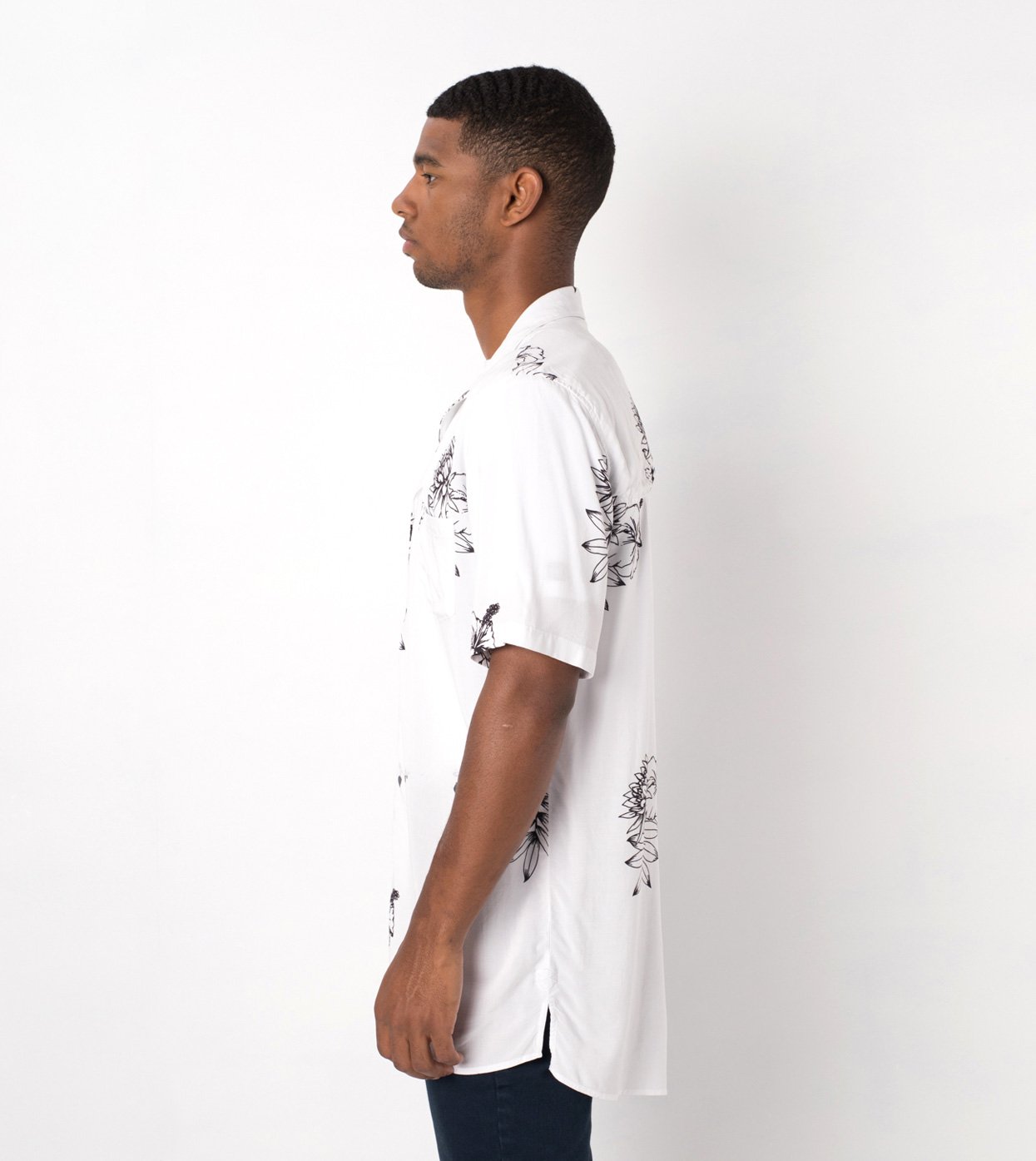 The ZANEROBE Banksia SS Shirt in White - yardage print, chest pocket, regular fit, stepped hem and side split details. Wear with the Zephyr Shorts or ZANEROBE Joe Blow Jeans.