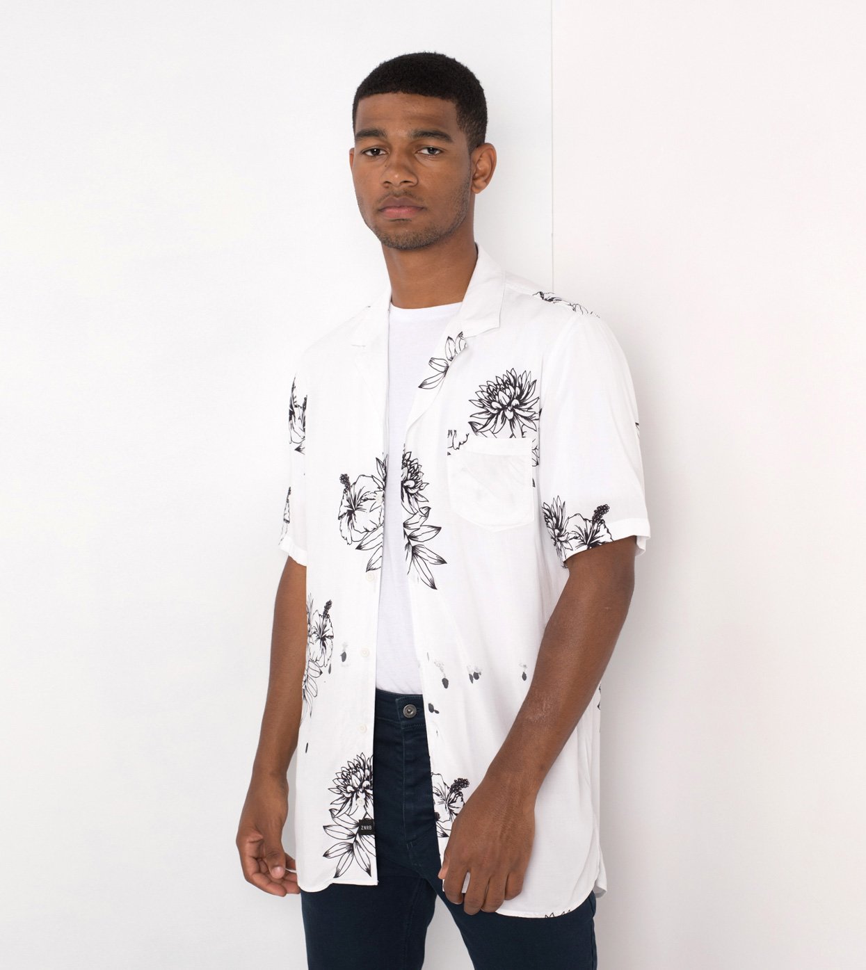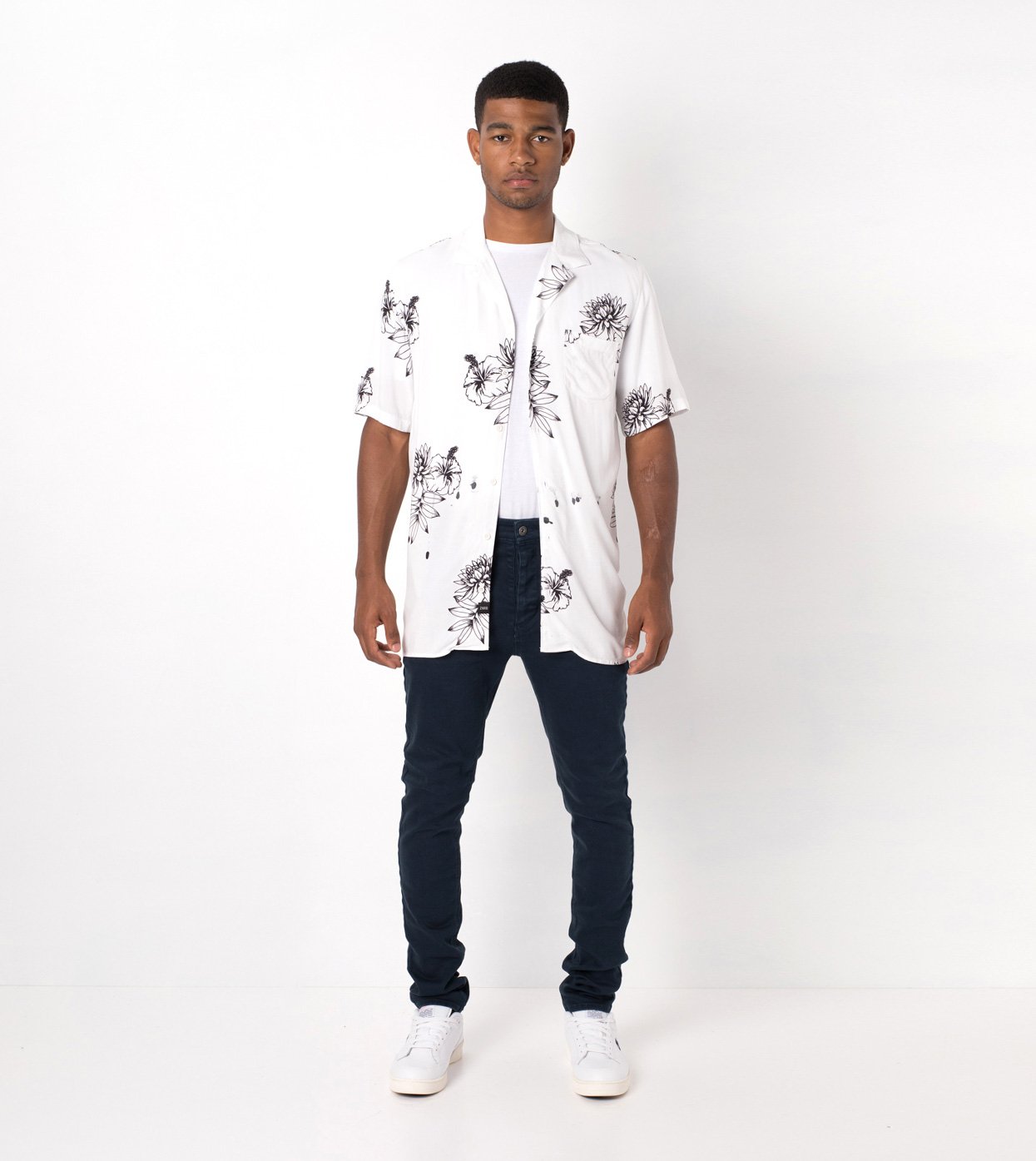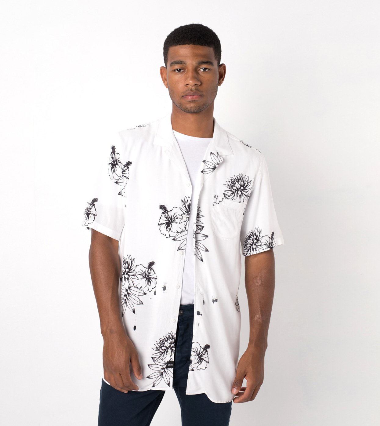 The ZANEROBE Banksia SS Shirt in White - yardage print, chest pocket, regular fit, stepped hem and side split details. Wear with the Zephyr Shorts or ZANEROBE Joe Blow Jeans.