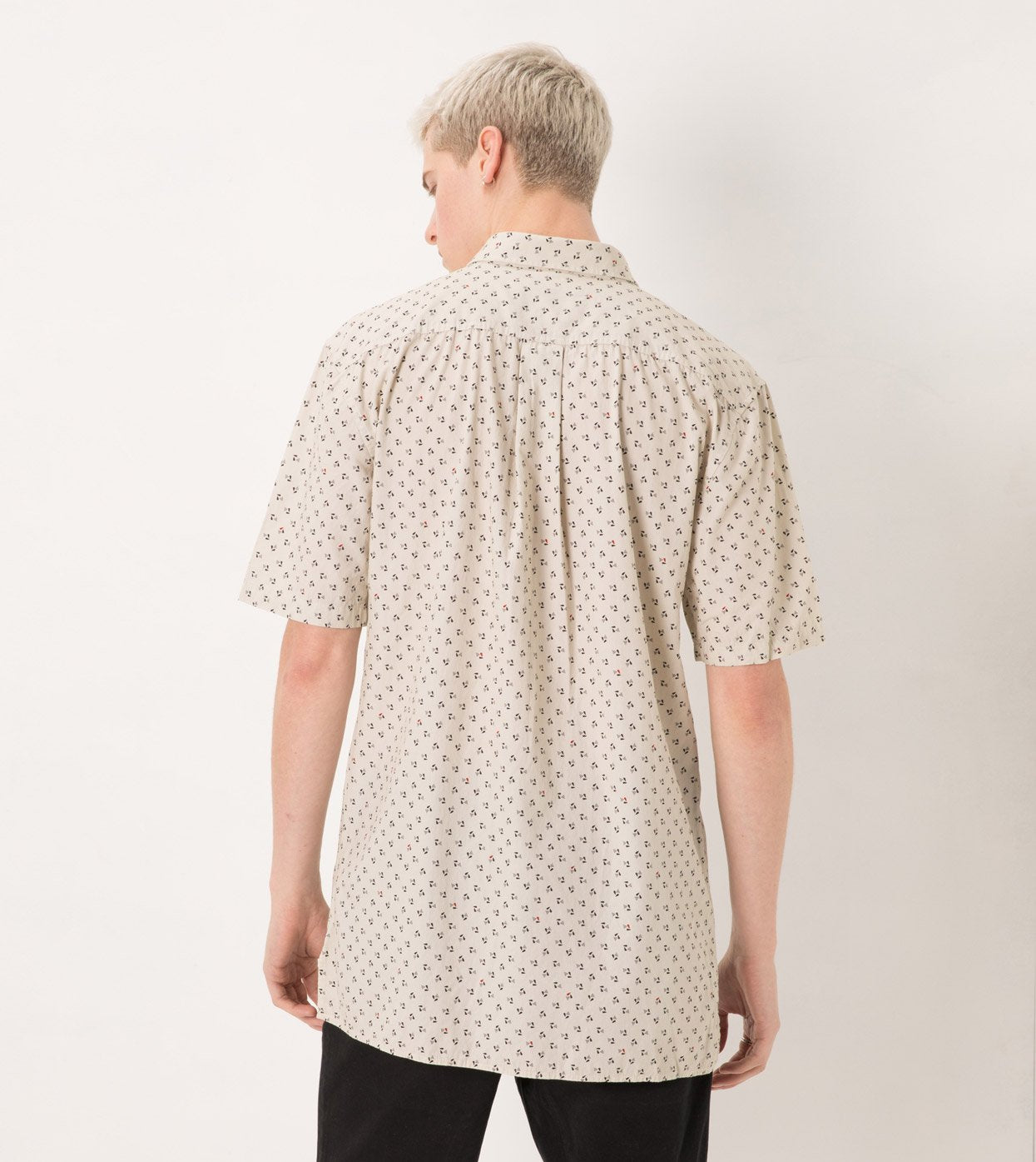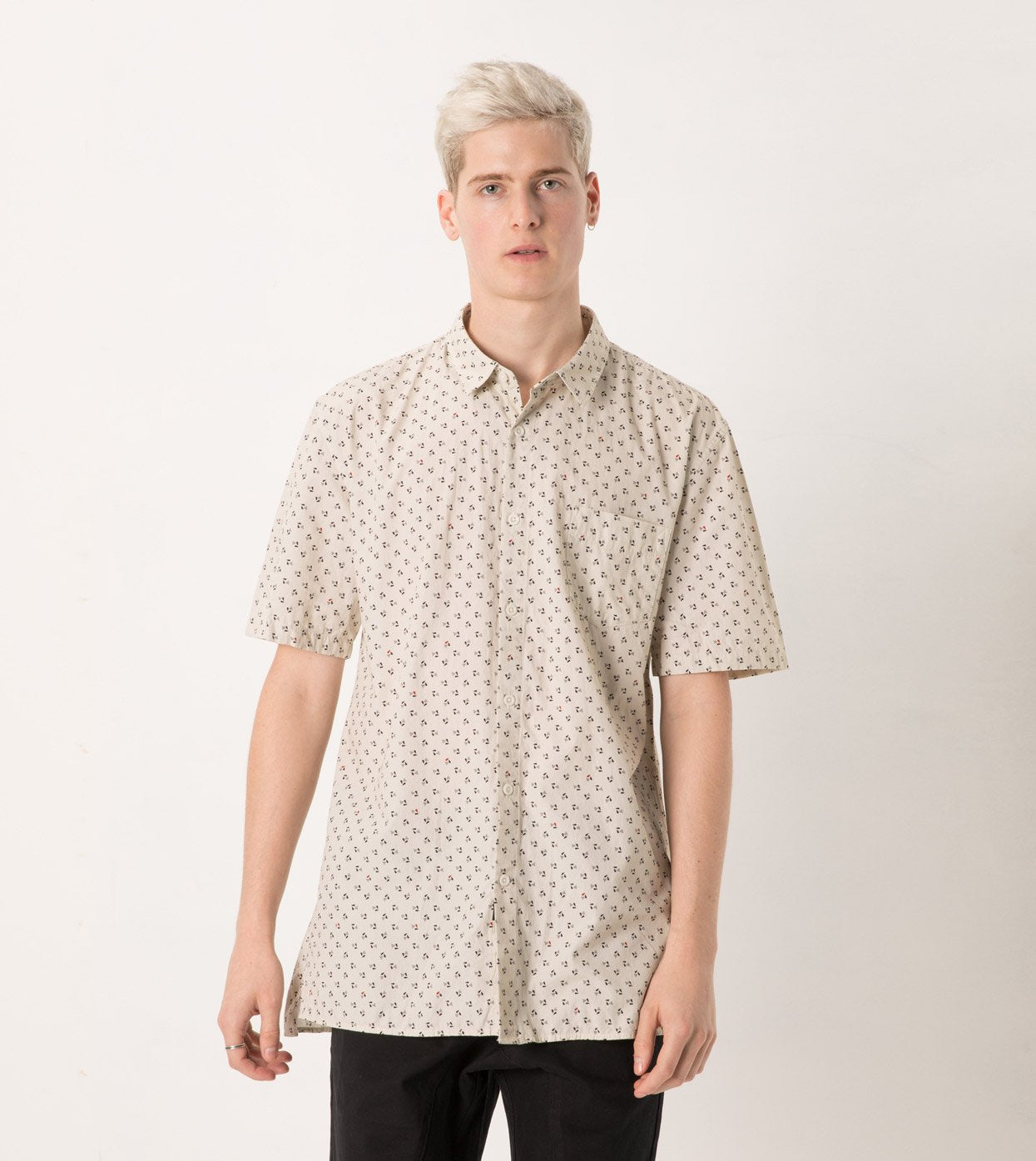 The ZANEROBE Bass SS Shirt in Natural - yardage print, standard collar, chest pocket, boxy fit, stepped hem and side split details. Wear with our classic Sureshot Shorts.