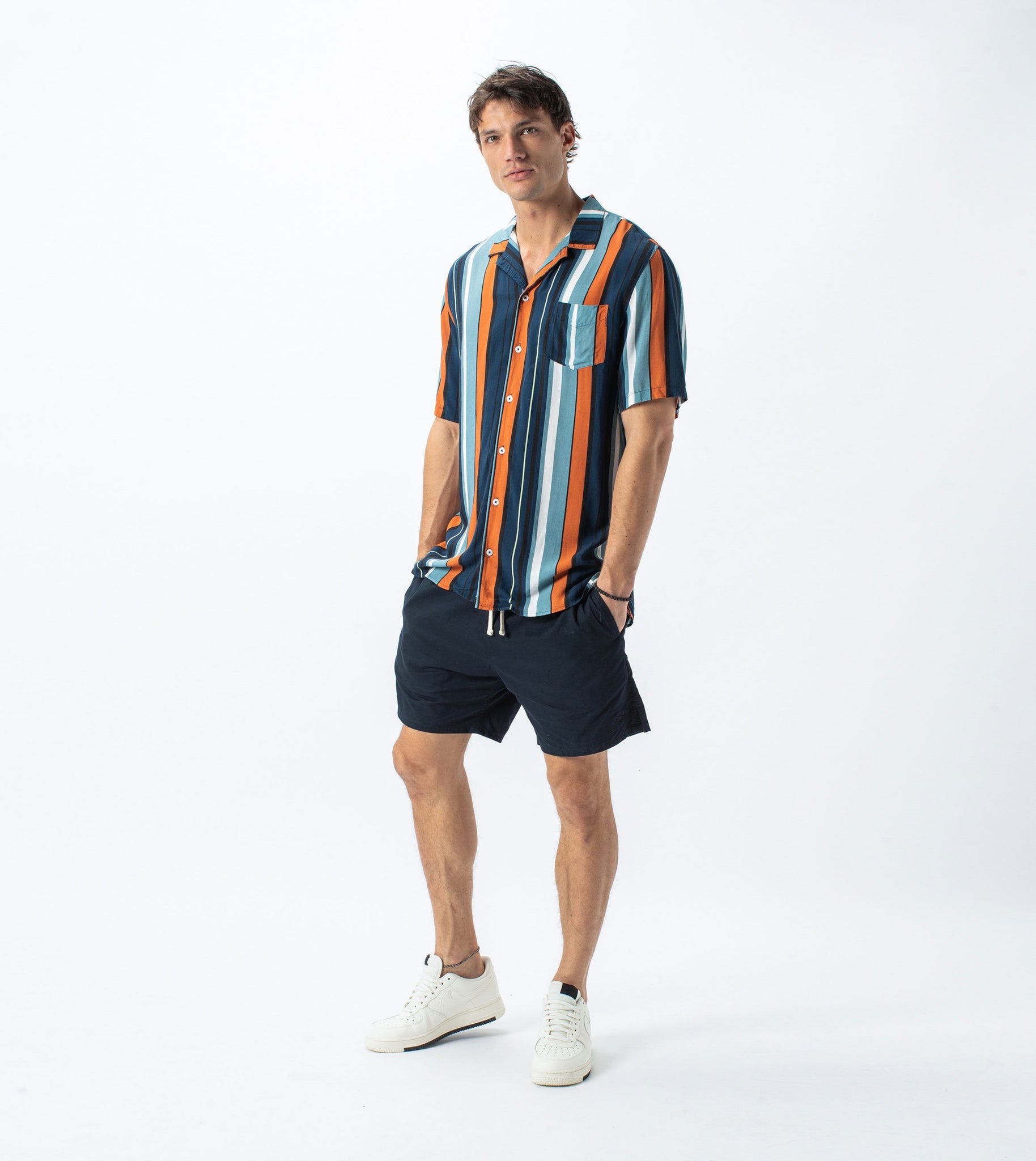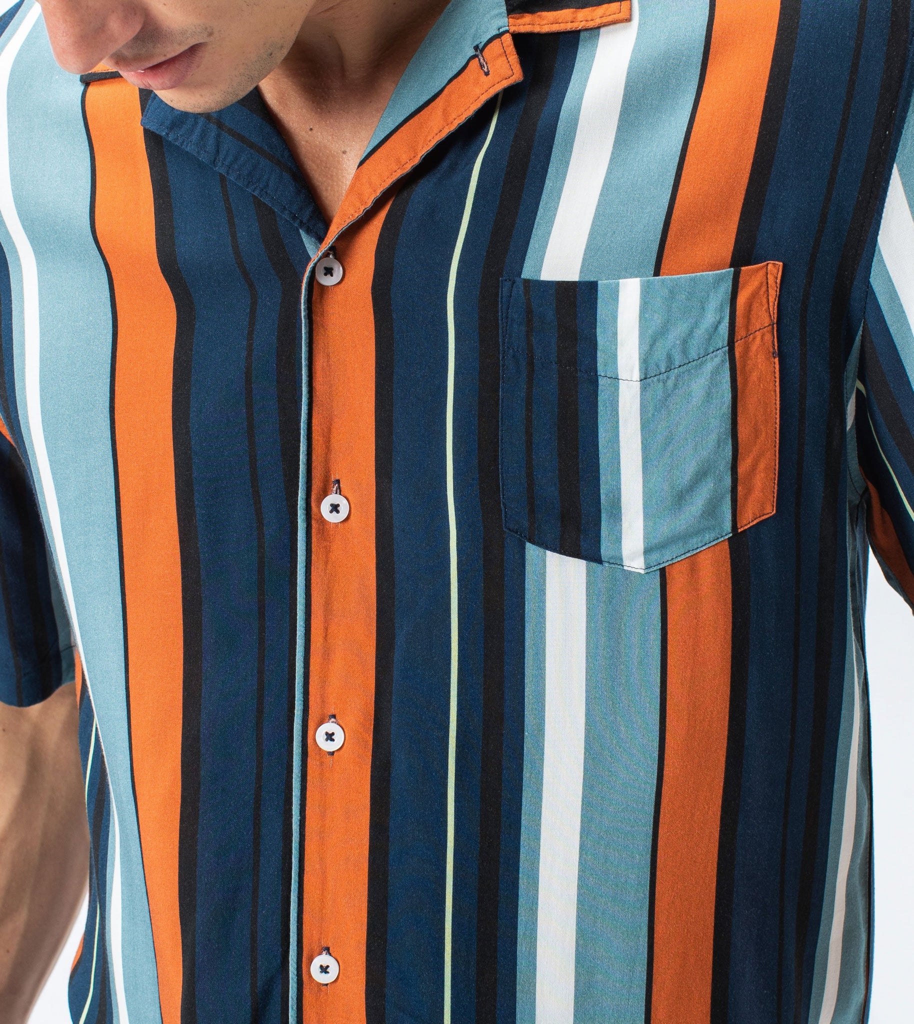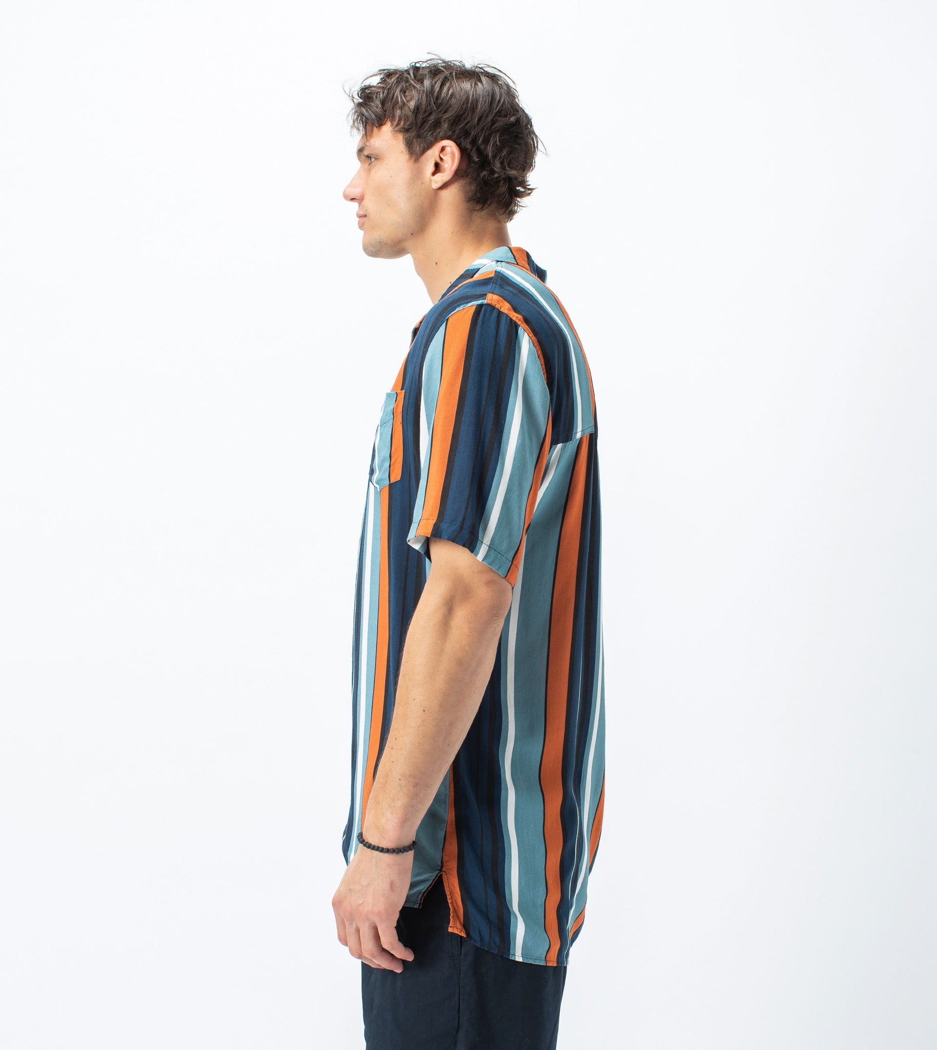 The ZANEROBE Bel Air Stripe SS Shirt in Ocean/Clay - Boxy fit, constructed in soft 100% rayon fabrication, multi-stripe print, dual functioning collar, elongated back length, signature side split hem, chest pocket, concealed placket label, marble buttons, embroidered logo. Featured here with the ZANEROBE Zephyr Shorts.