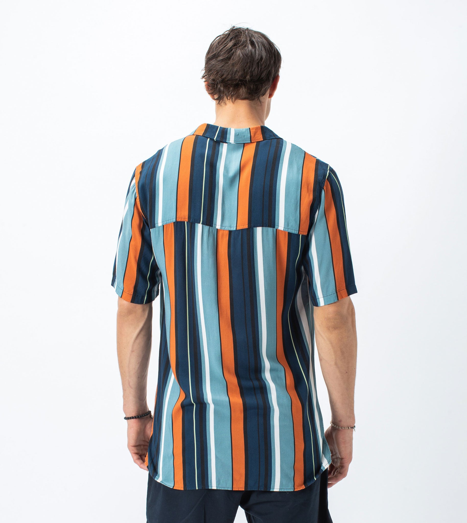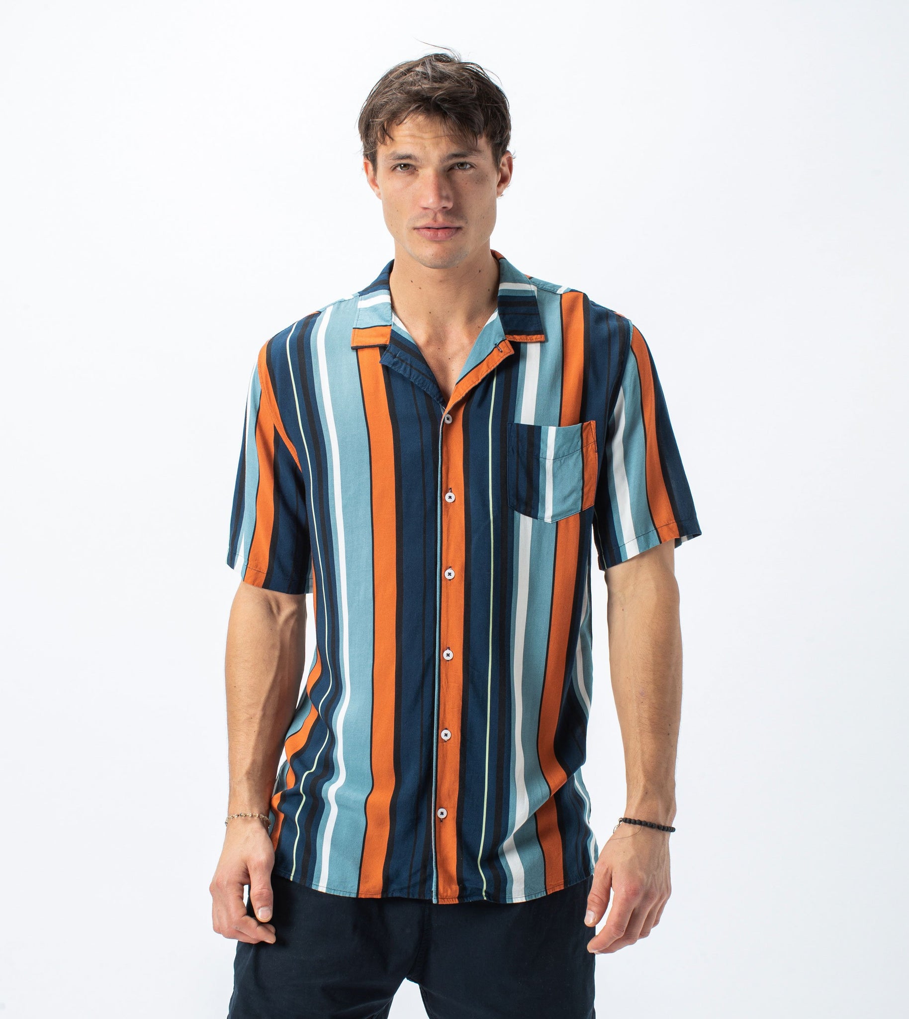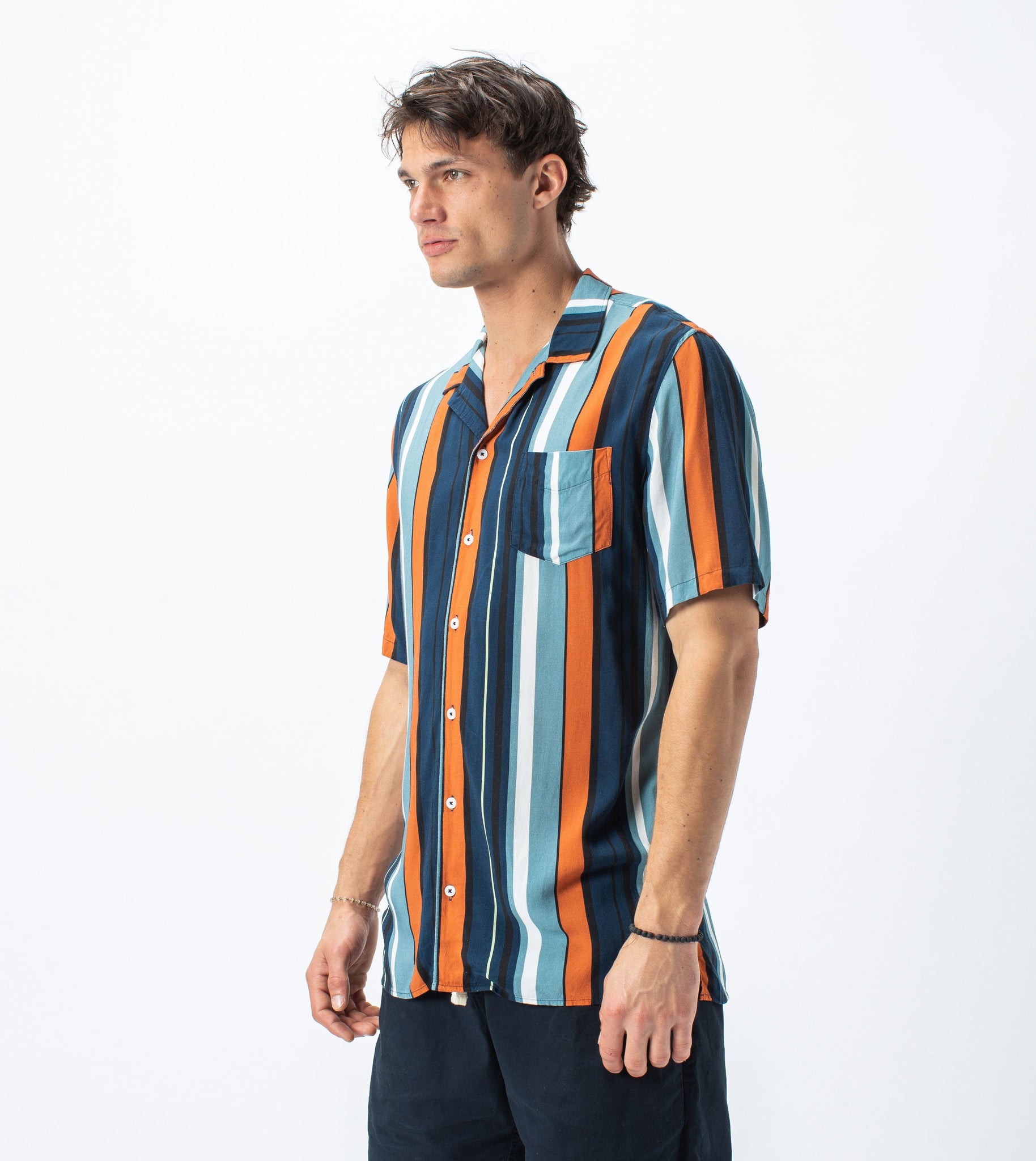 The ZANEROBE Bel Air Stripe SS Shirt in Ocean/Clay - Boxy fit, constructed in soft 100% rayon fabrication, multi-stripe print, dual functioning collar, elongated back length, signature side split hem, chest pocket, concealed placket label, marble buttons, embroidered logo. Featured here with the ZANEROBE Zephyr Shorts.