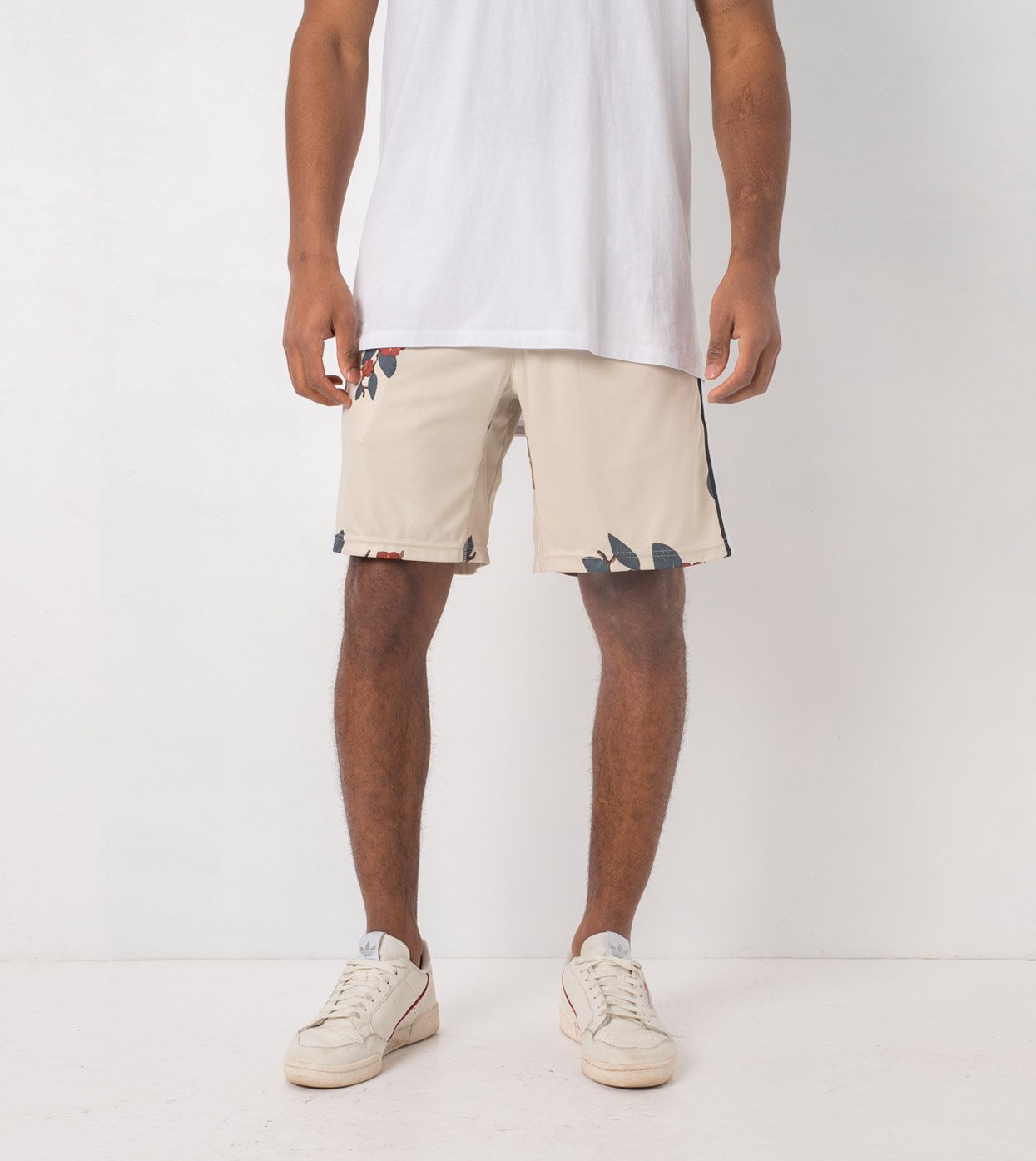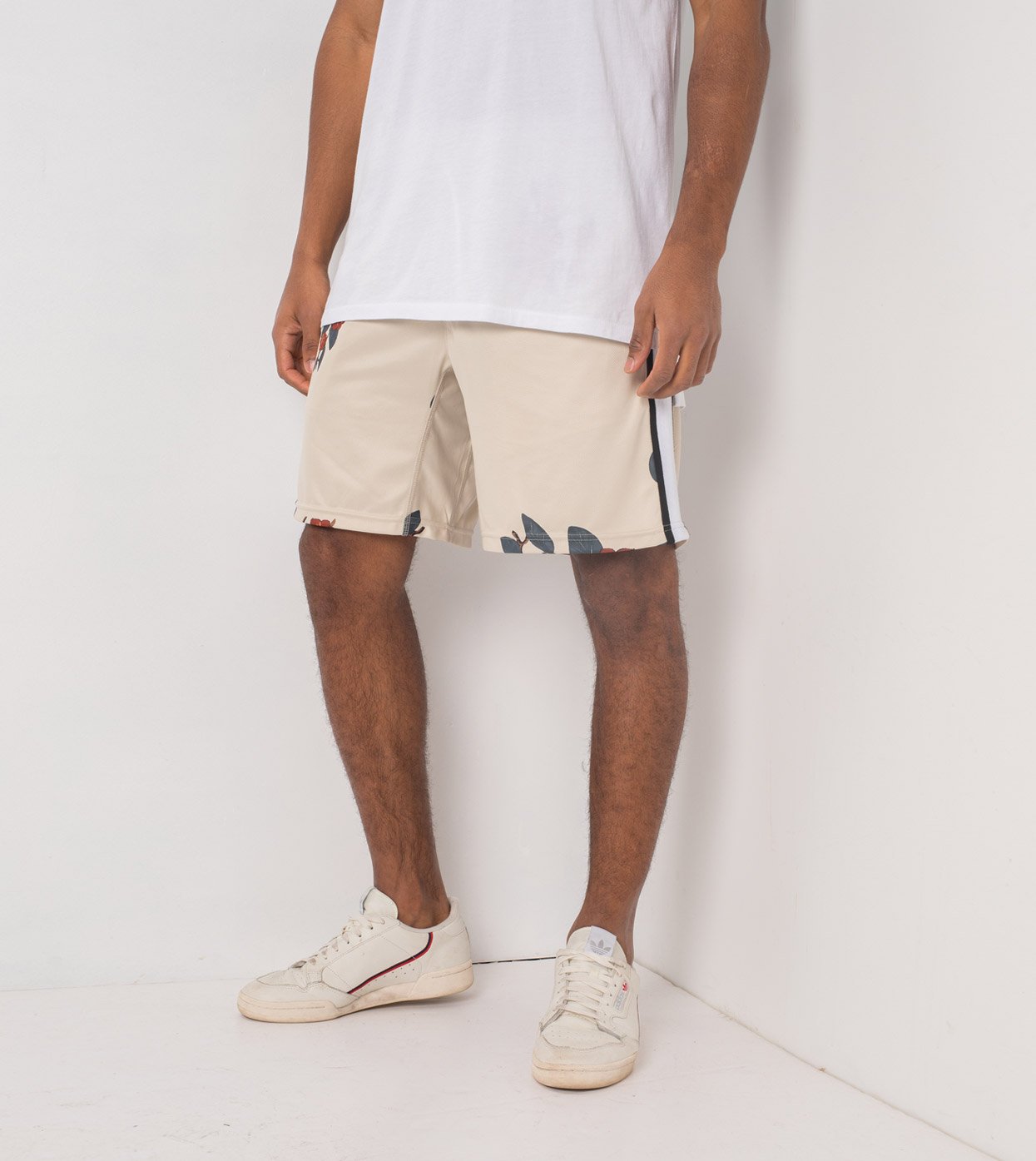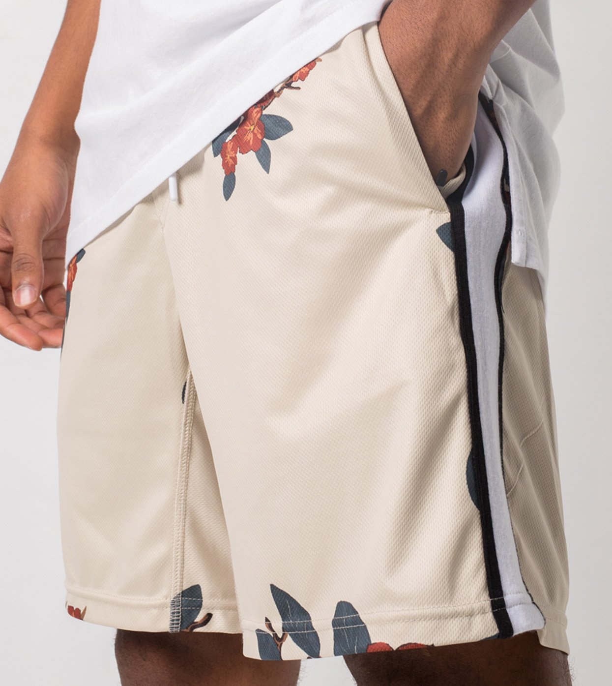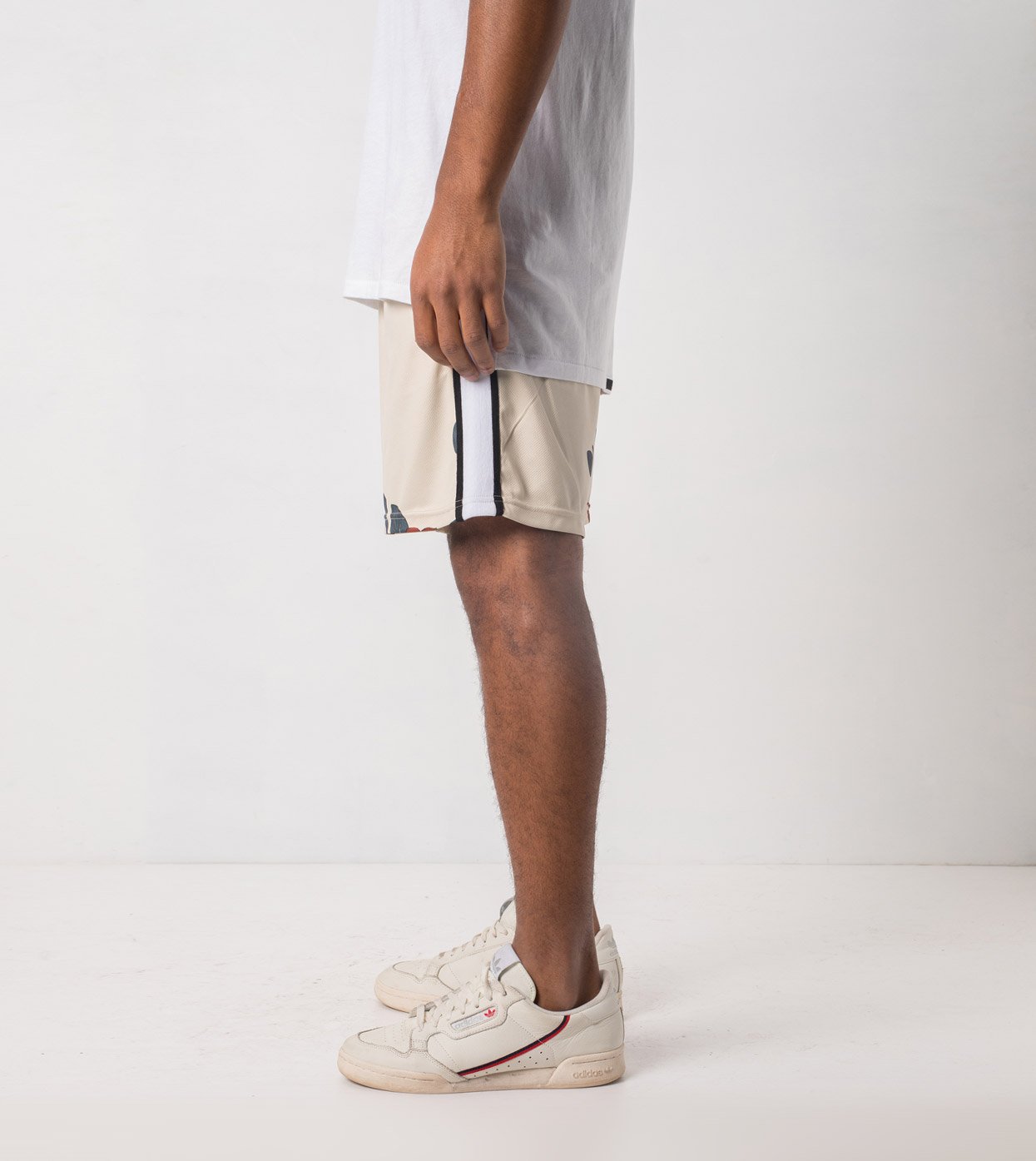 The ZANEROBE Bloom Sideline Short in Natural - polyester mesh fabric, relaxed fit, concealed auto lock zip side pockets, side stripe tape detail, shield embroidered applique patch, drawstring waist and sporty tech trims. We wear with signature ZANEROBE Flintlock Tee and Denim Jacket.