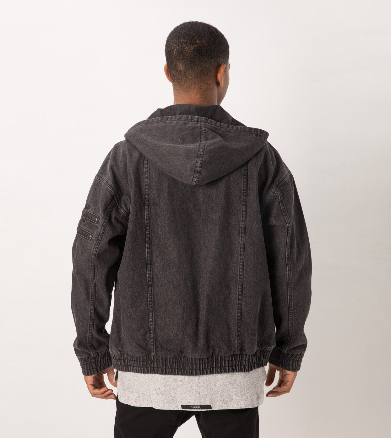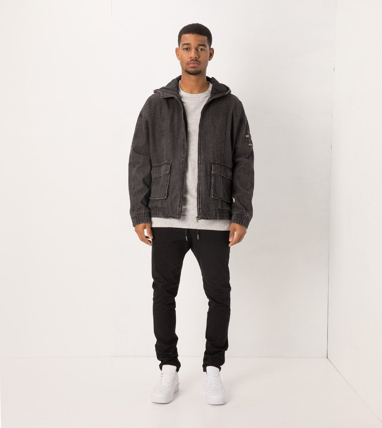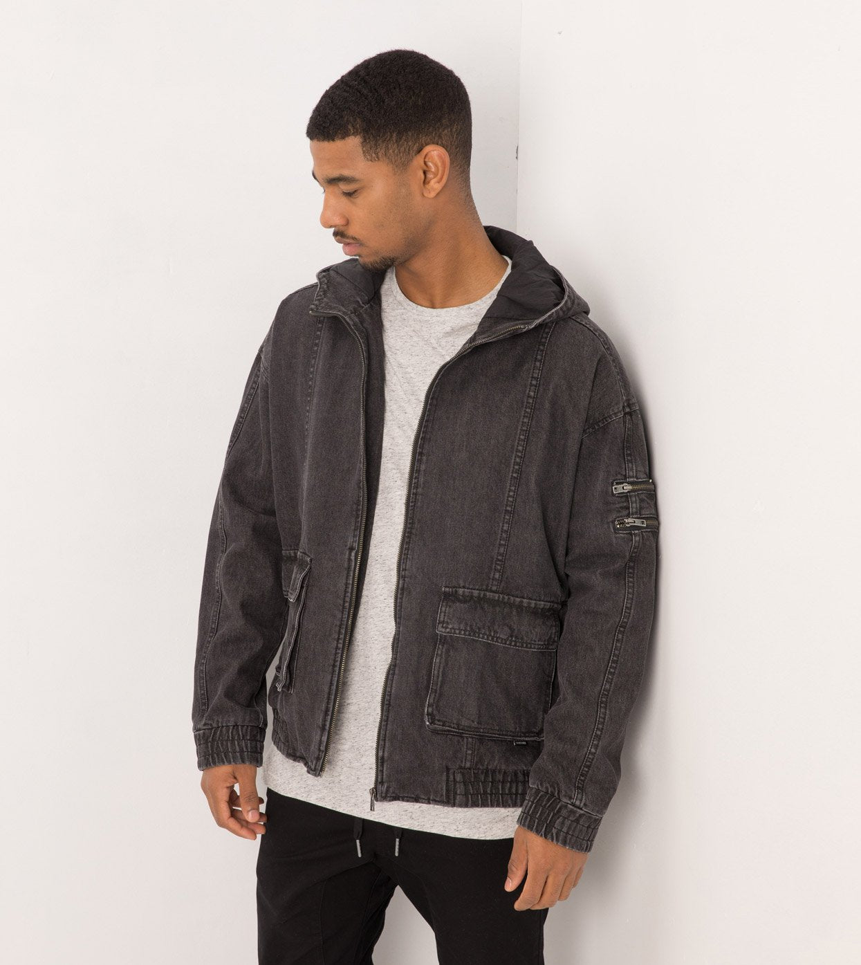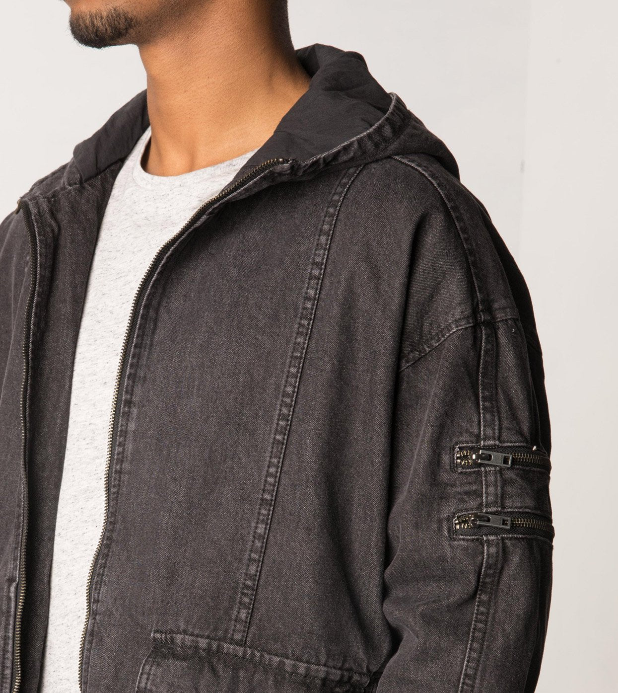 The ZANEROBE Box Denim Jacket in Black - boxy fit, oversized, hooded denim jacket, elastic cuffs and hem, zip closure, dual zip sleeve pockets, dual patch pockets, constructed from 100% cotton. We wear with our classic Salerno Chinos.