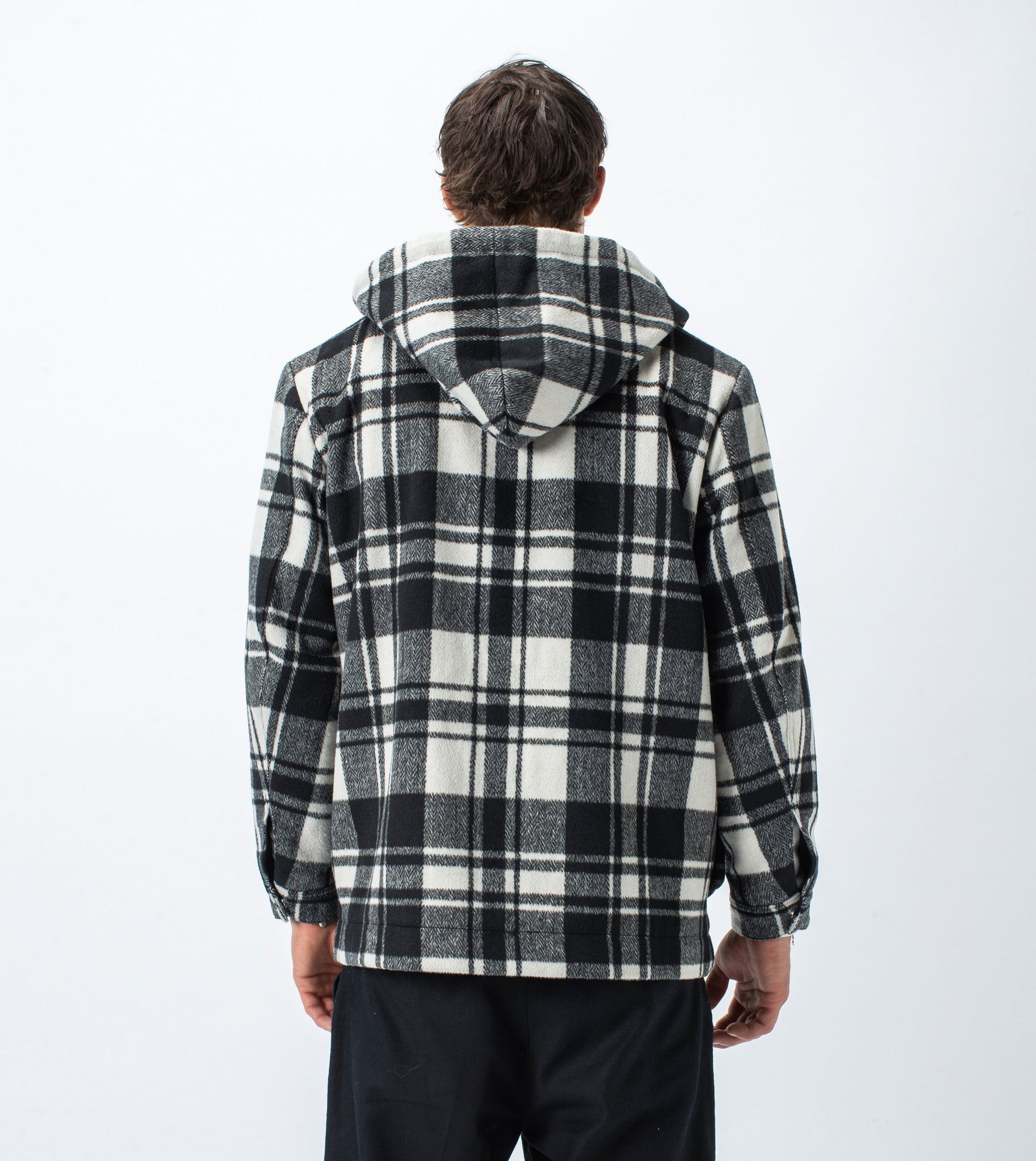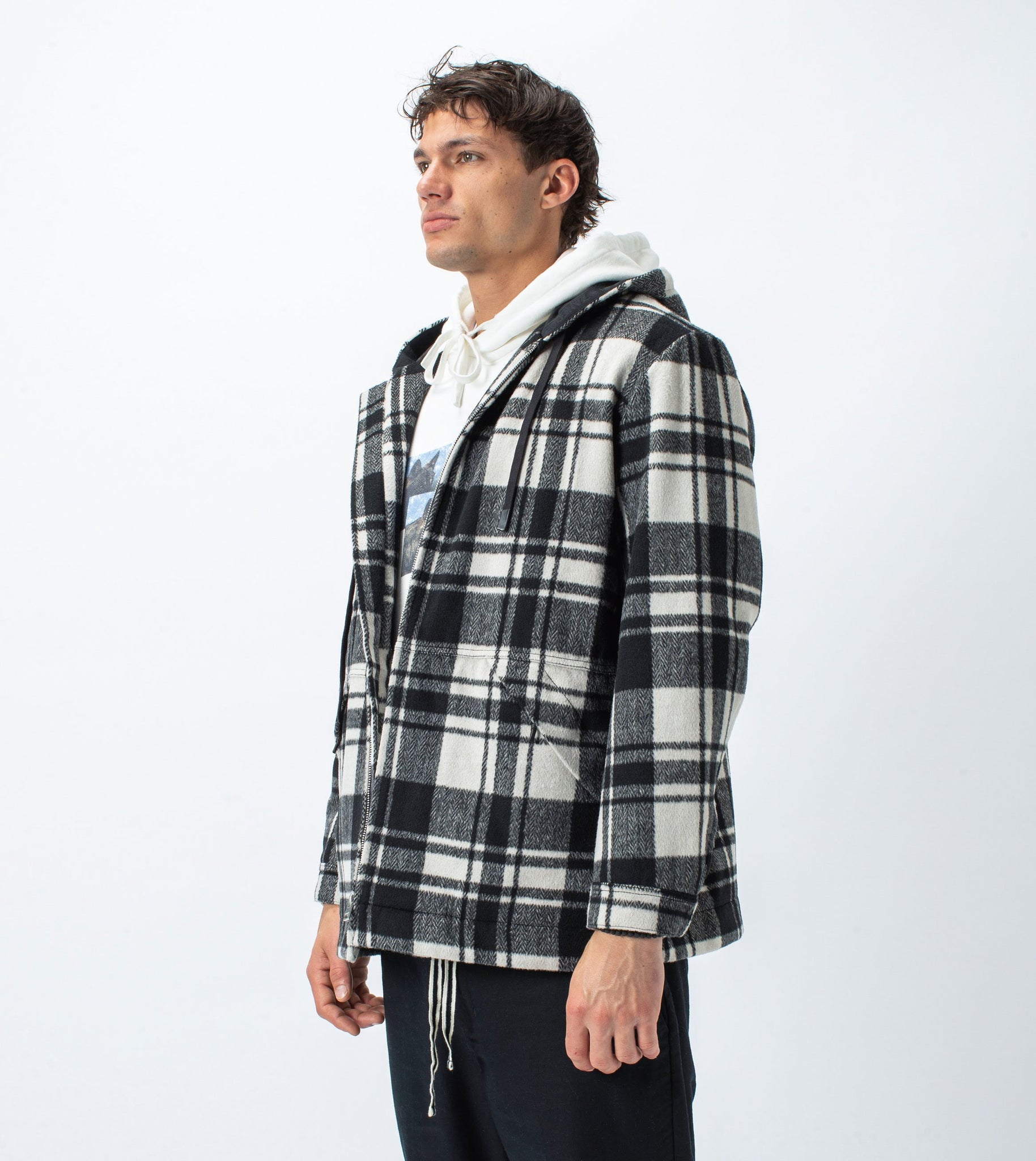 The ZANEROBE Case Plaid in Black/White - relaxed fit, constructed from thick cotton twill, ZANEROBE branded internal hood taping, wool blend fabric with a brushed viscose lining, rubber dipped drawcords, internal chest pocket, concealed zip side pockets and signature side splits. We style with the ZANEROBE Rugger Hood Sweat and Jumpa Chino.
