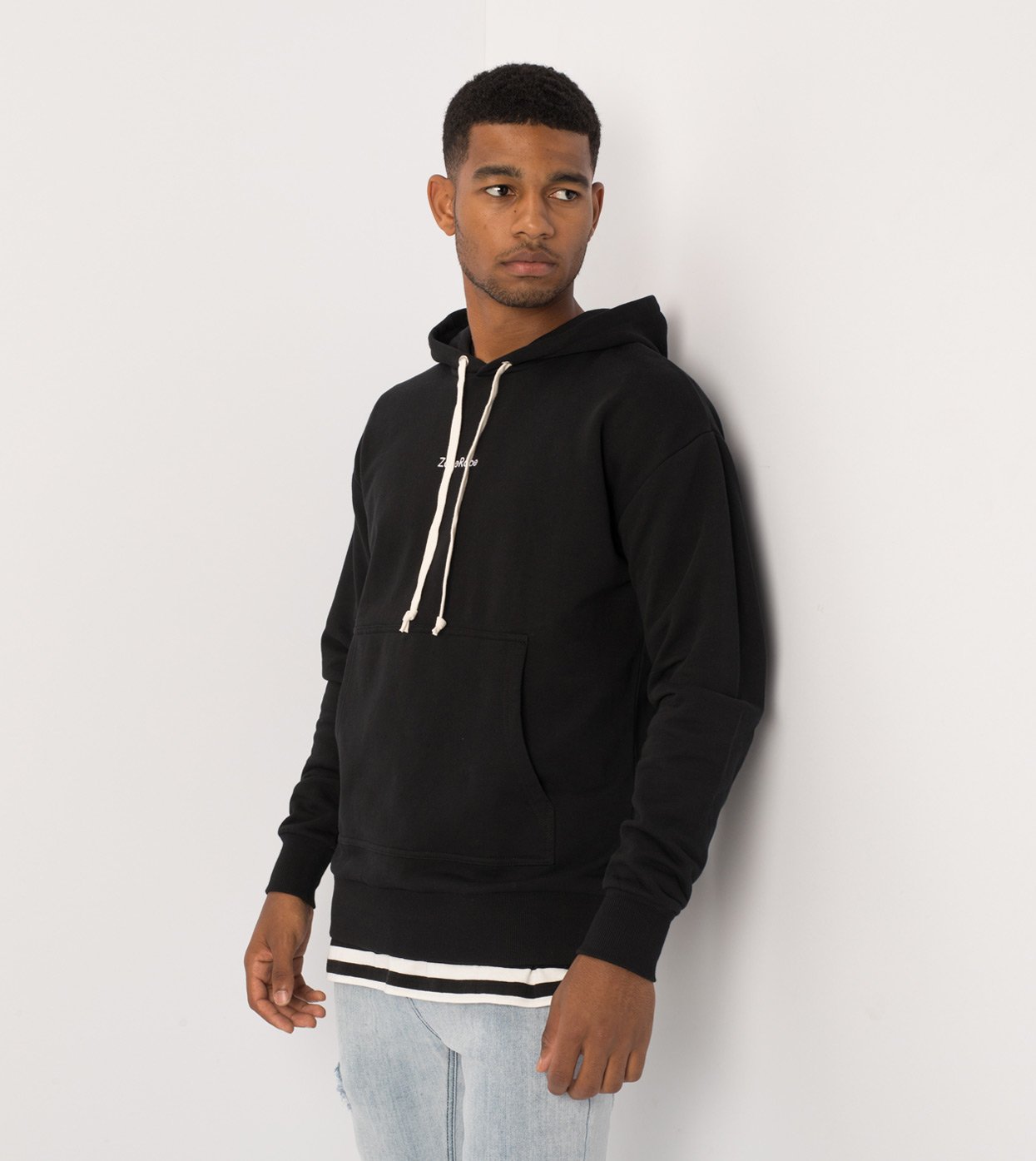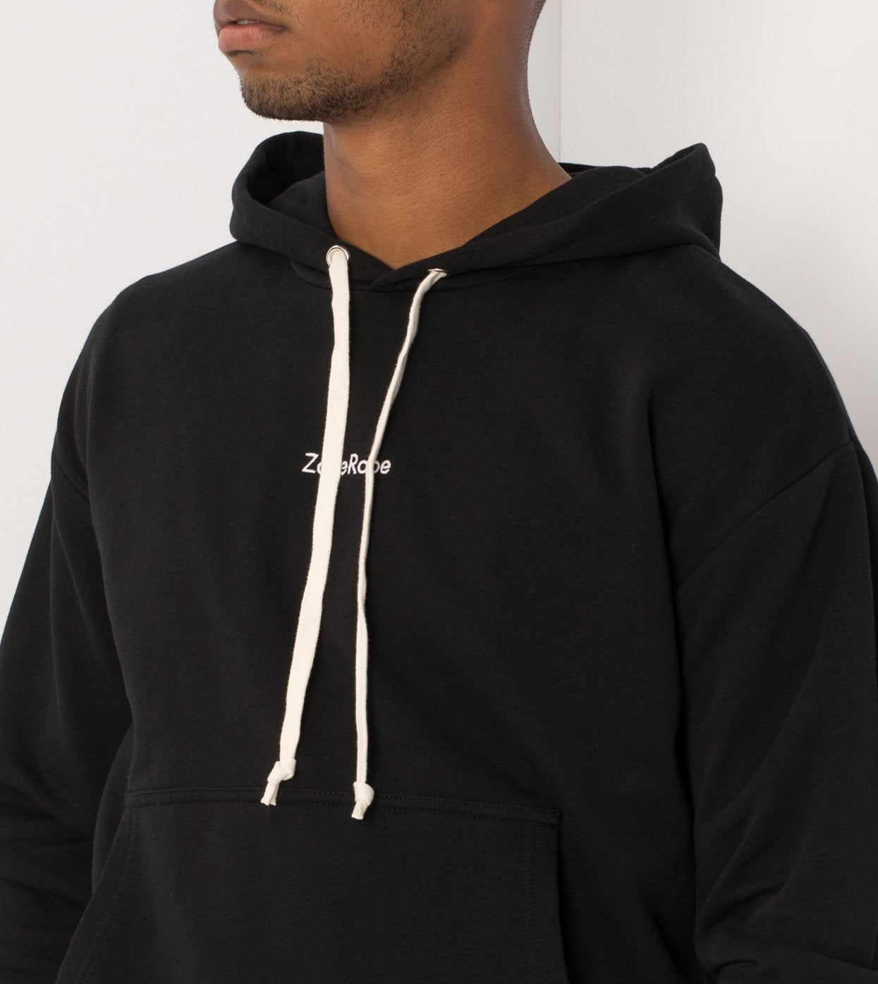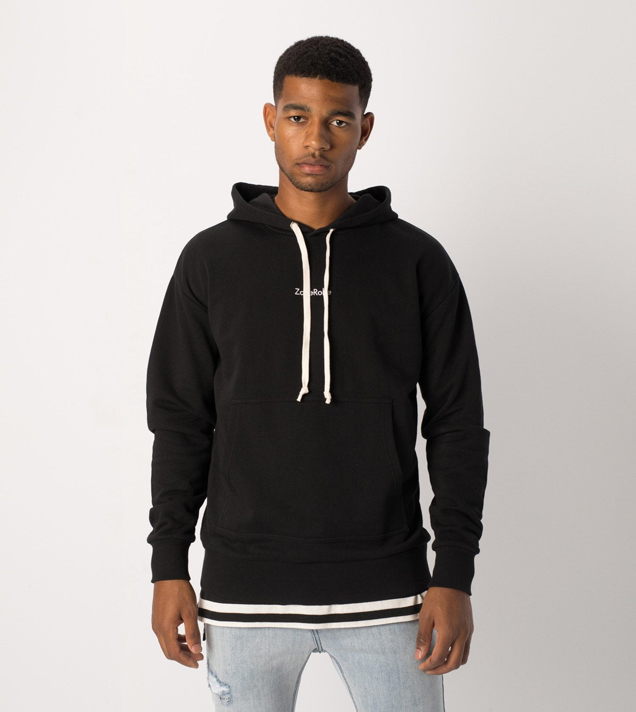 The ZANEROBE Case Rugger Hood Sweat in Black - Double faced hood, 100% cotton French Terry construction, forward side seams, aluminium eyelets, custom developed drawcords, concealed pouch pocket with micro-fire lining, ribbed cuffs and hems, embroidered chest logo. We wear with our distressed Joe Blow Jeans.