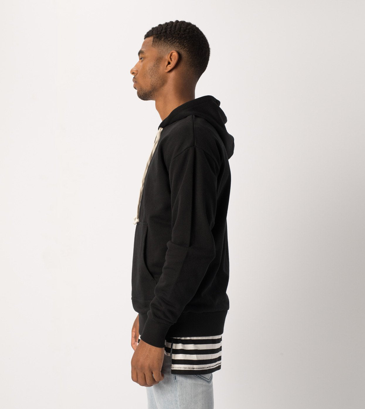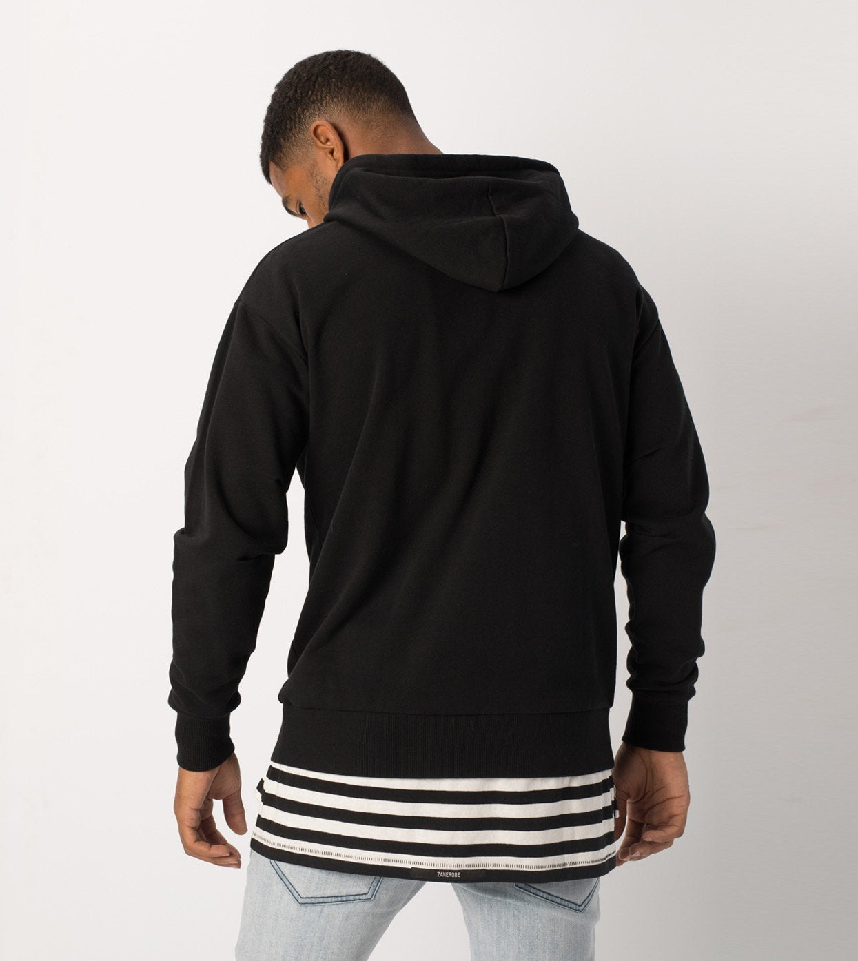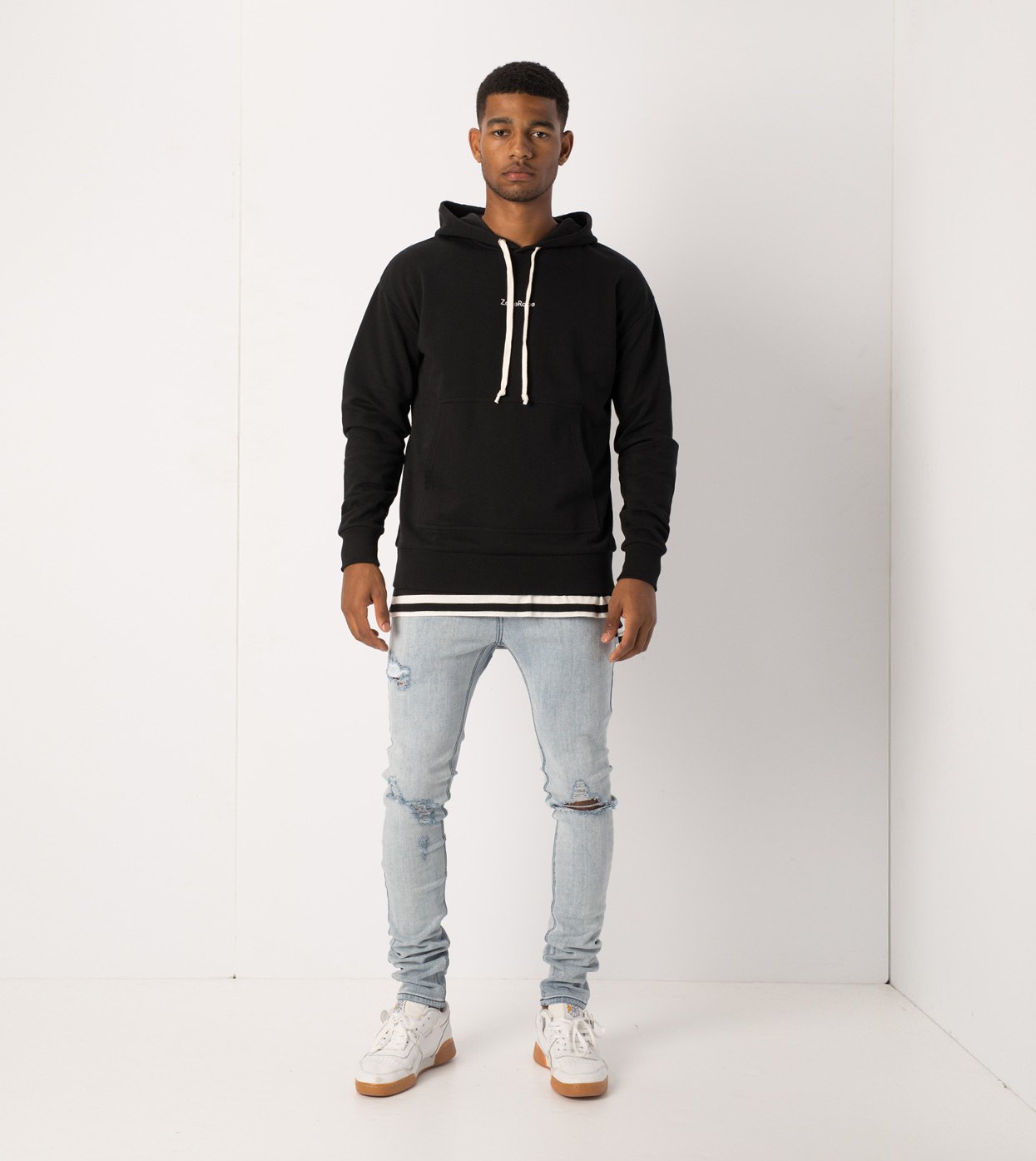 The ZANEROBE Case Rugger Hood Sweat in Black - Double faced hood, 100% cotton French Terry construction, forward side seams, aluminium eyelets, custom developed drawcords, concealed pouch pocket with micro-fire lining, ribbed cuffs and hems, embroidered chest logo. We wear with our distressed Joe Blow Jeans.