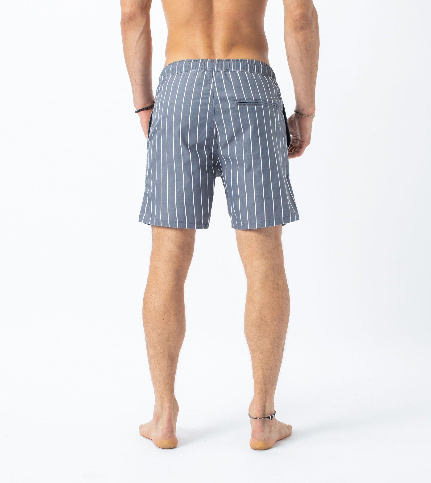 The ZANEROBE Chambray Laguna Short in Ink/Milk - Regular fit, constructed from 54% Cotton, 40% Nylon & 6% Elastane. Features vertical stripe pattern, elastic waistband, drawcord, mesh lined side pockets, back pocket with zip closure & embroidered logo detail.