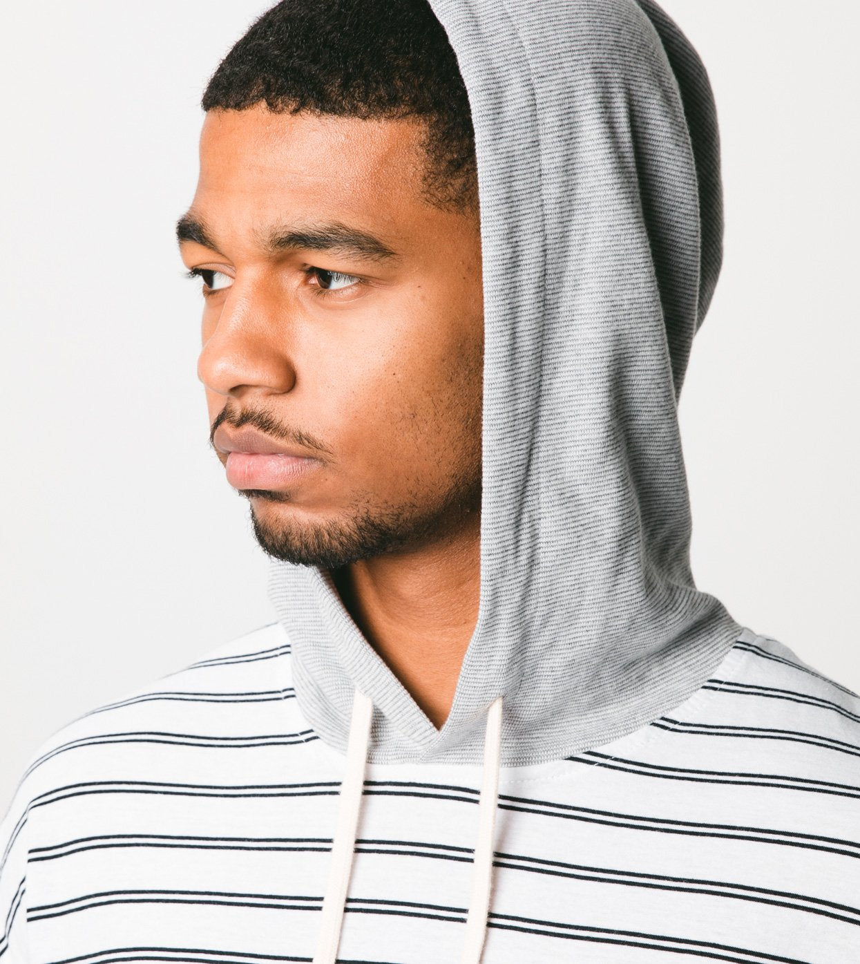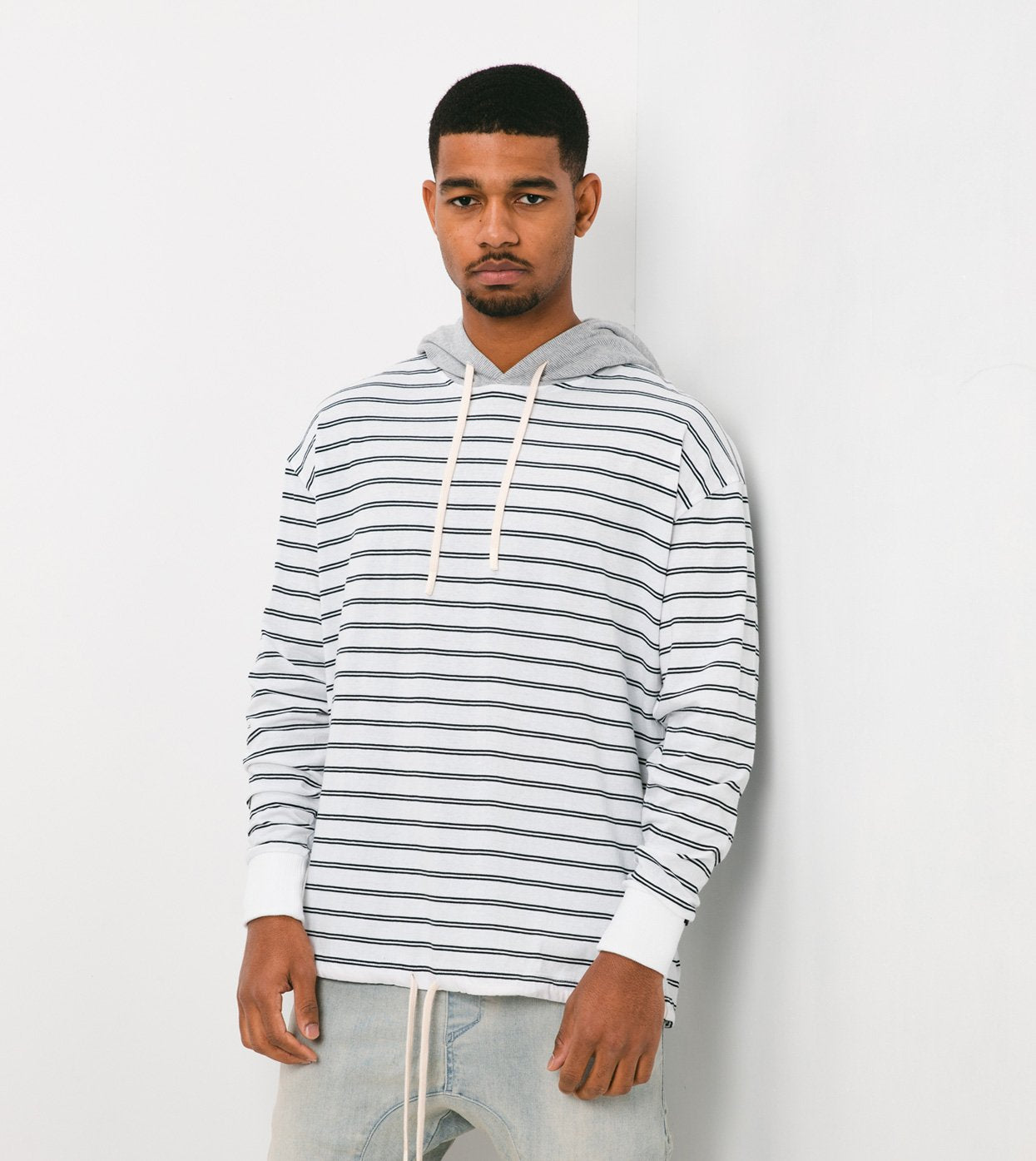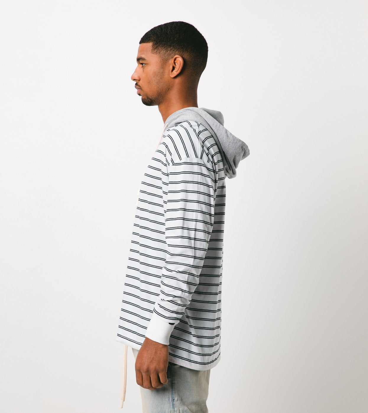 The ZANEROBE Channel Rugger Hood LS Tee in Black/White - oversized fit, drop shoulders, curved hem, forward side seams and regular length. Wear with our signature Sureshot Joggers.