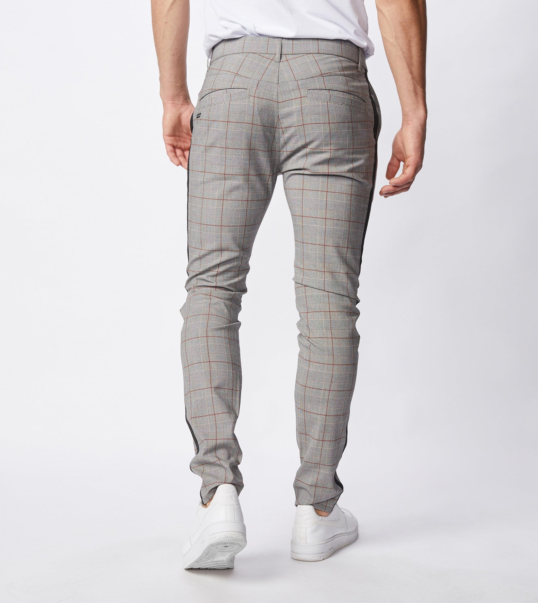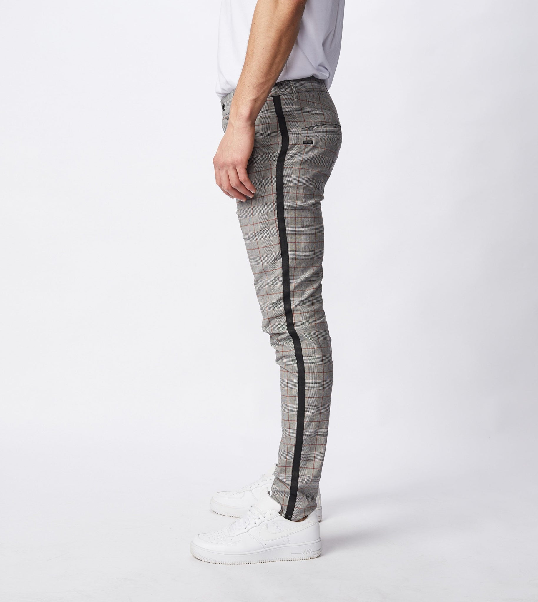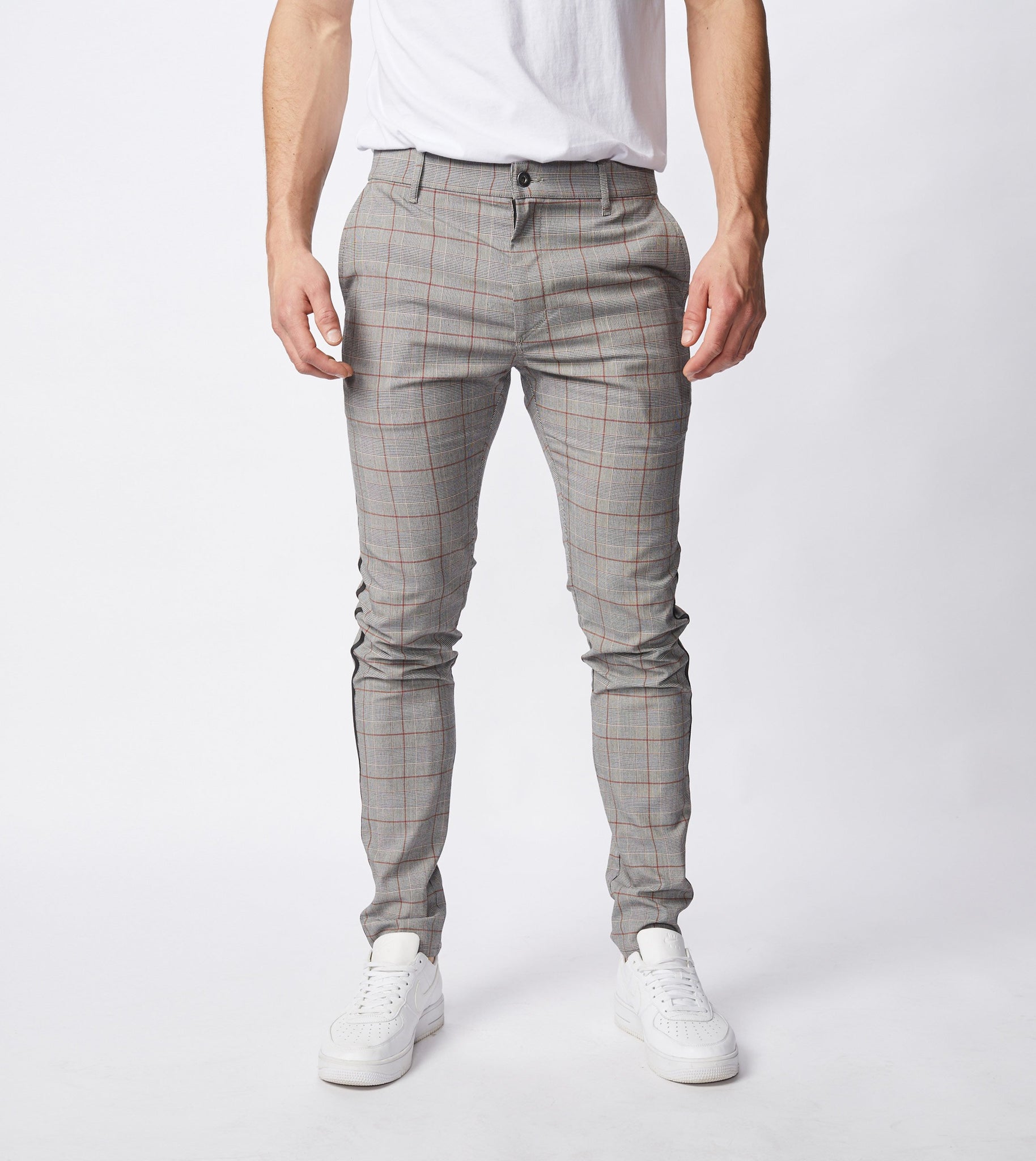 The ZANEROBE Check Sideline Snapshot Chino in Grey Check- modern chino pant featuring a skinny-tapered fit through knee & leg. Wear with a basic ZANEROBE Rugger Tee and Sweater.