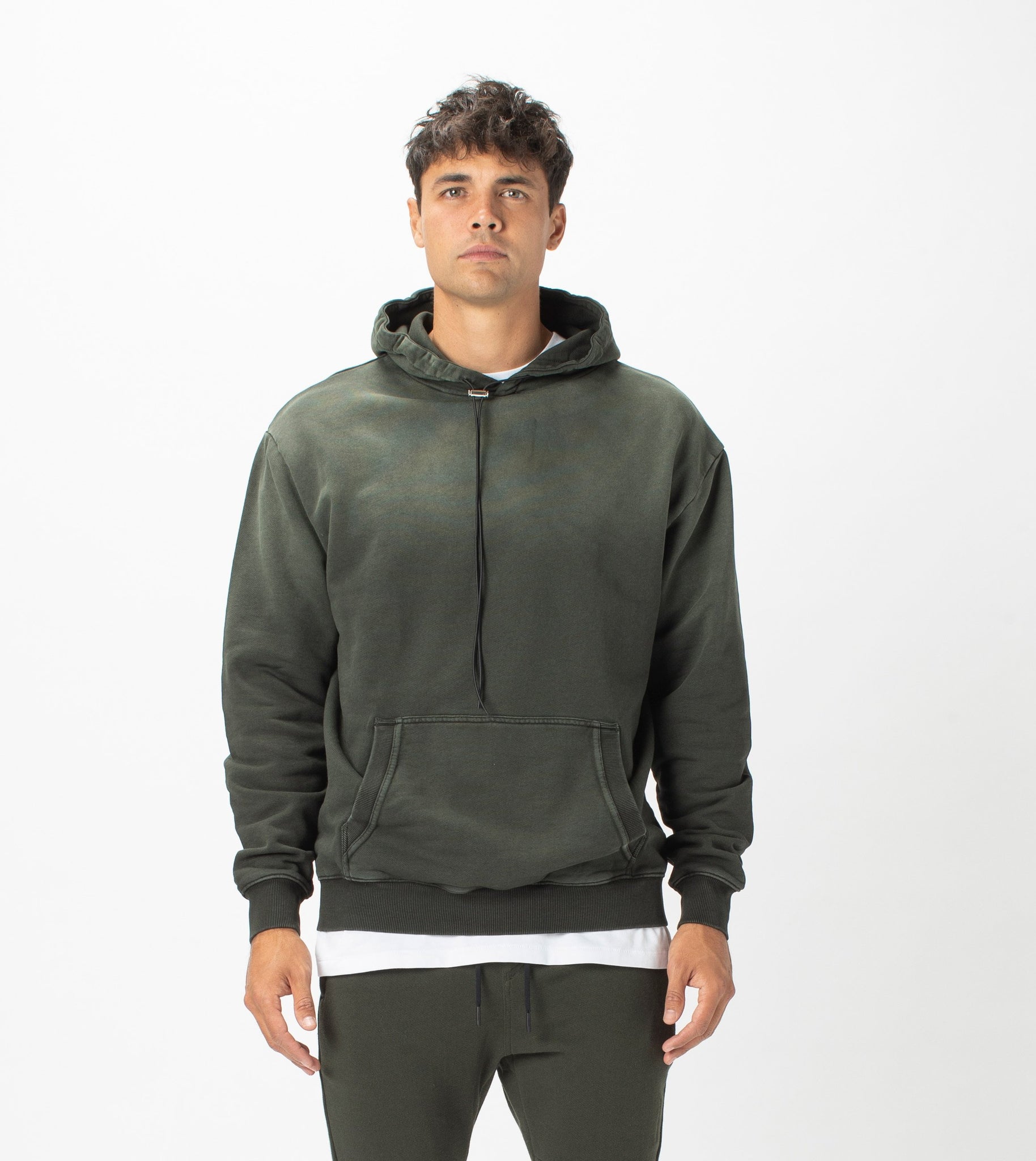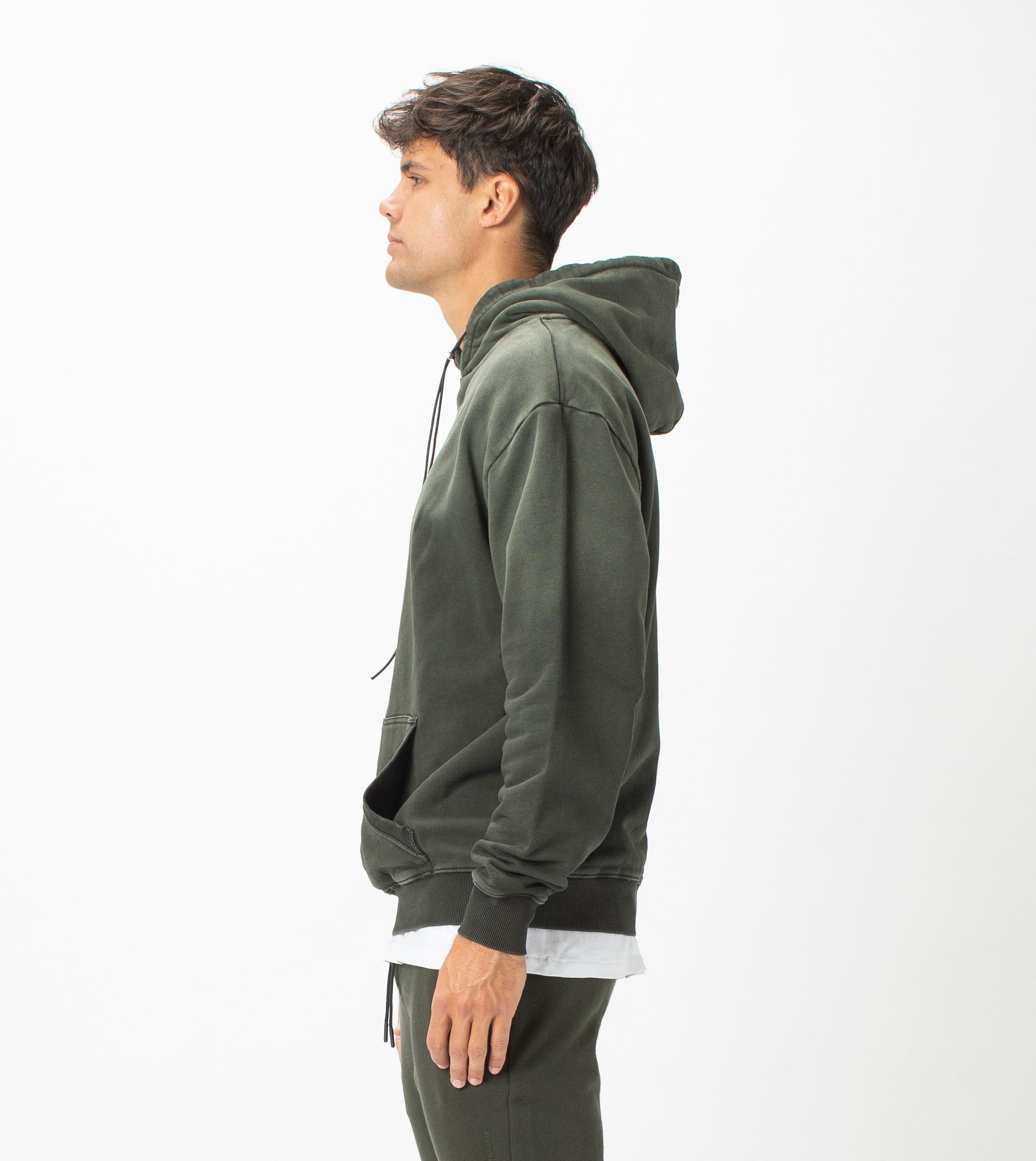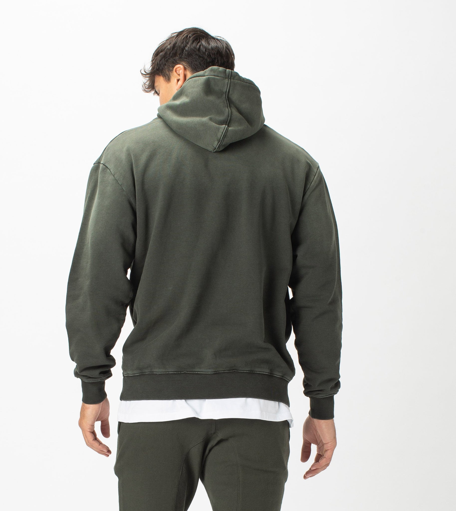 The ZANEROBE Field Hood Sweat in GD Dk Army - Oversized retro style with french terry fabrication. We wear with the matching Fleece Sureshot Joggers.