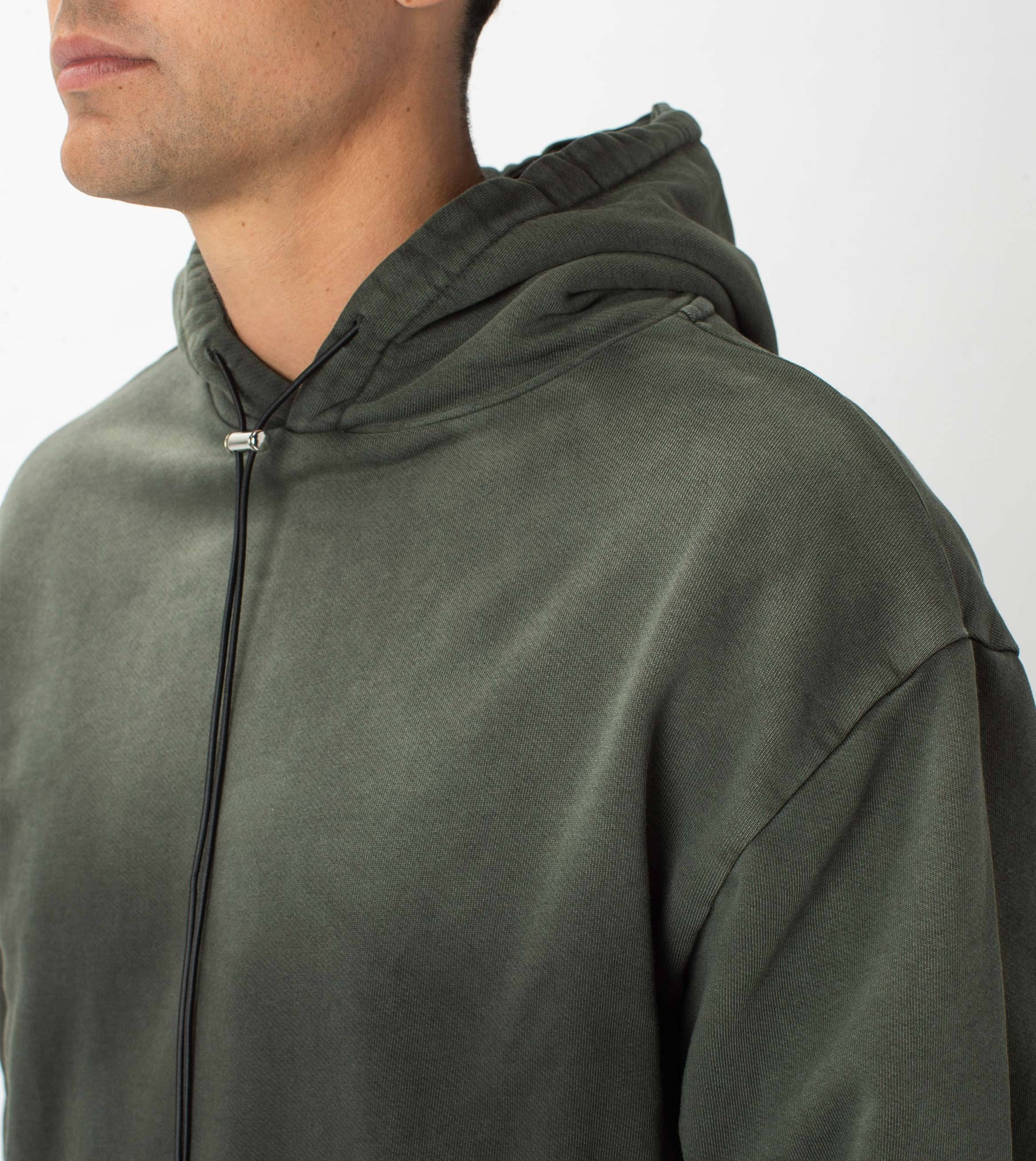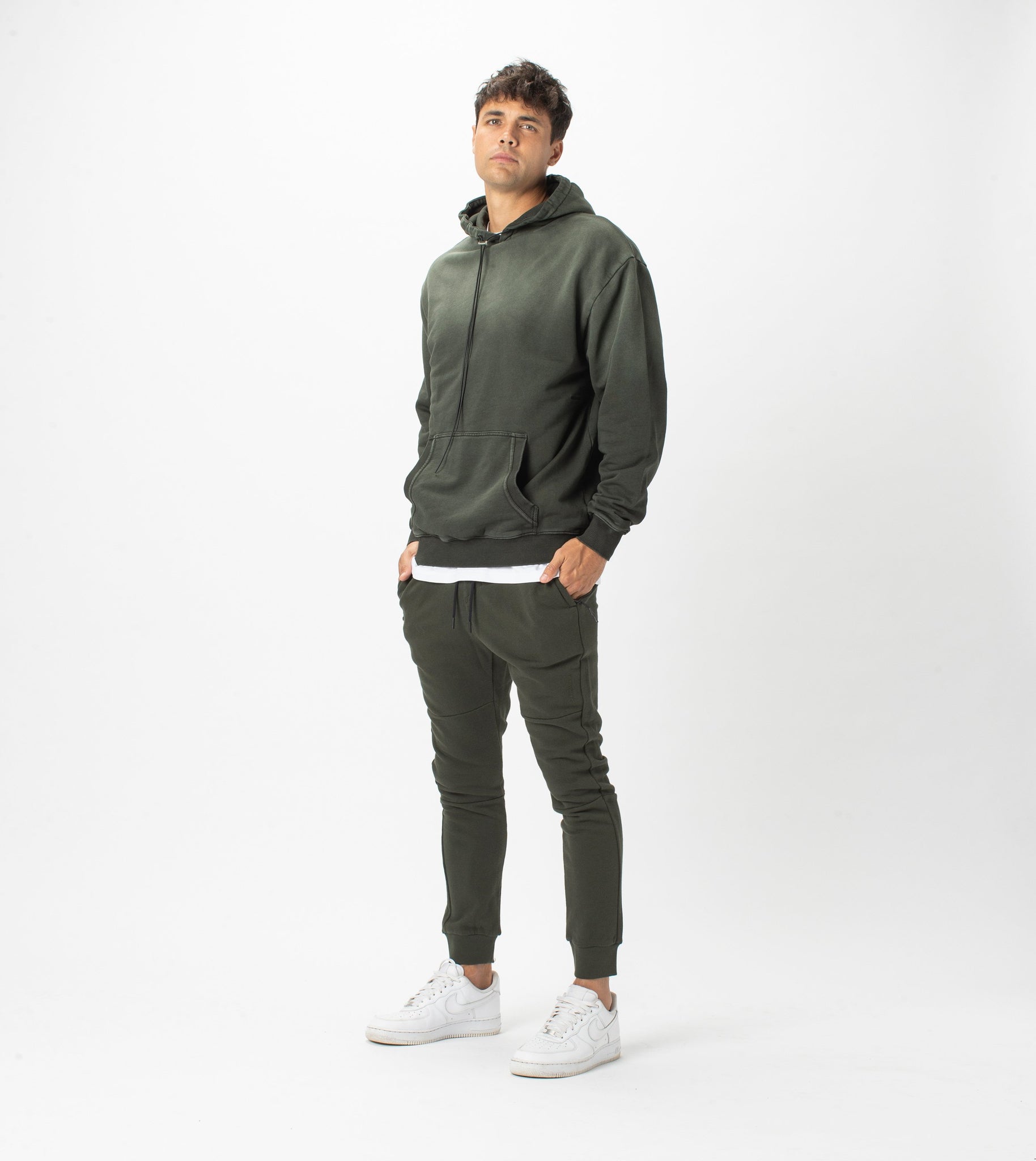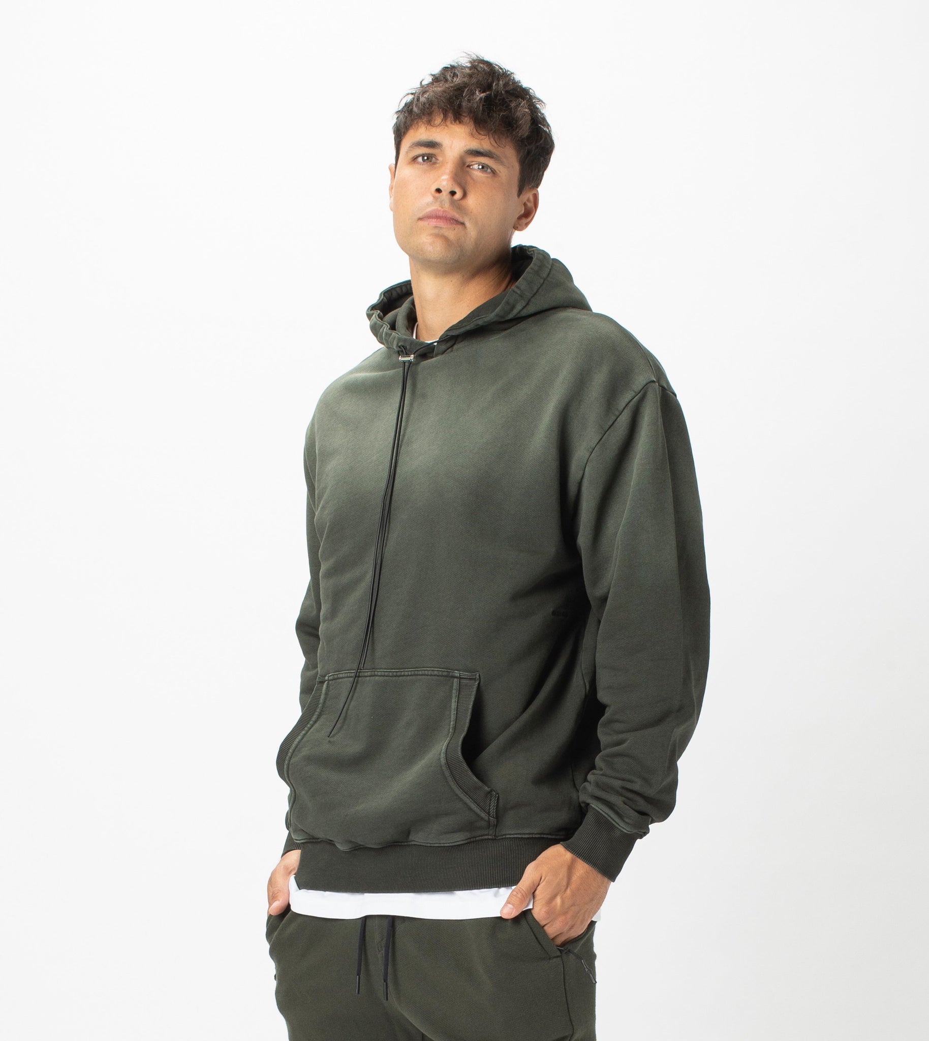 The ZANEROBE Field Hood Sweat in GD Dk Army - Oversized retro style with french terry fabrication. We wear with the matching Fleece Sureshot Joggers.