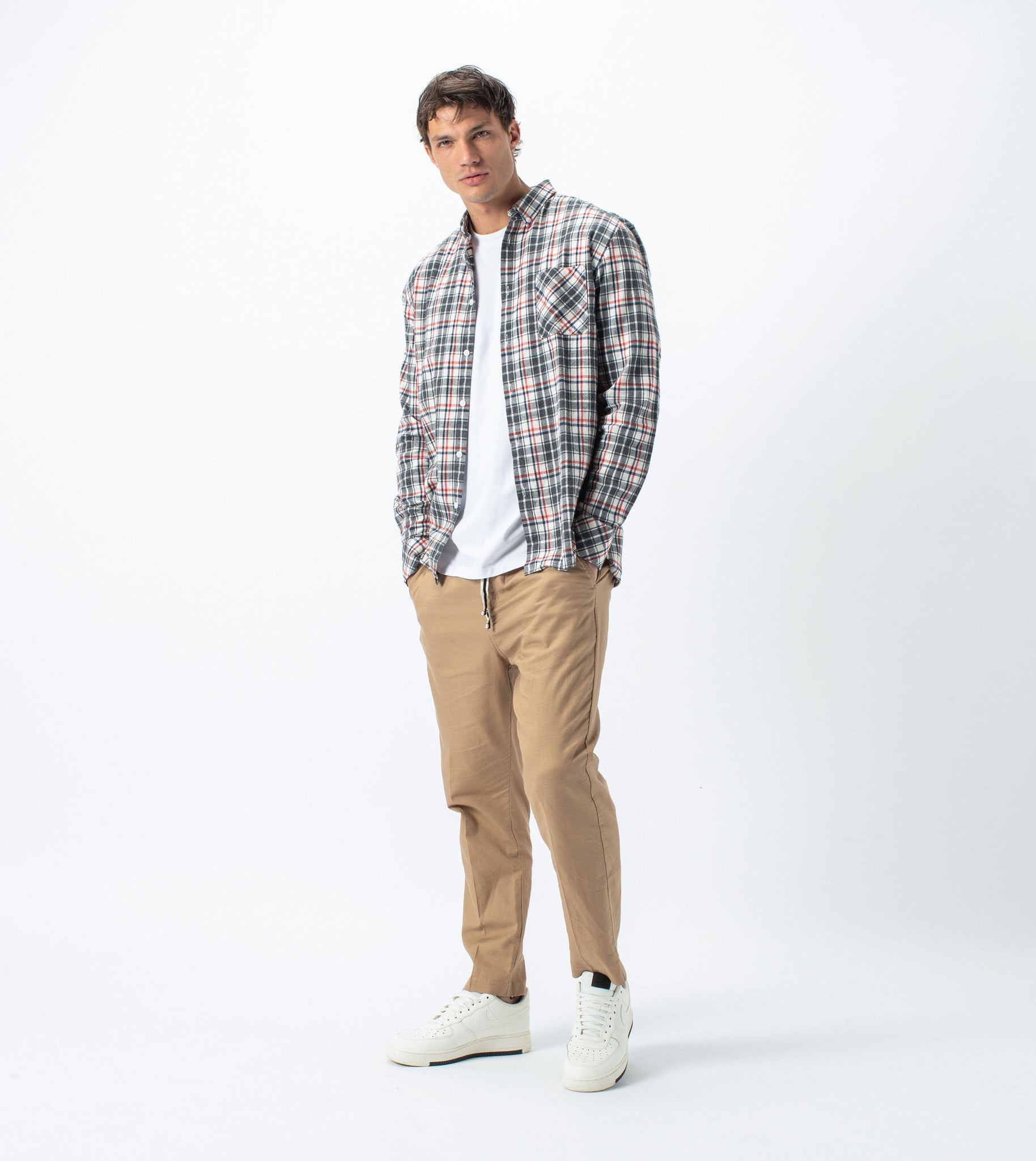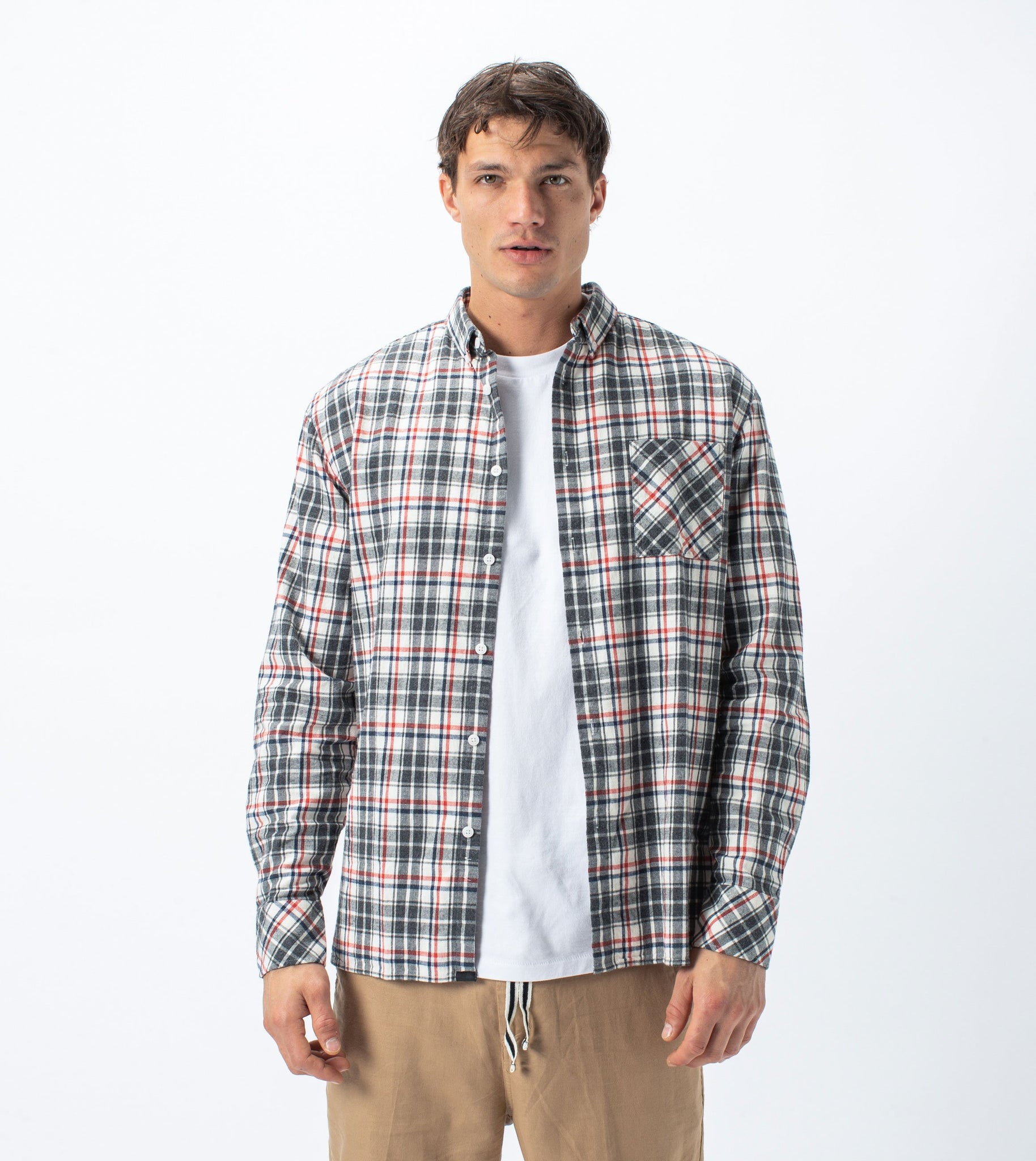 The ZANEROBE Flannel Lightweight LS Shirt in Milk/Grey - relaxed boxy fit, longsleeve button up shirt, signature side splits & elongated back length. Featuring 100% Cotton Brushed Flannel Check, breathable, lightweight & super soft handfeel. Styled here with the ZANEROBE Jumpa Chino.