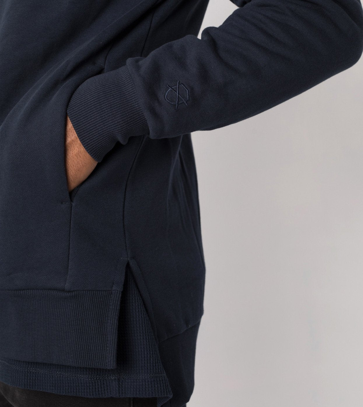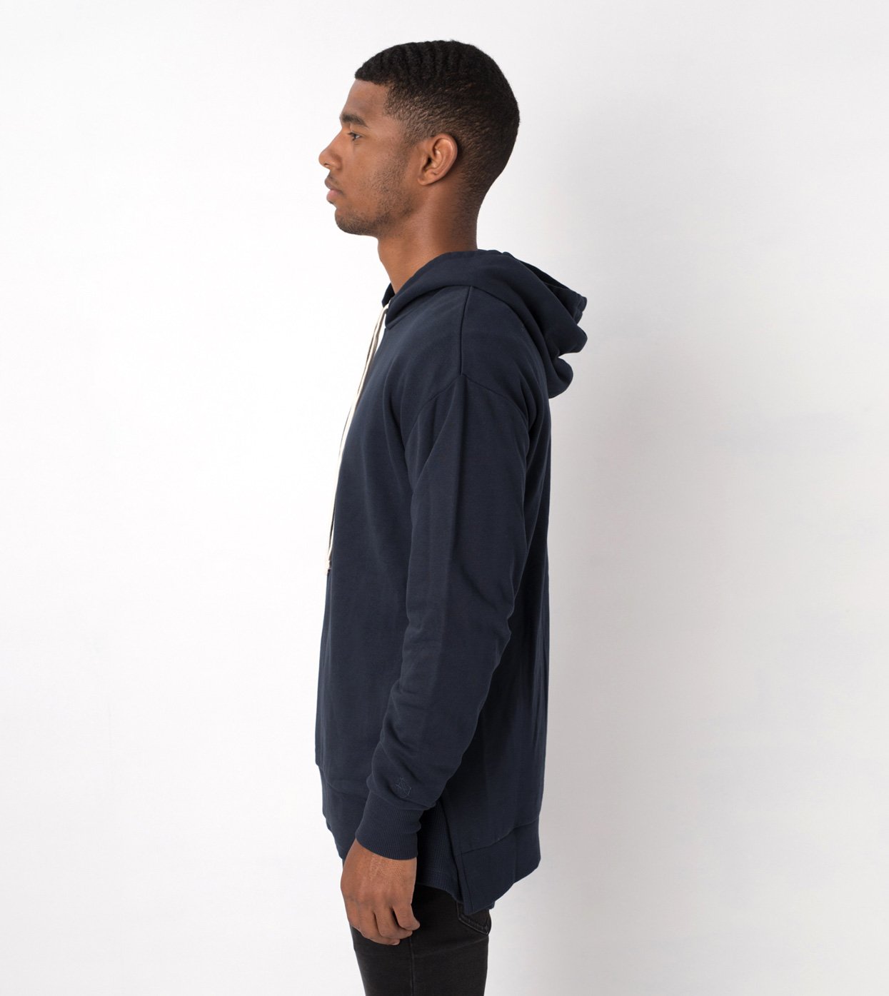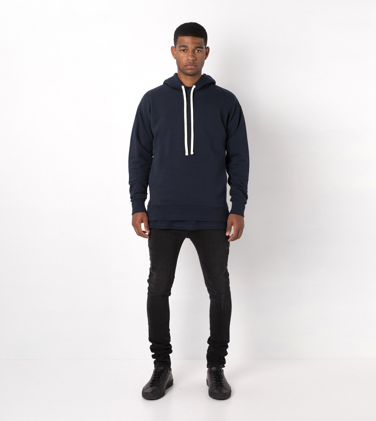 The ZANEROBE Flintlock Hood Sweat in Ink - Double faced hood, 100% cotton French Terry construction, forward side seams, signature split hem, aluminium eyelets, custom developed drawcords, concealed pouch pocket with micro-fire lining, embroidered cuff logo, ribbed cuffs and hems elongated back length. We recommend wearing with the Sureshot Joggers.