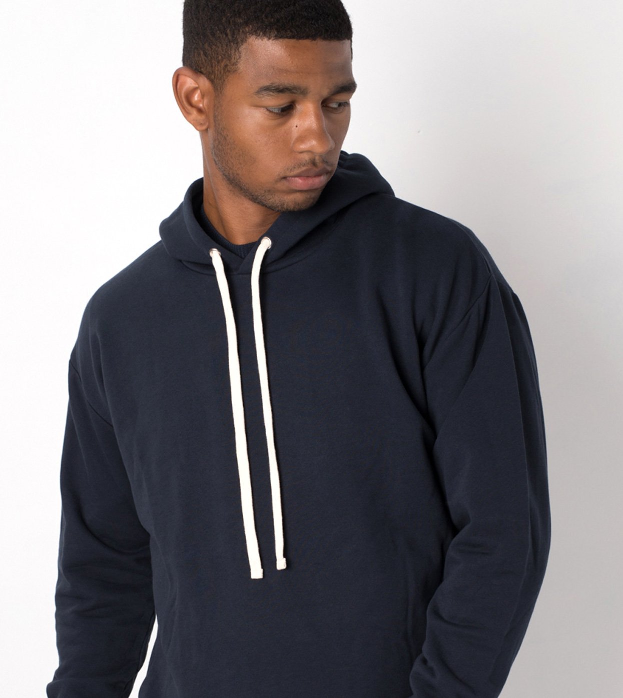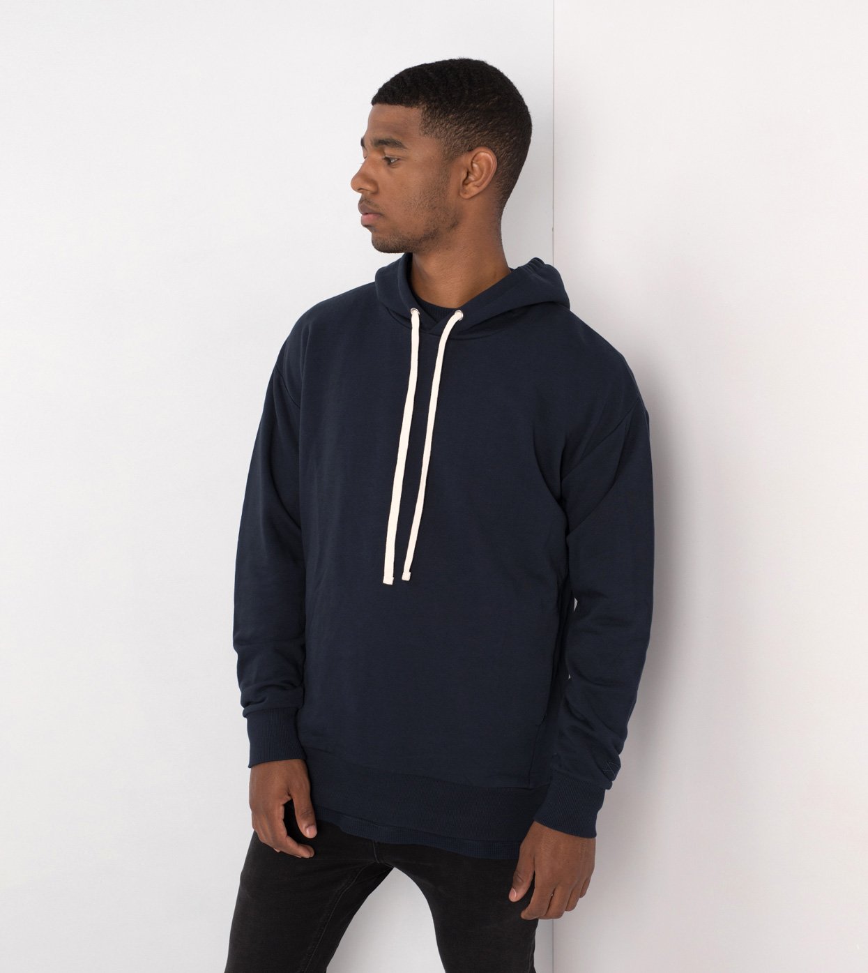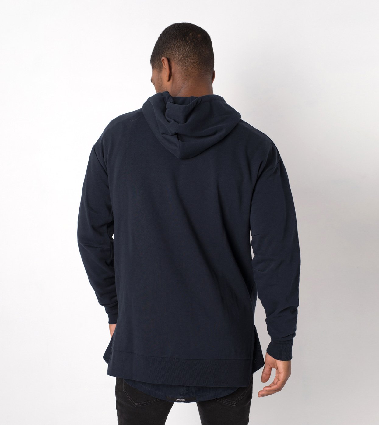 The ZANEROBE Flintlock Hood Sweat in Ink - Double faced hood, 100% cotton French Terry construction, forward side seams, signature split hem, aluminium eyelets, custom developed drawcords, concealed pouch pocket with micro-fire lining, embroidered cuff logo, ribbed cuffs and hems elongated back length. We recommend wearing with the Sureshot Joggers.