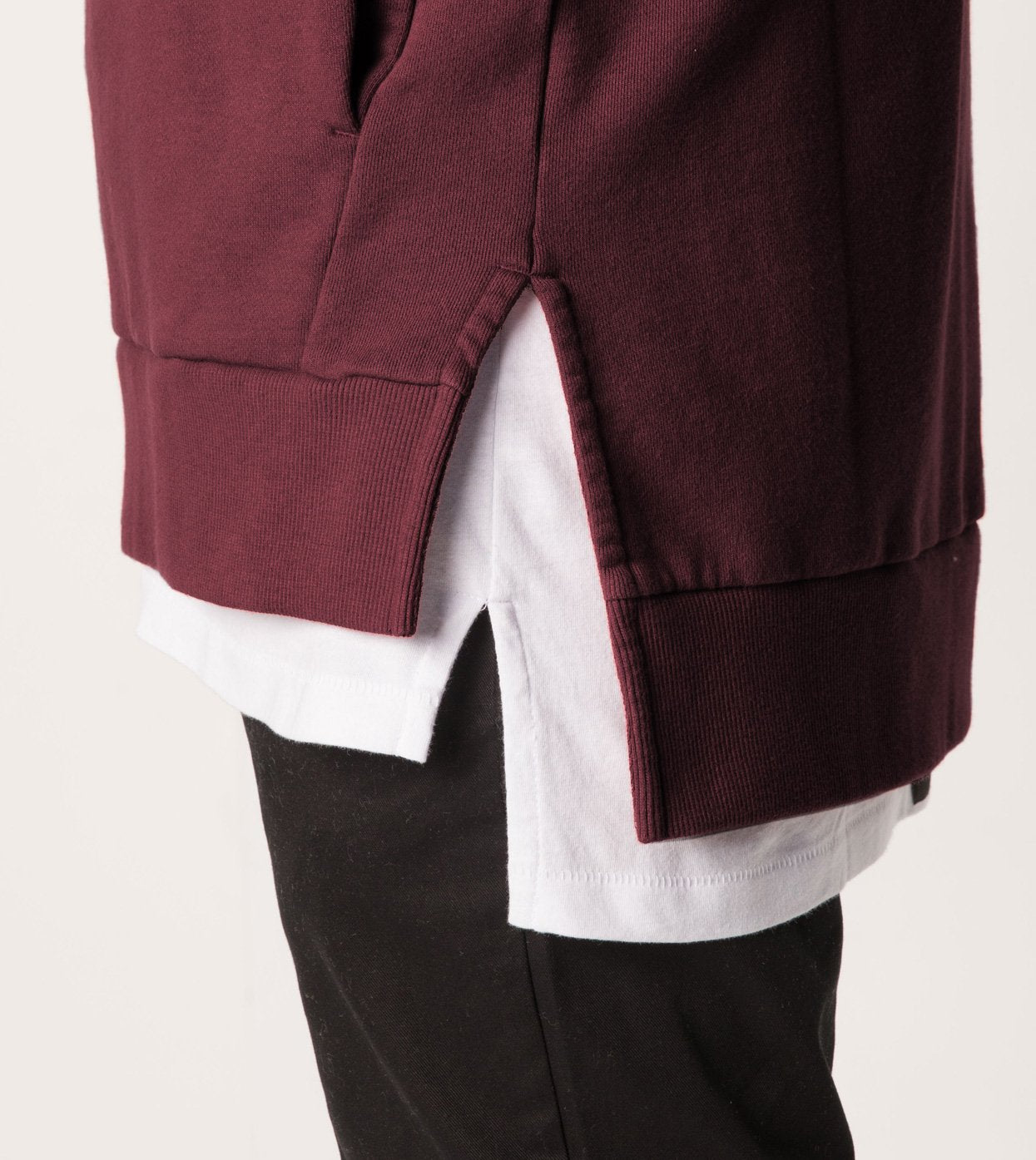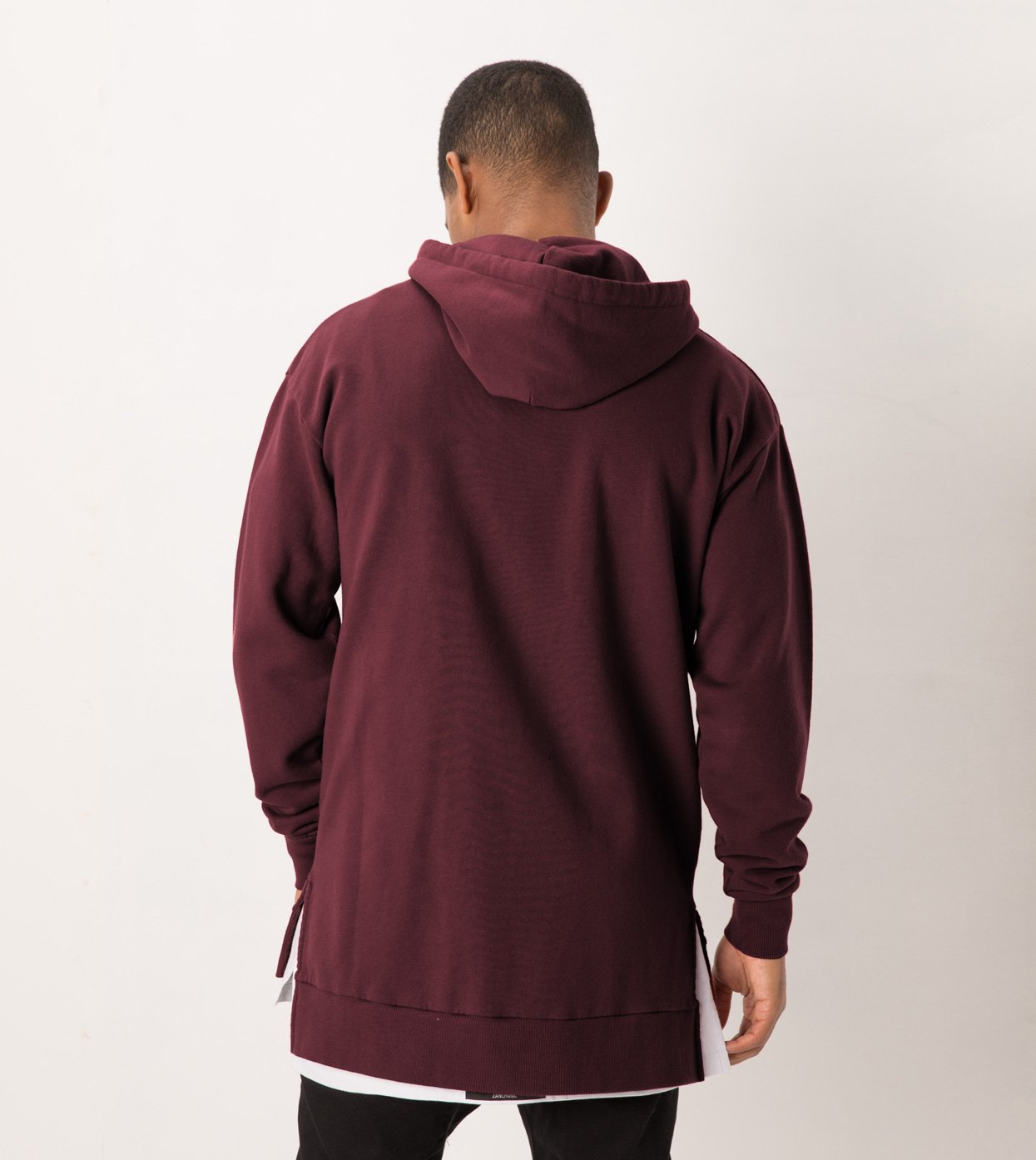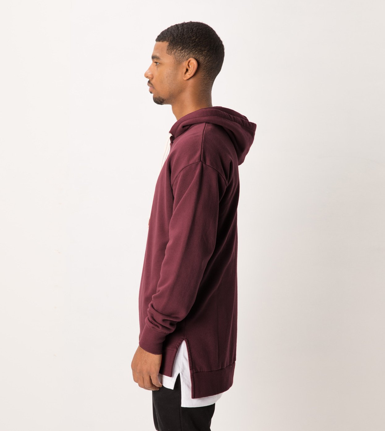 The ZANEROBE Flintlock Hood Sweat in Port - Double faced hood, 100% cotton French Terry construction, forward side seams, signature split hem, aluminium eyelets, custom developed drawcords, concealed pouch pocket with micro-fire lining, embroidered cuff logo, ribbed cuffs and hems elongated back length. We wear with our classic Salerno Chinos.