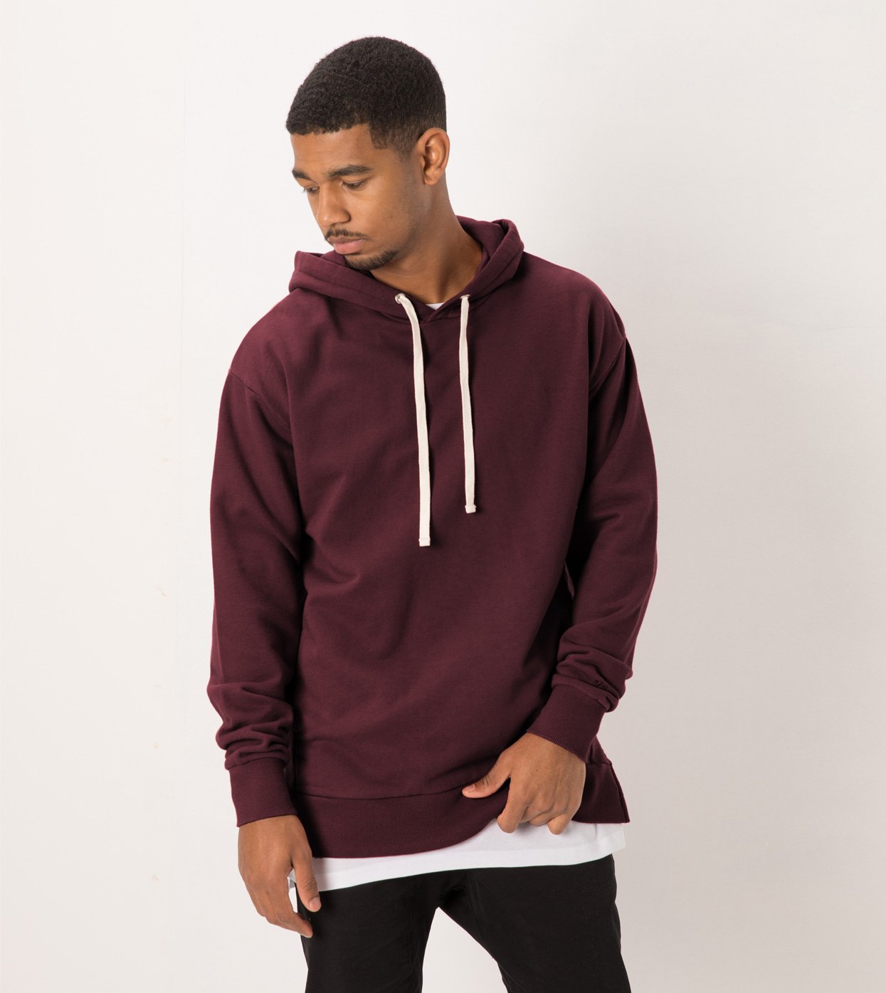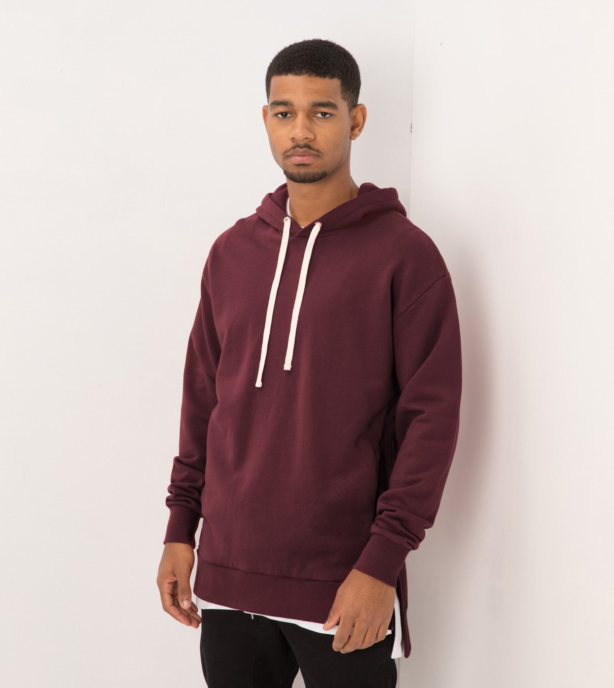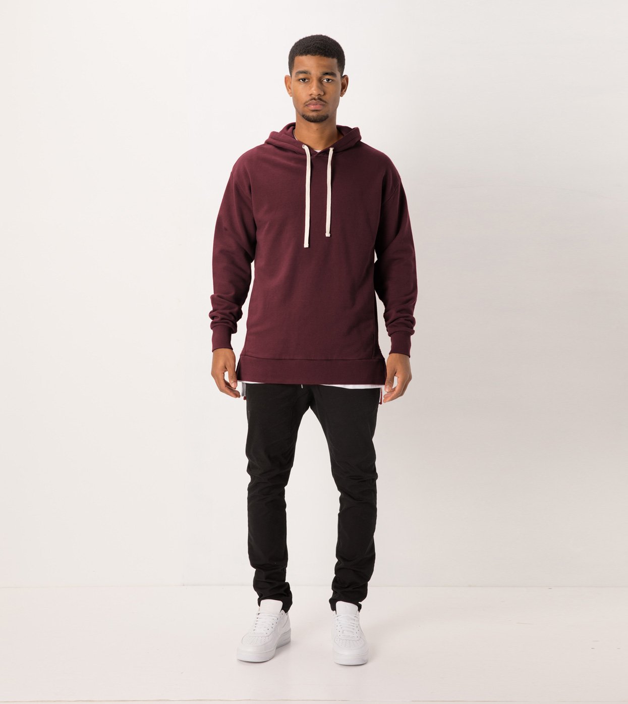 The ZANEROBE Flintlock Hood Sweat in Port - Double faced hood, 100% cotton French Terry construction, forward side seams, signature split hem, aluminium eyelets, custom developed drawcords, concealed pouch pocket with micro-fire lining, embroidered cuff logo, ribbed cuffs and hems elongated back length. We wear with our classic Salerno Chinos.
