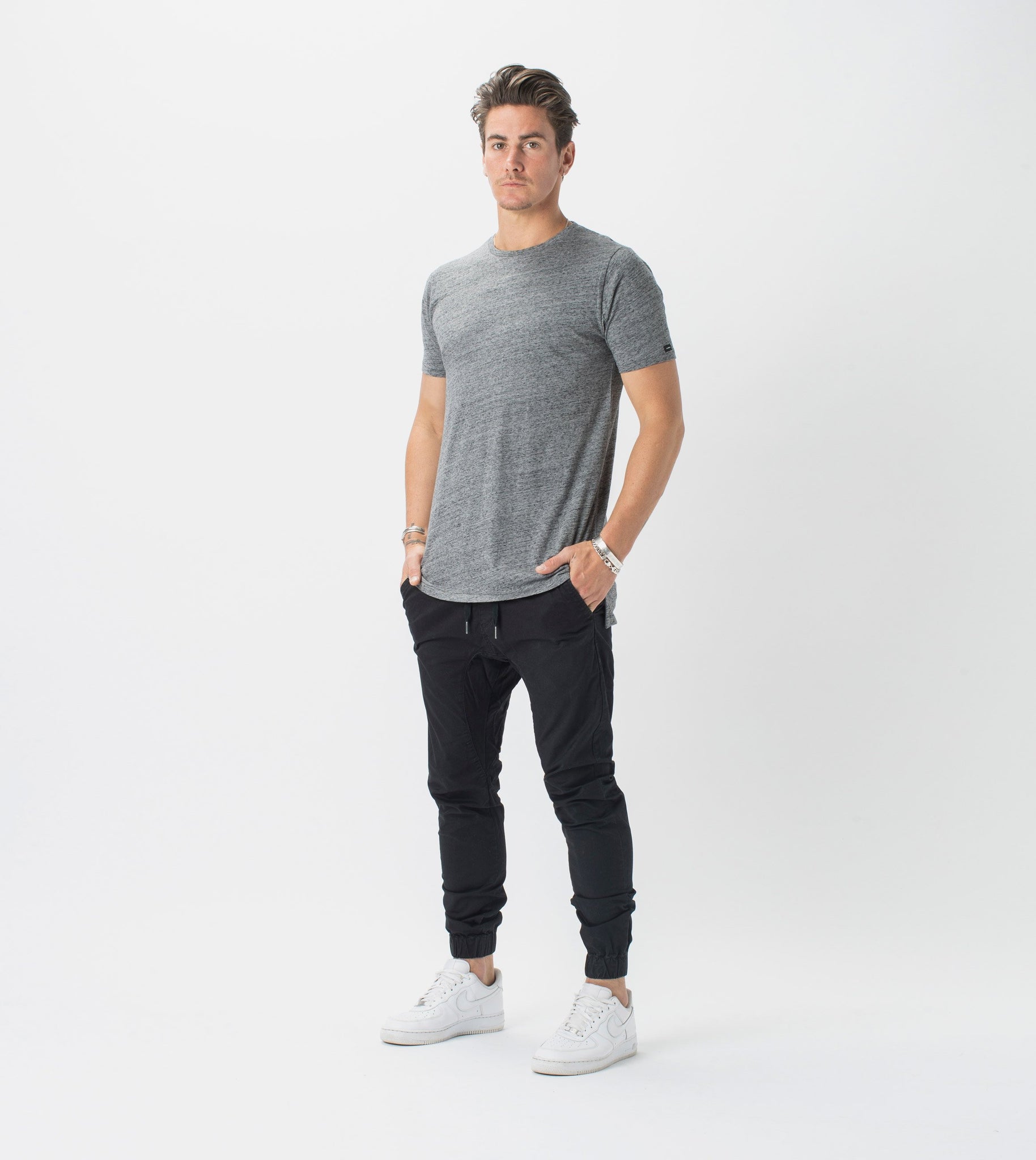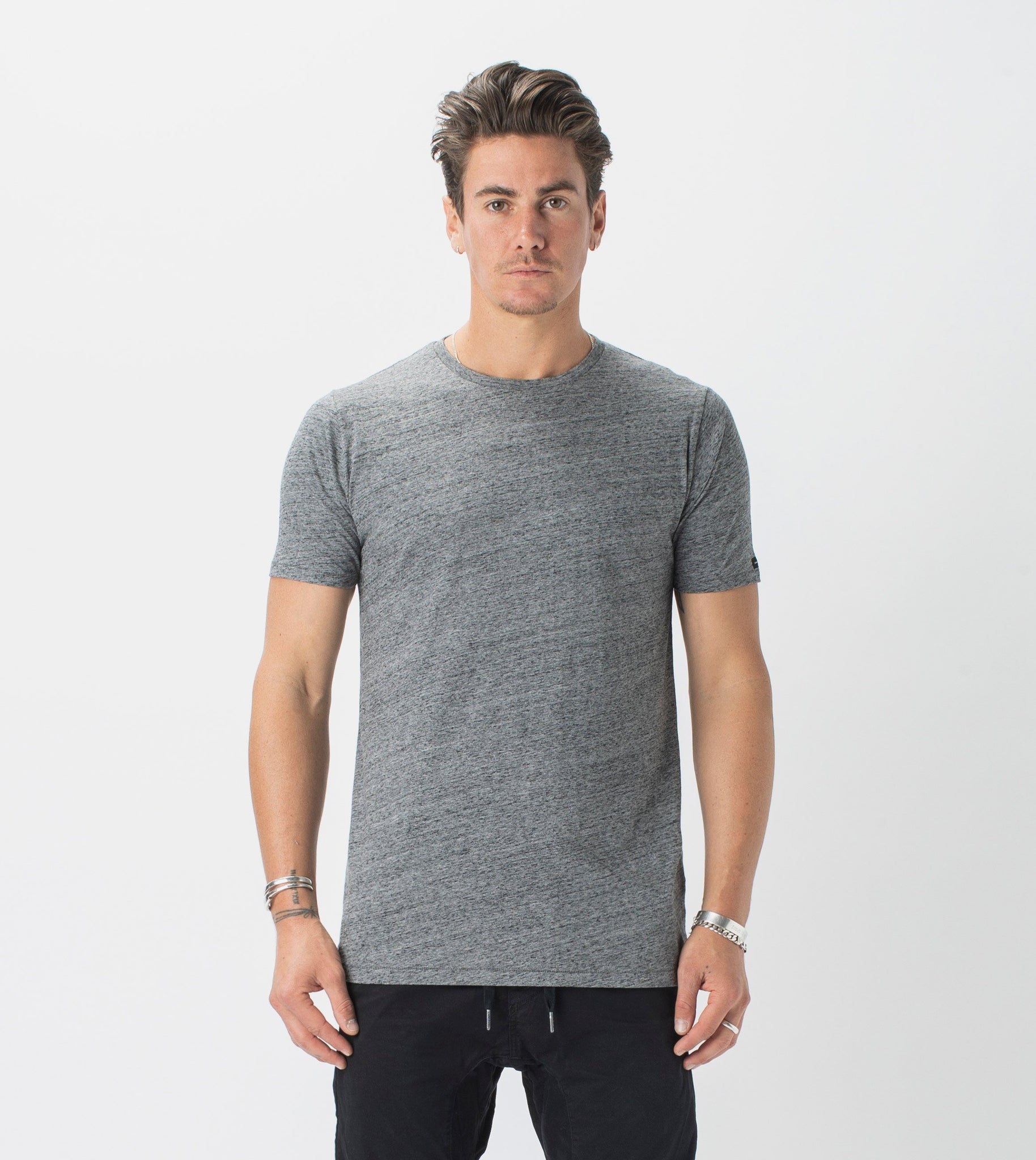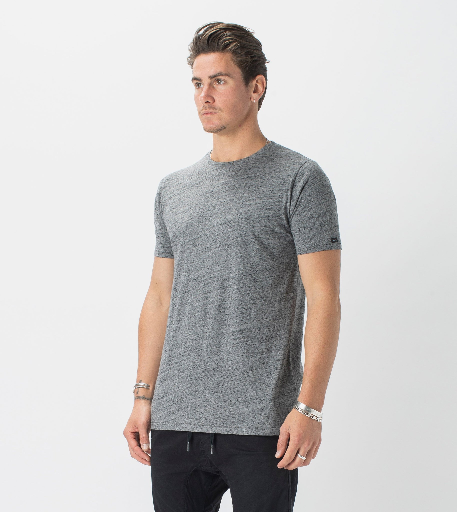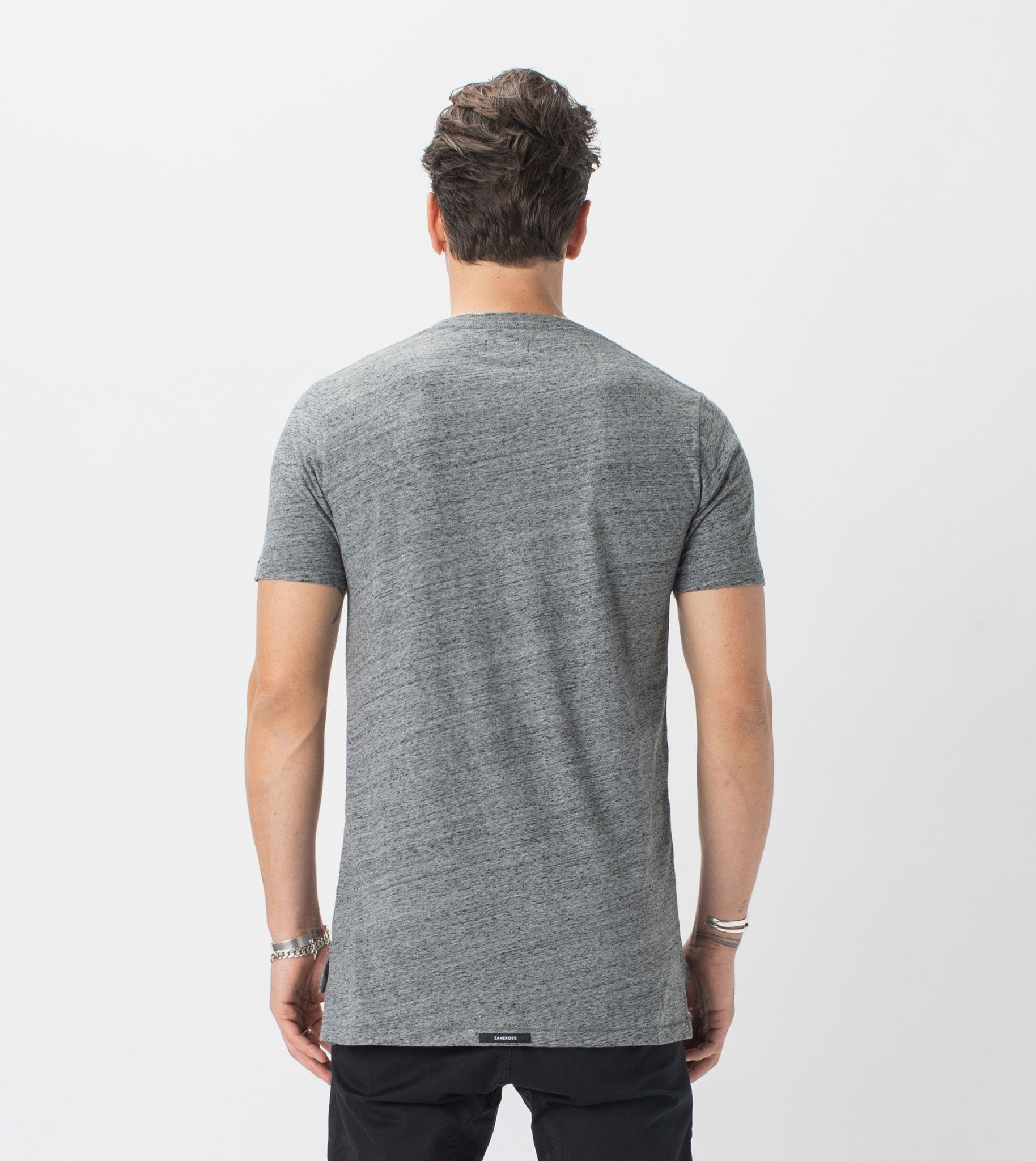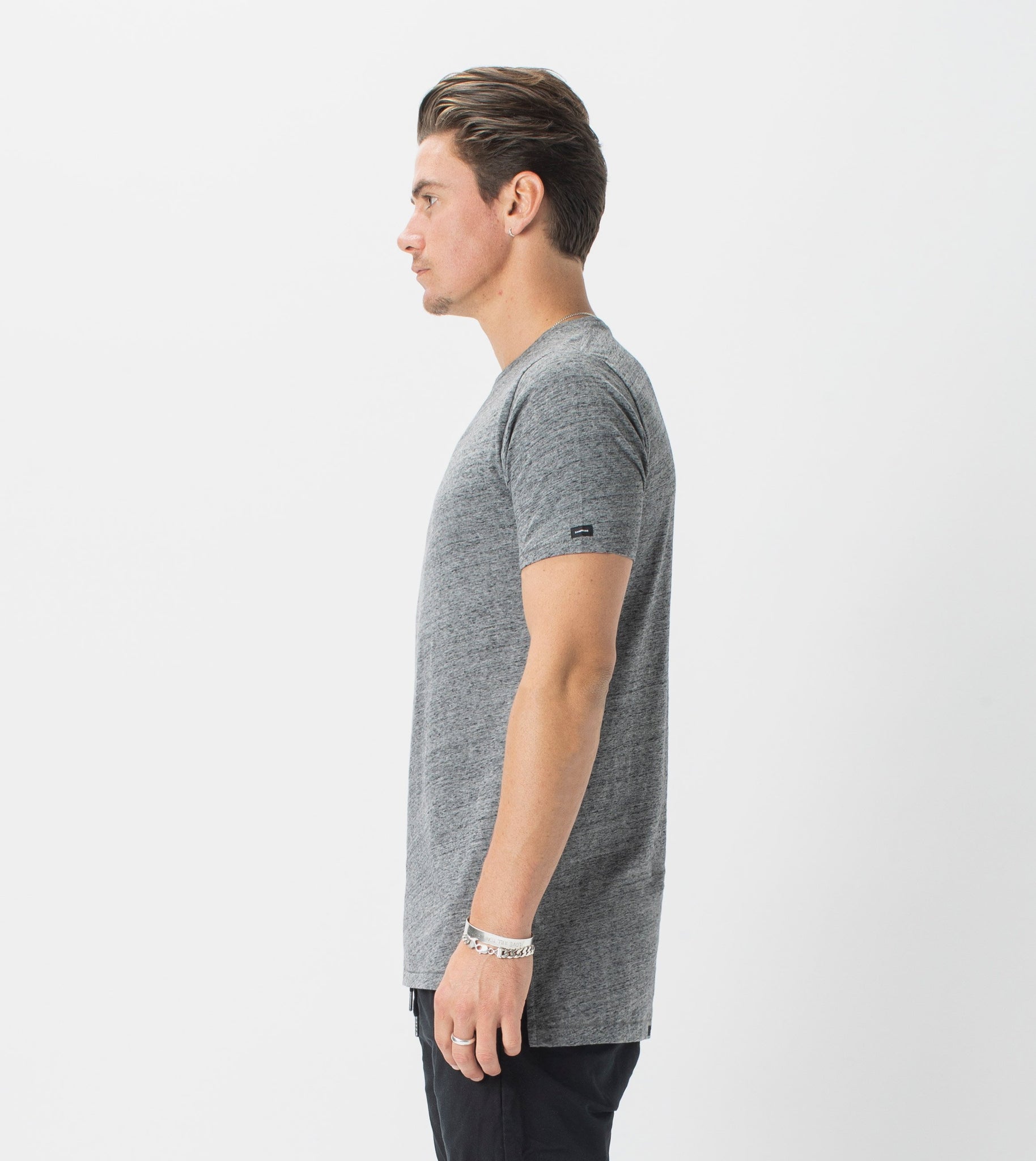 The ZANEROBE Flintlock Tee in Charcoal Marle - our signature basic Tee with elongated back and side split. We wear with the classic Sureshot Jogger.