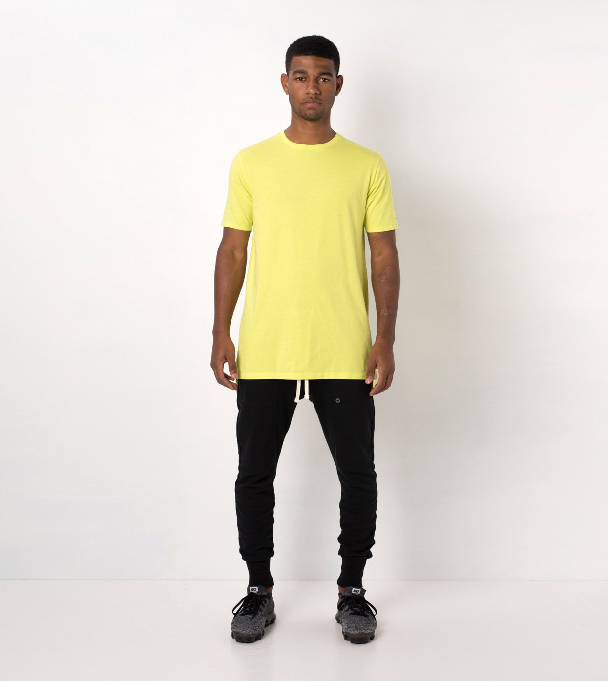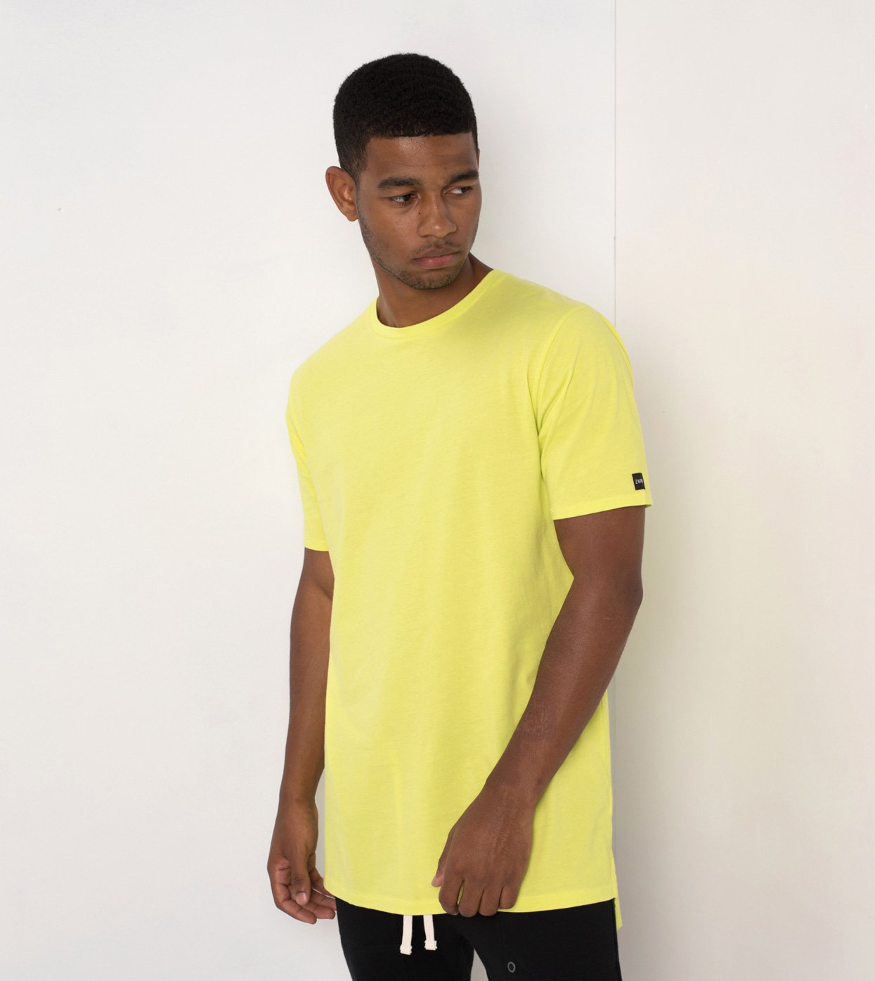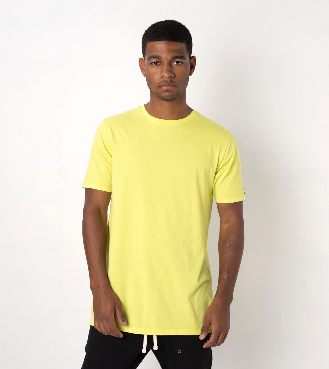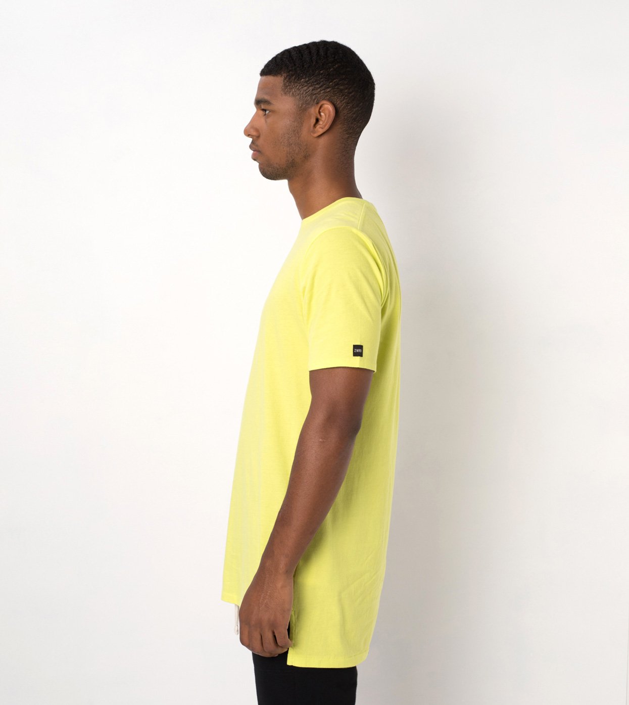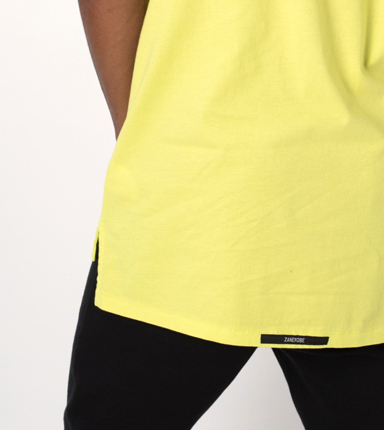 The ZANEROBE Flintlock Tee in Lemon Lime - best selling basic Tee in seasonal highlight color-way, easy to wear elongated back, stepped hem with split sides. We wear ours with the Zephyr Shorts or some skinny denim shorts.
