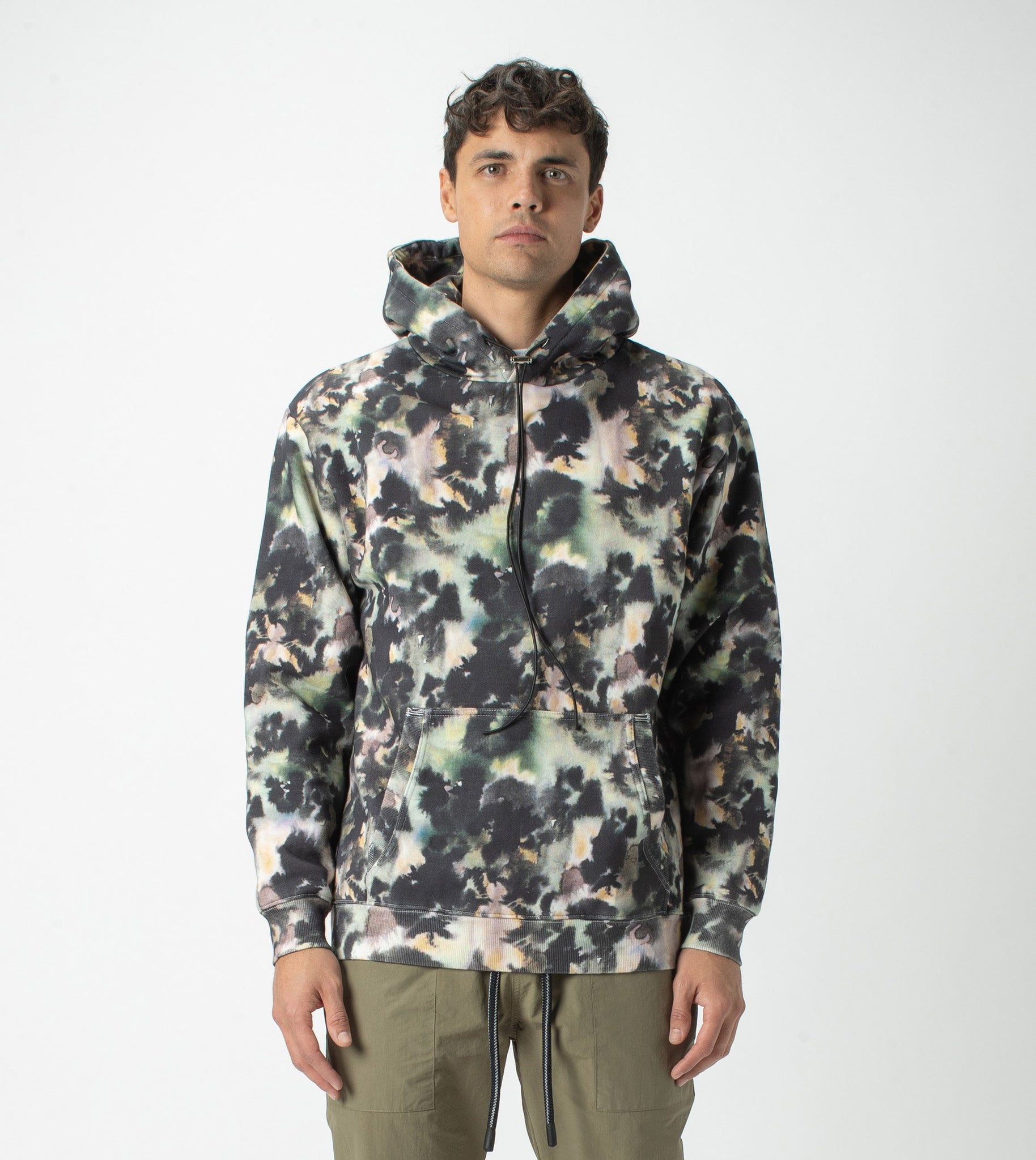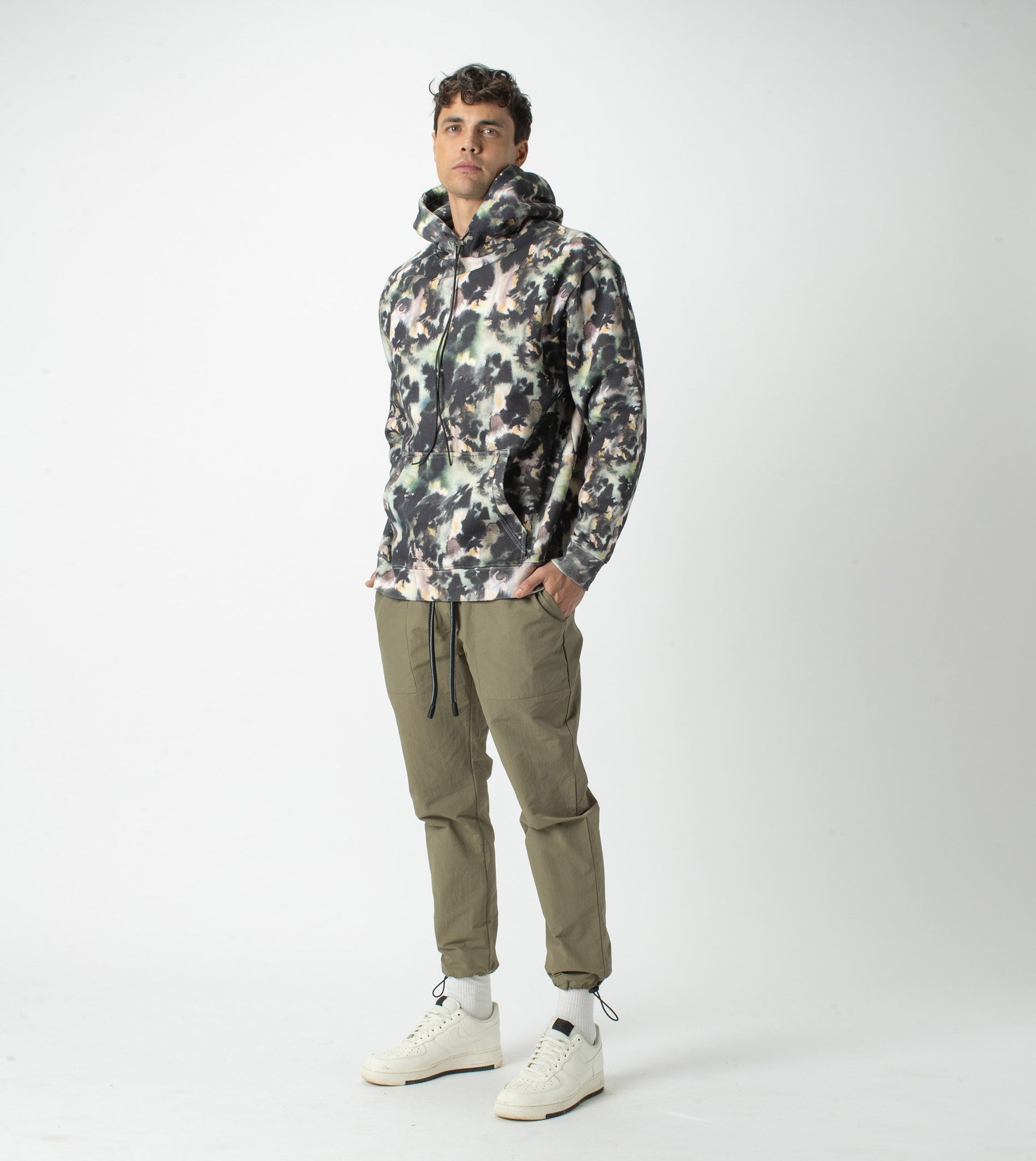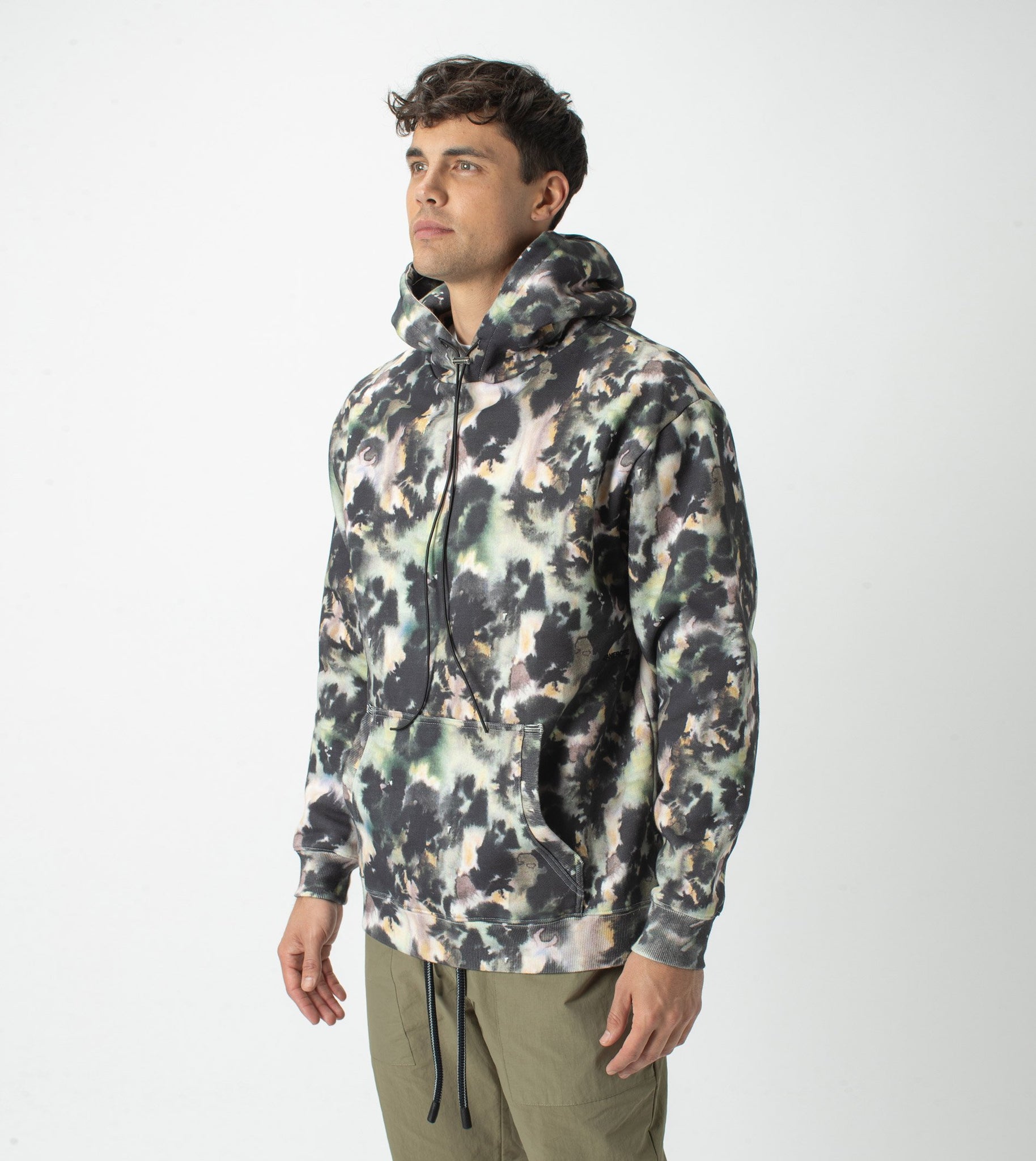 The ZANEROBE Foliage Hood Sweat in Moss Multi - Oversized retro style with a fleece fabrication. We wear with our signature Sureshot Joggers.