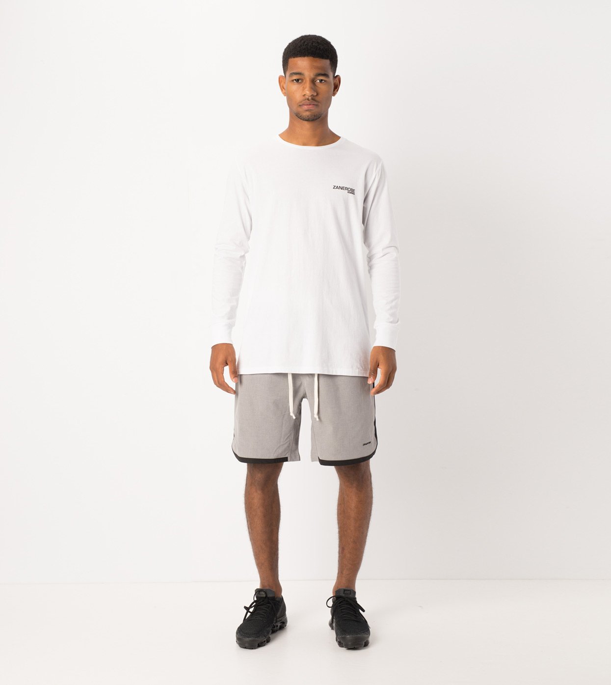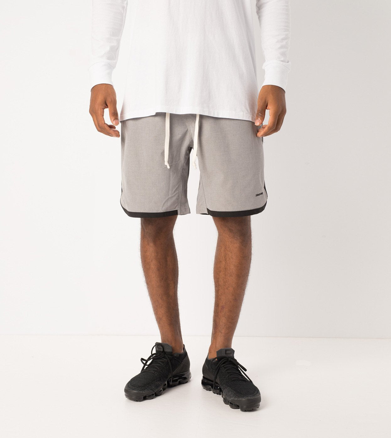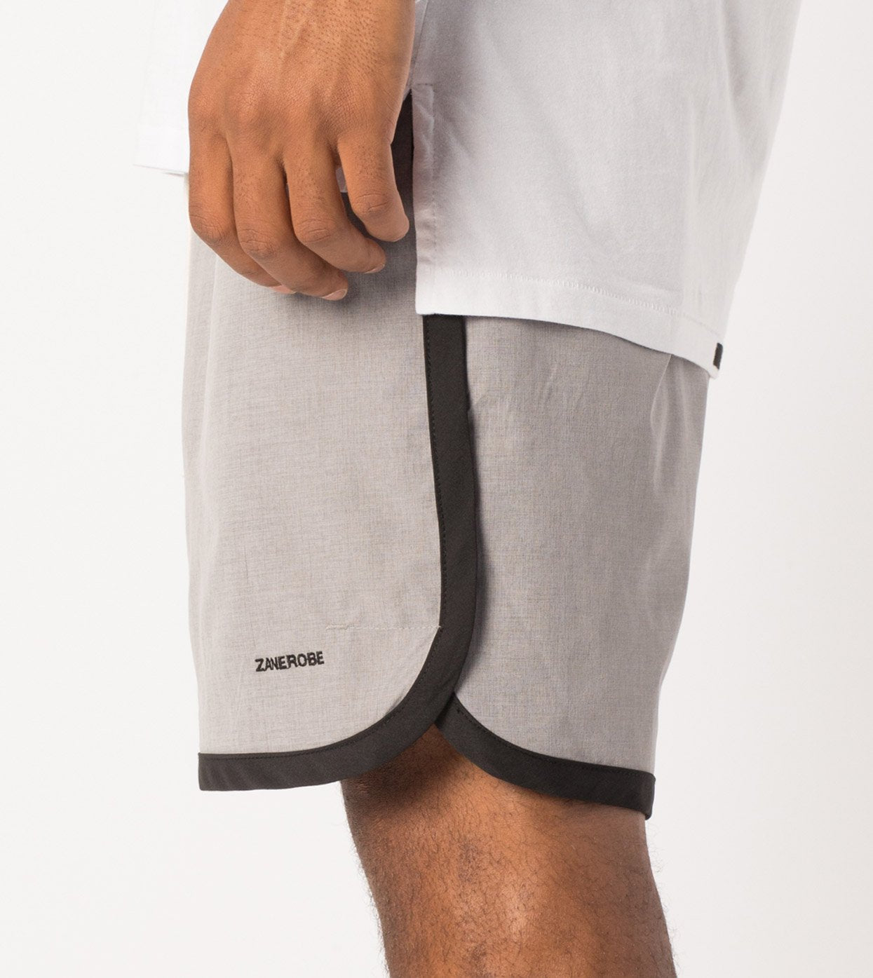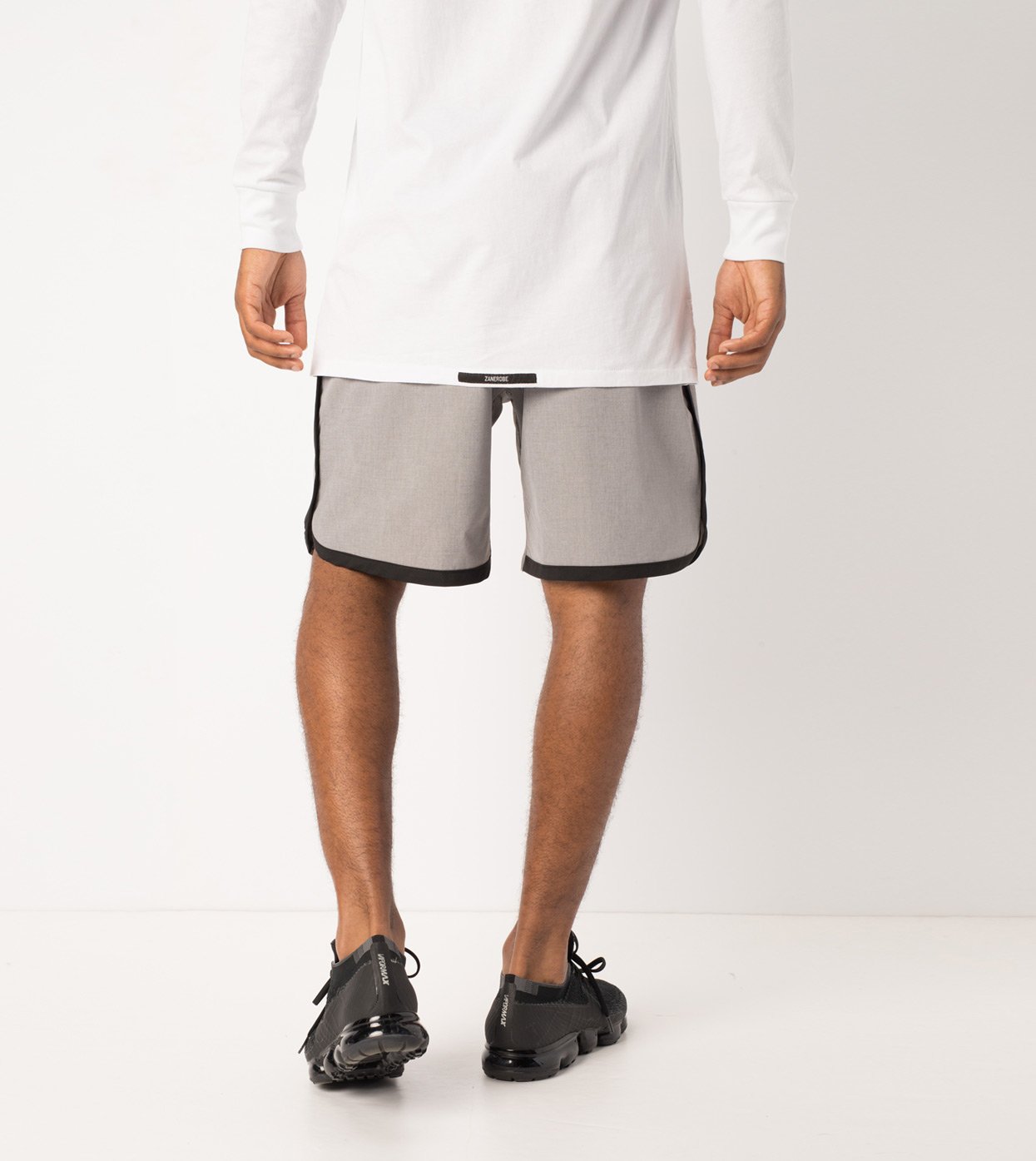 The ZANEROBE Goalline Short in Grey - stretch cotton/nylon construction accented with side stripe detail, scalloped hem, concealed side pockets, custom developed drawcords, thick ribbed waistline. We wear with a Graphic Flintlock Tees.