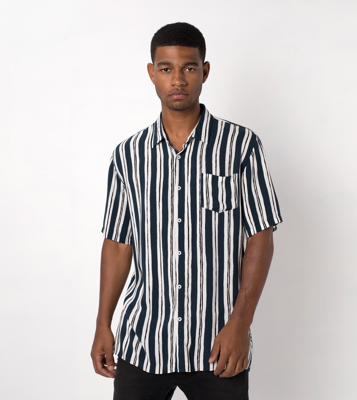 The ZANEROBE Impressions SS Shirt in White/Ink - lightweight 100% rayon construction, standard collar, horizontal stripes, chest pocket, boxy fit, stepped hem and side split details. We wear with the Zephyr Shorts.