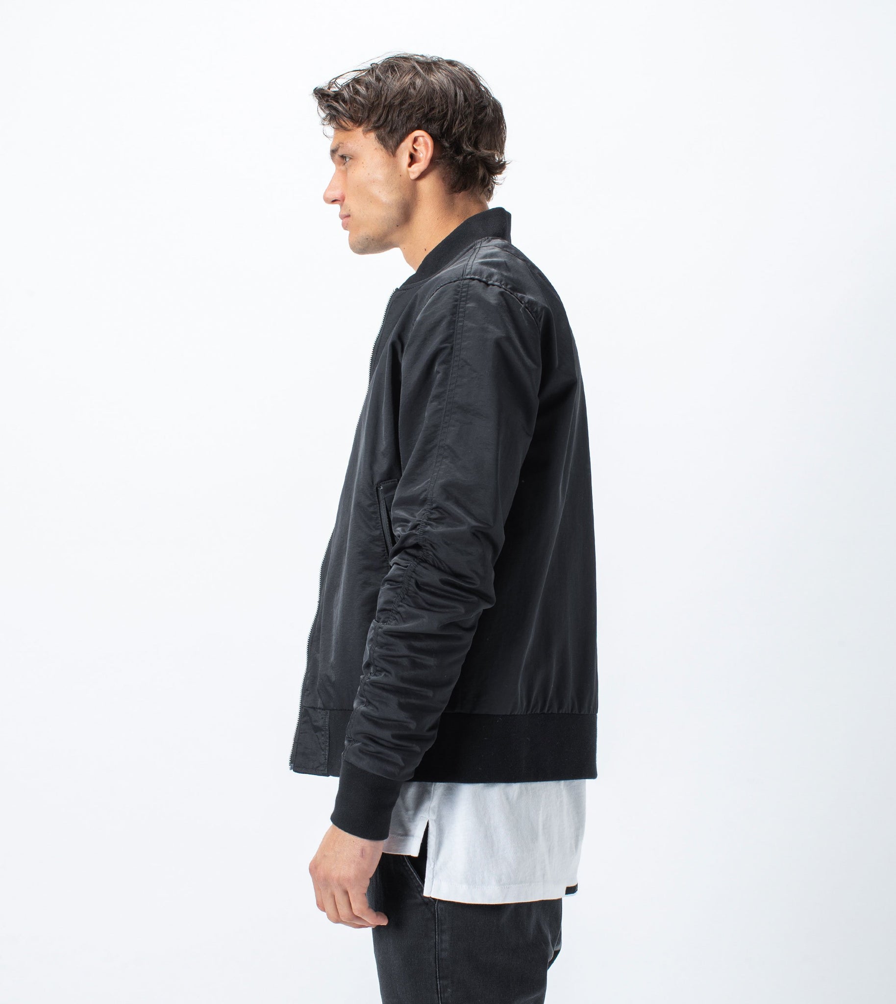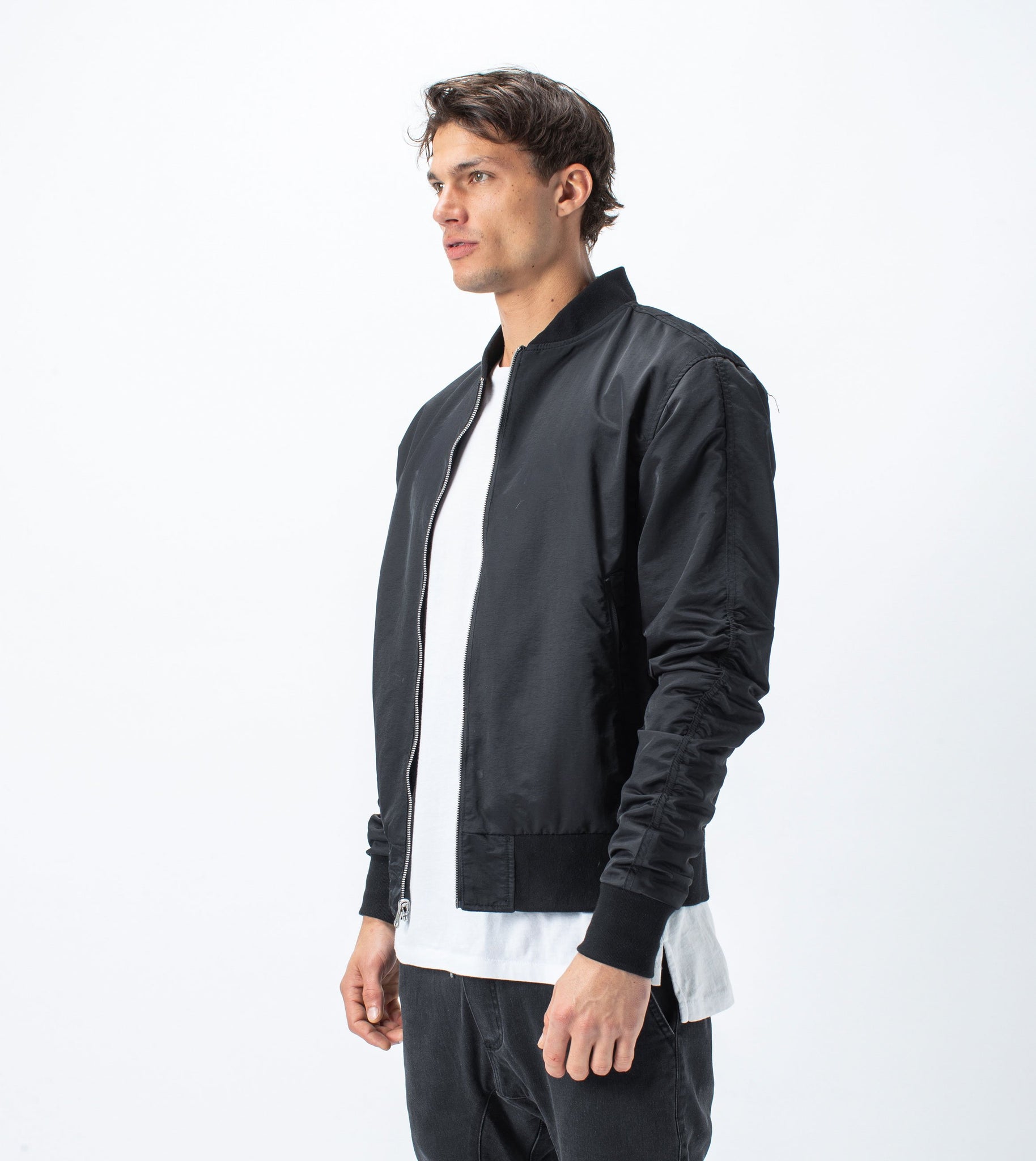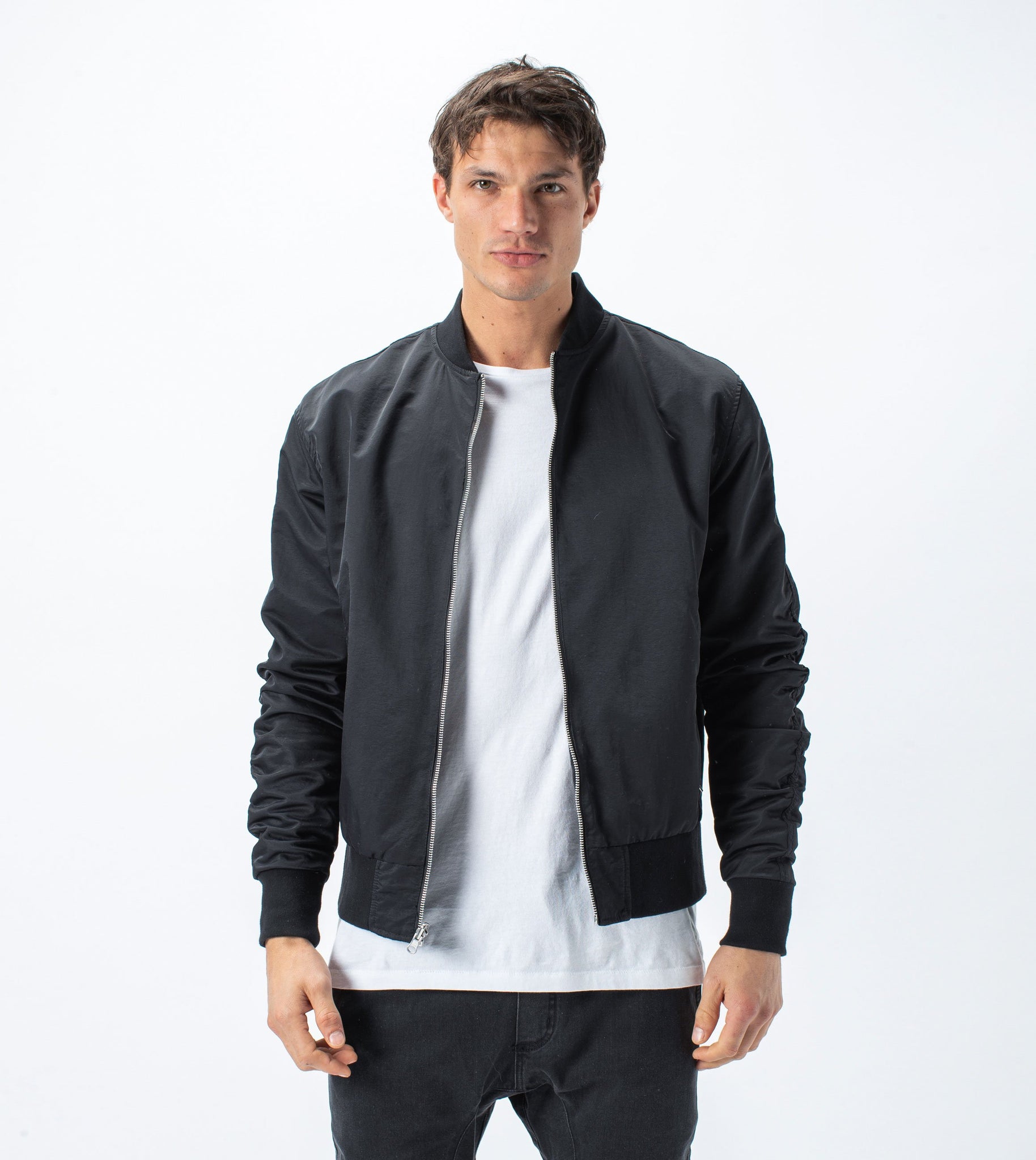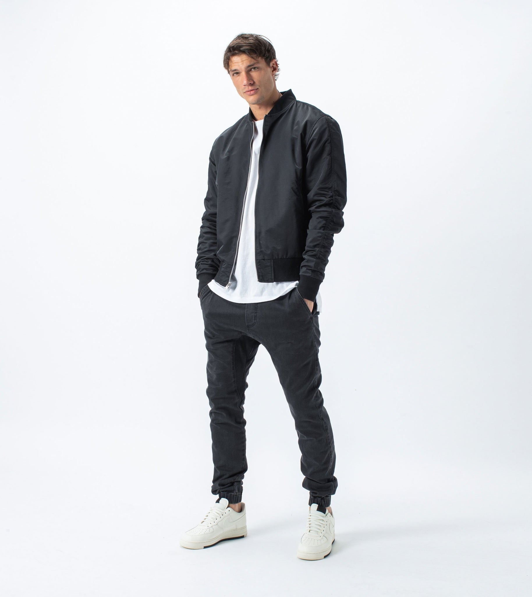 The ZANEROBE x PROJECT A limited edition Reversible J9 Bomber in Black/Black - Extinct Japanese cotton/linen, crafted on an authentic handloom in Osaka reversed into a light paper-touch, compact water resistant nylon shell. Subtle PROJECT A branding featuring sustainable aluminium hardware. Wear with our classic Salerno Chinos.