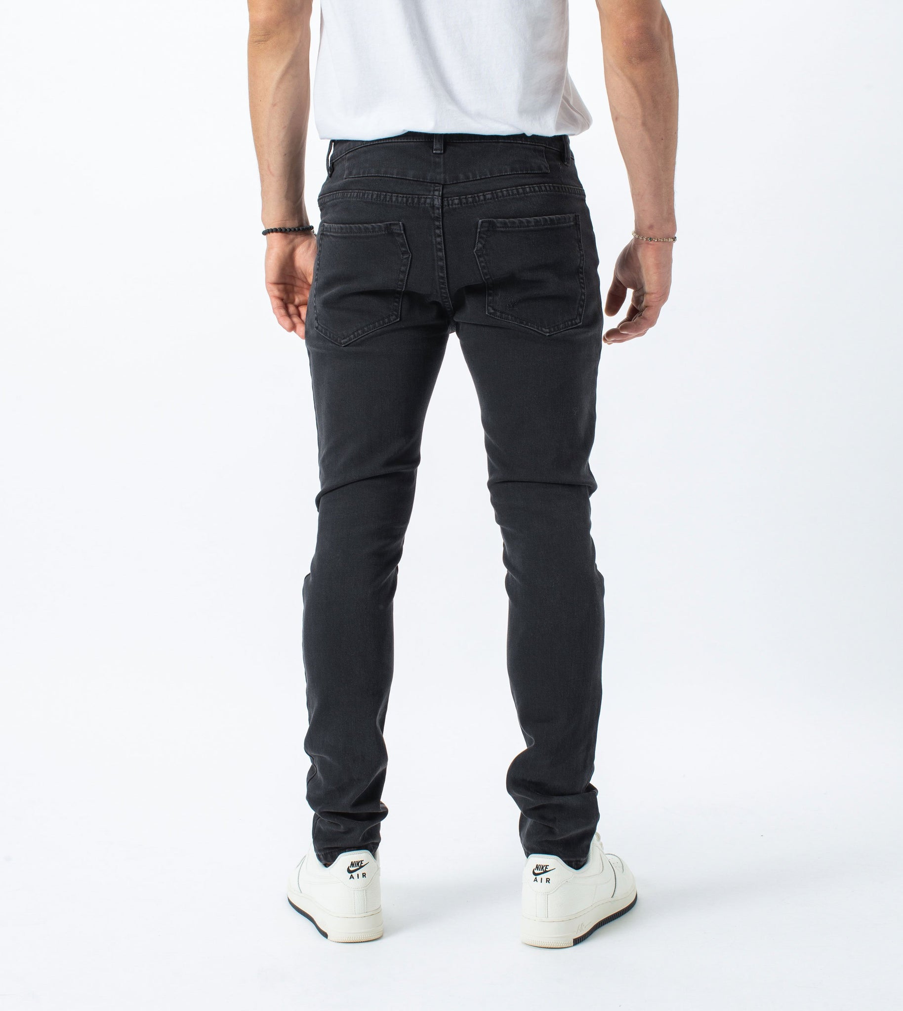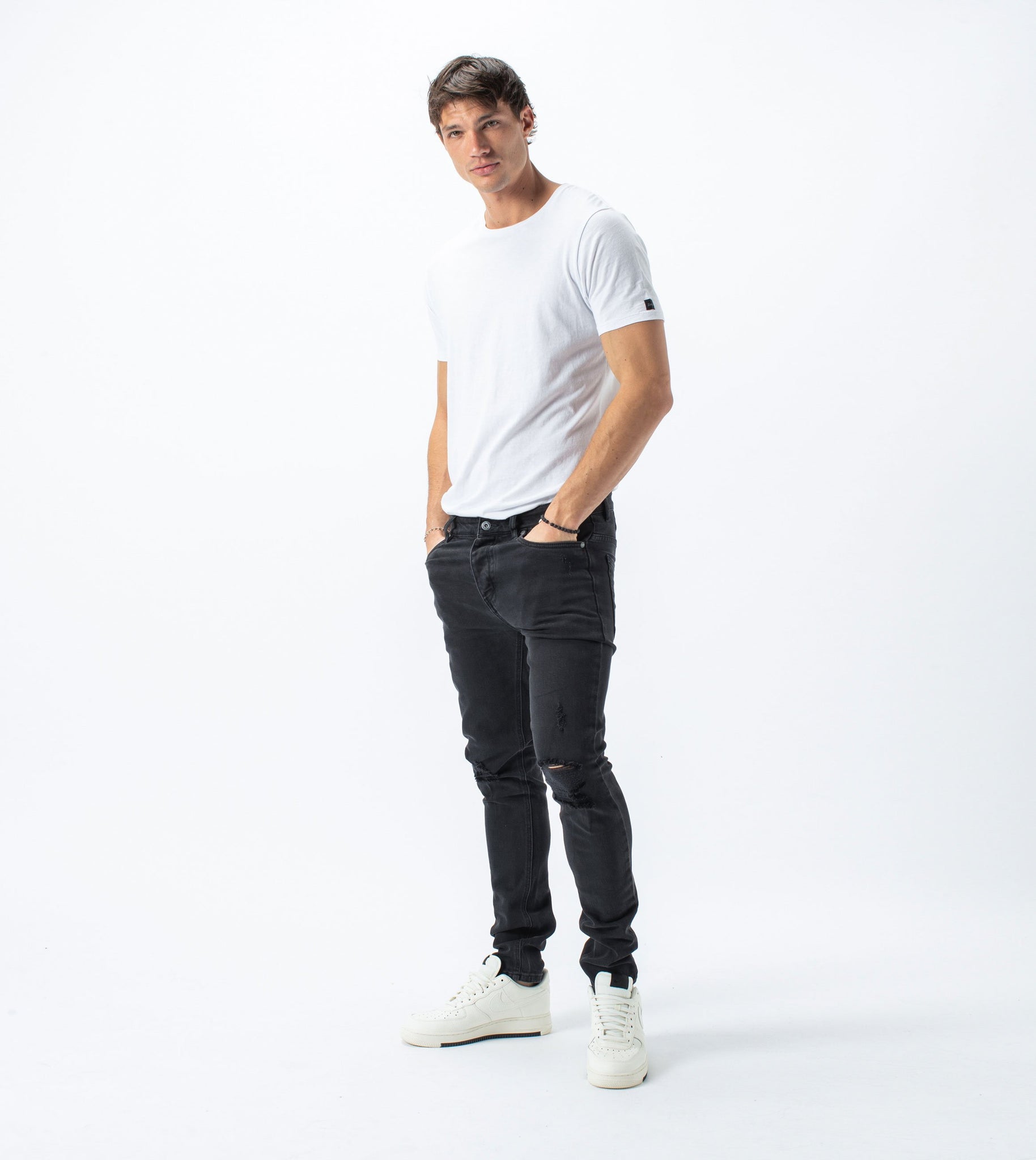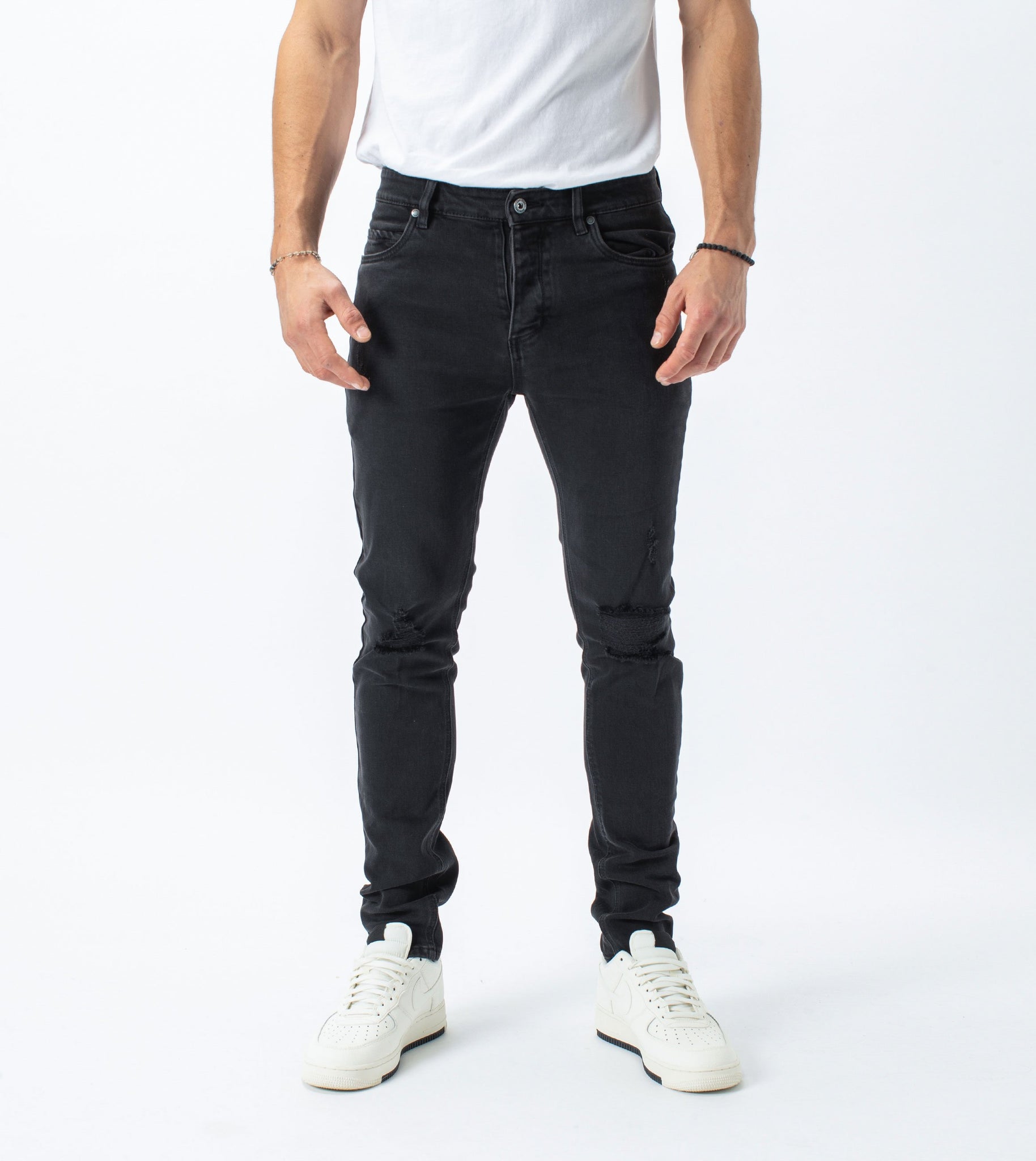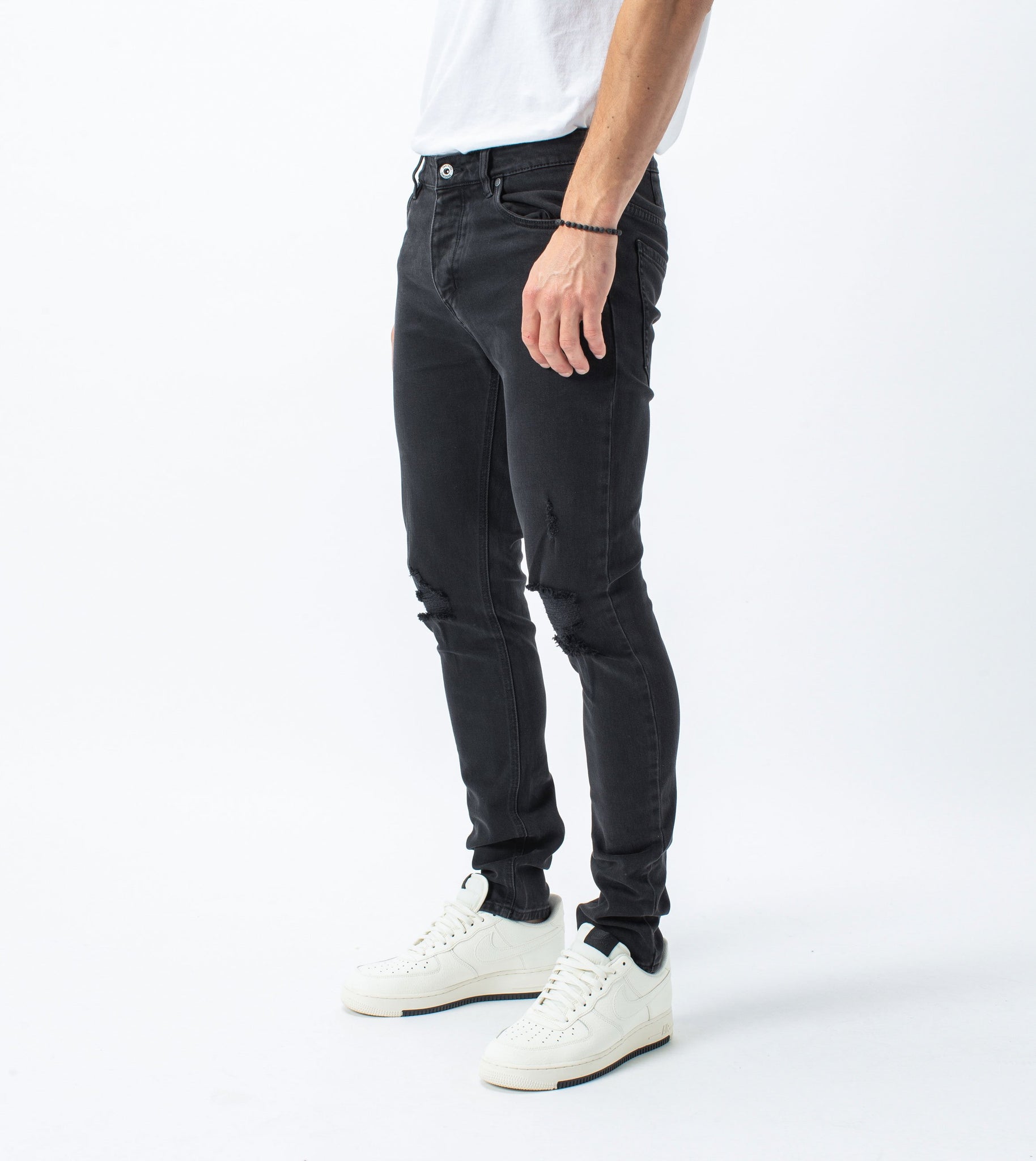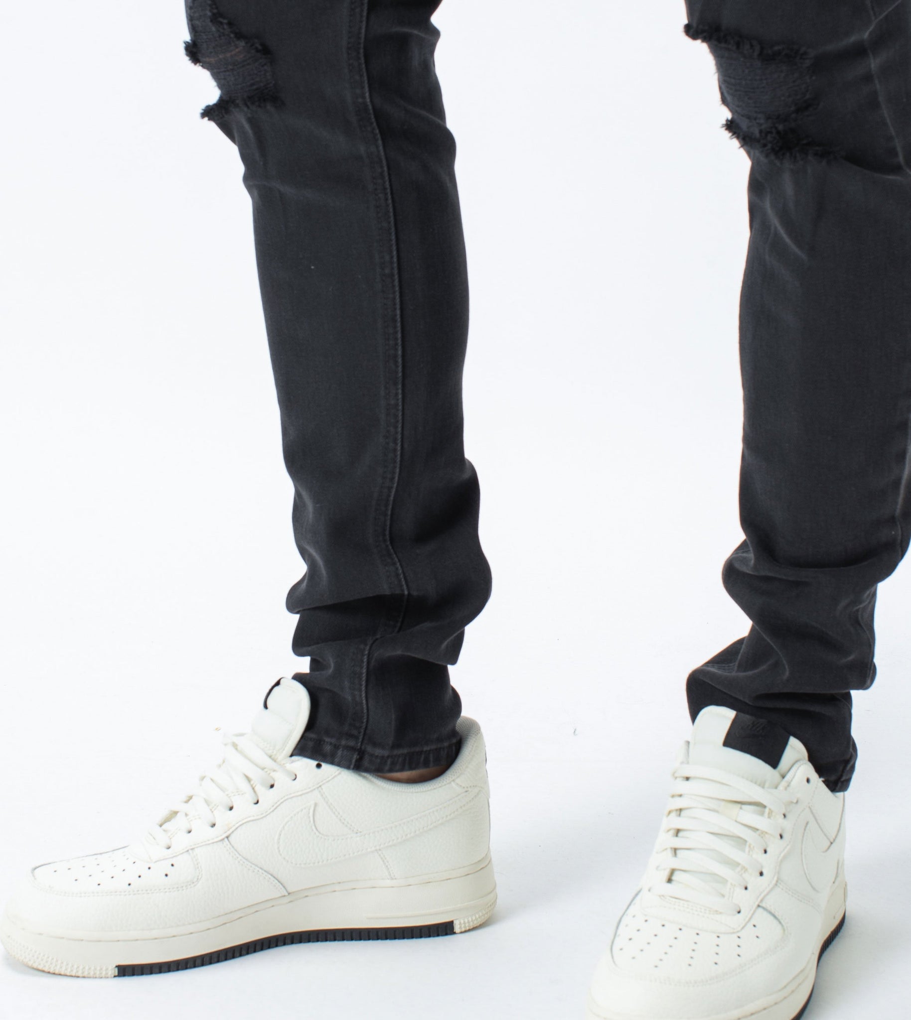 The ZANEROBE Joe Blow Denim in Busted Black - ZANEROBE's signature Jean fit, classic 5-pocket construction, tailored straight fit, knee rips, regular rise and button fly. We wear with our classic Flintlock Tee.