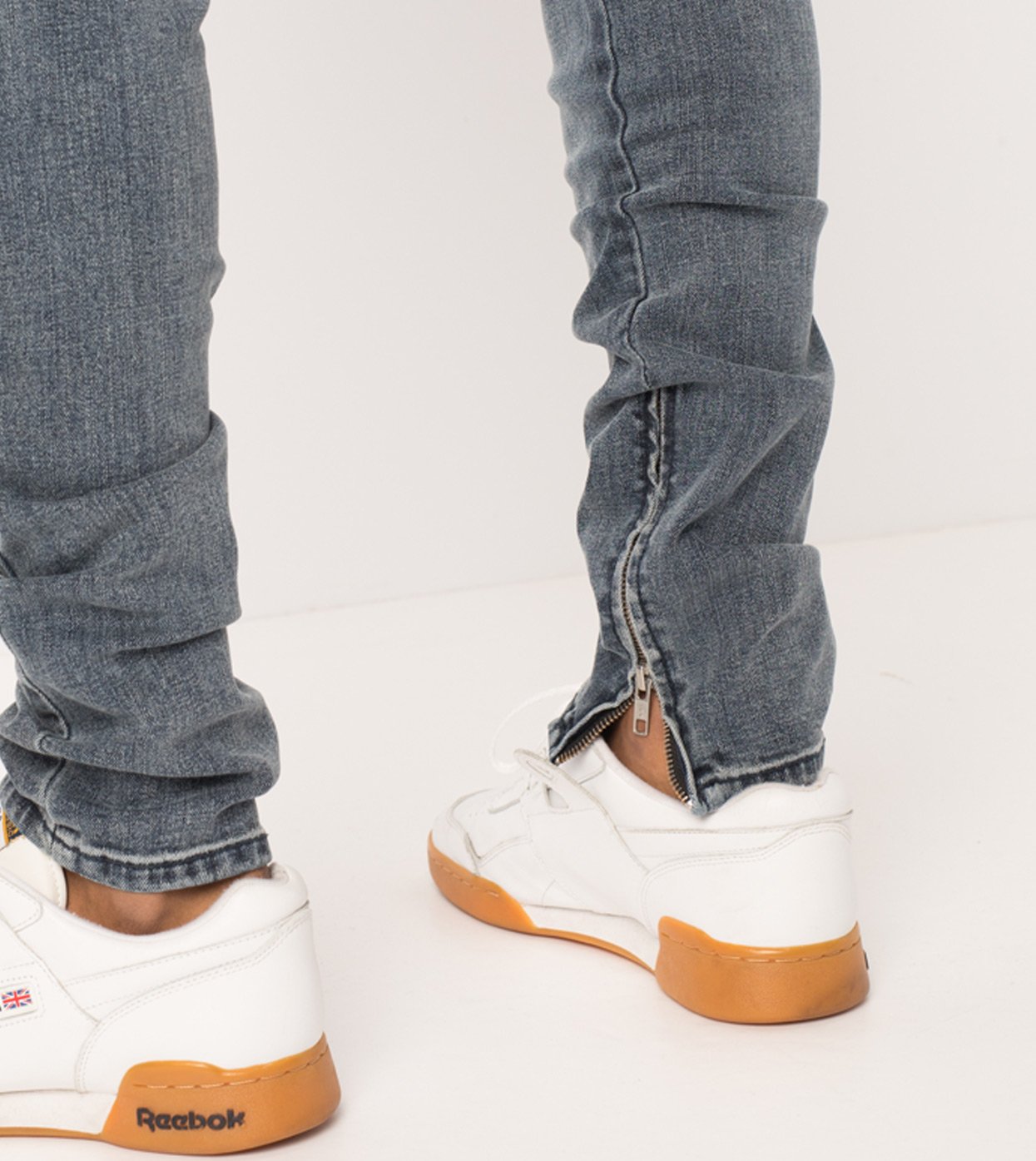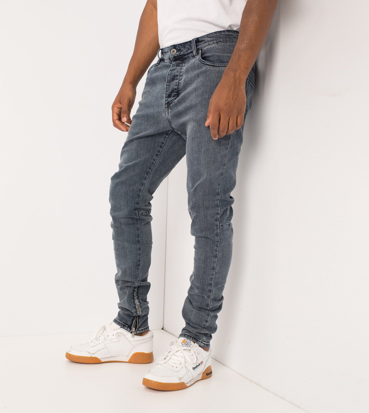 The ZANEROBE Joe Blow Denim in Deep Dark - Slim fit, aluminium zipper leg openings, constructed waist, button fly, 74% cotton, 16% polyester, 9% rayon, 1% elastane construction. We wear with our classic Flintlock Tee.