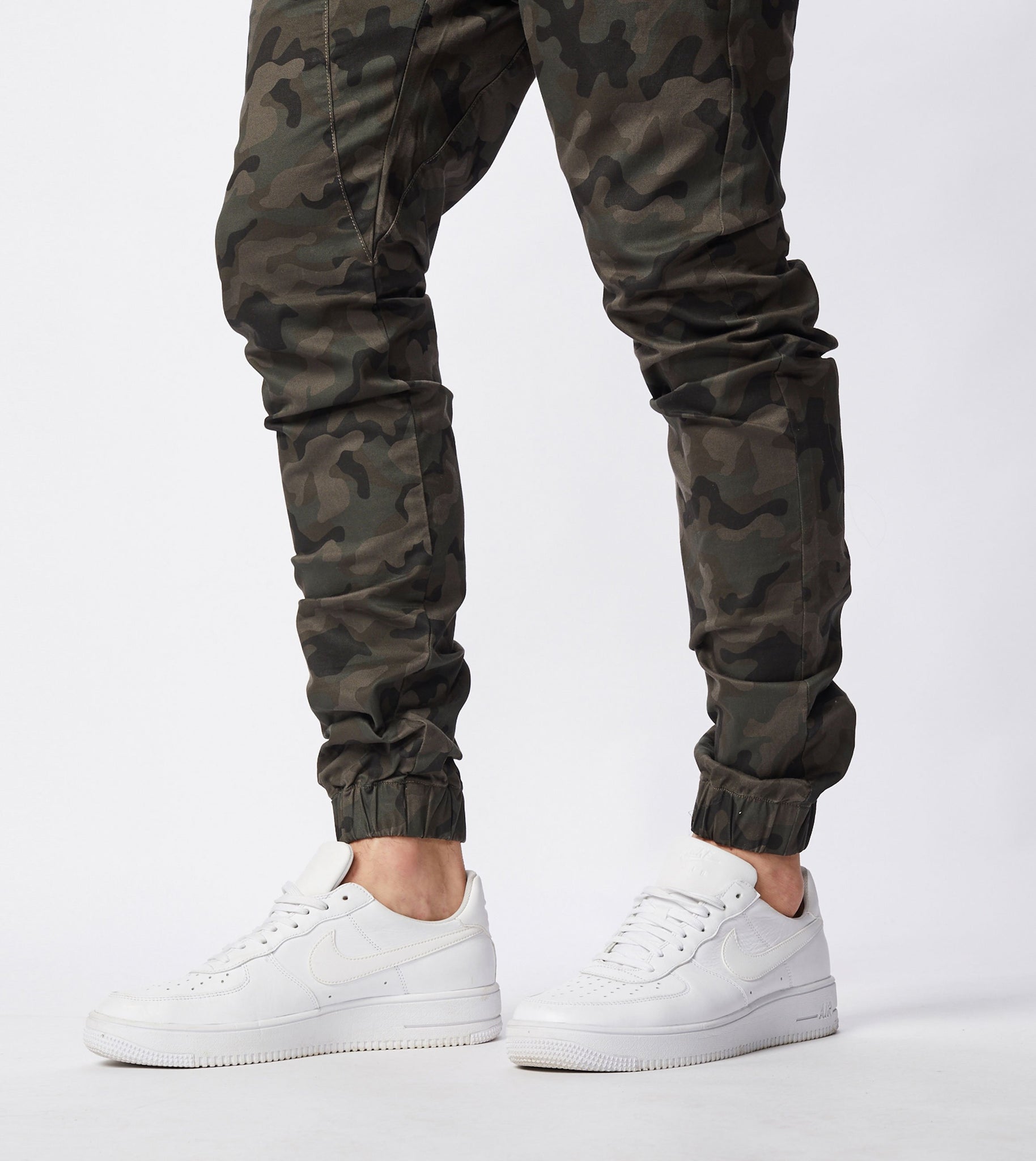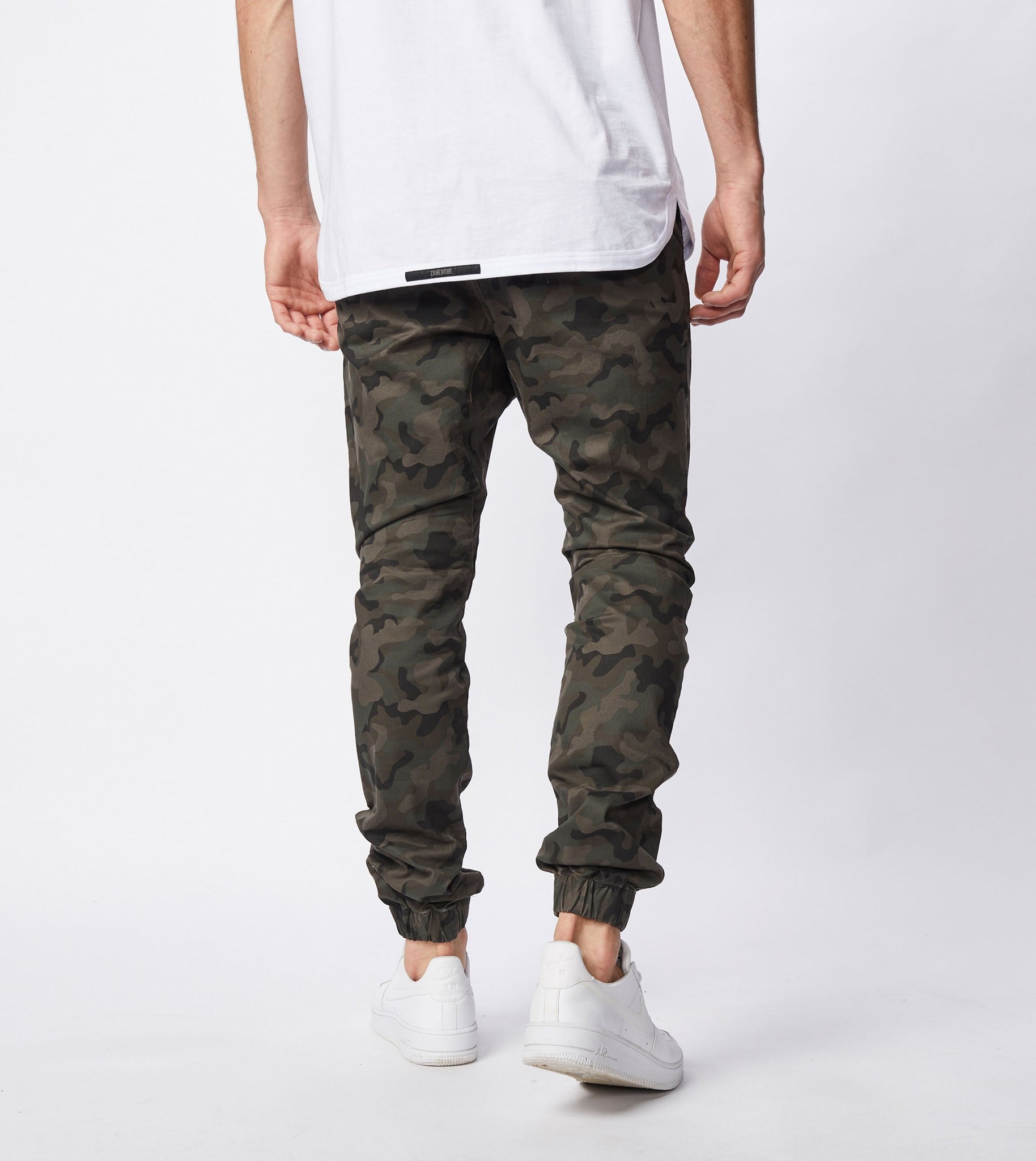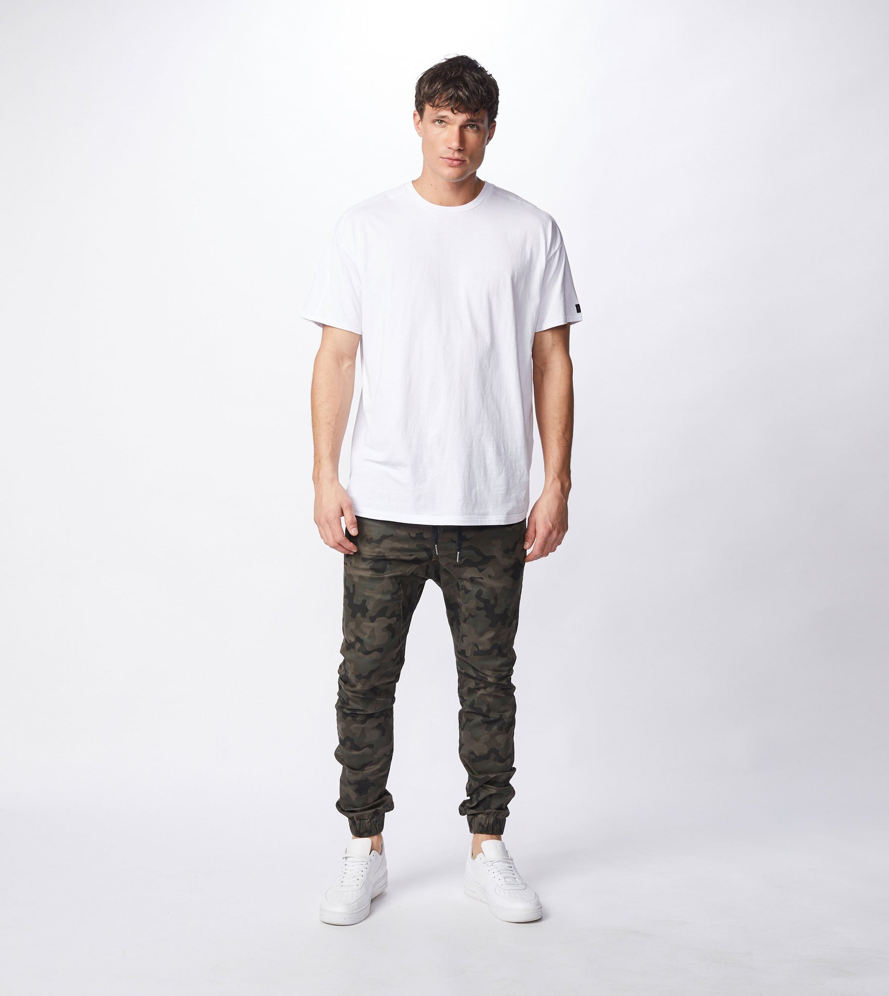 The ZANEROBE Sureshot Jogger in Dark Camo - signature jogger pants that started a menswear revolution. Worn with Supper Rugger Tee in White.