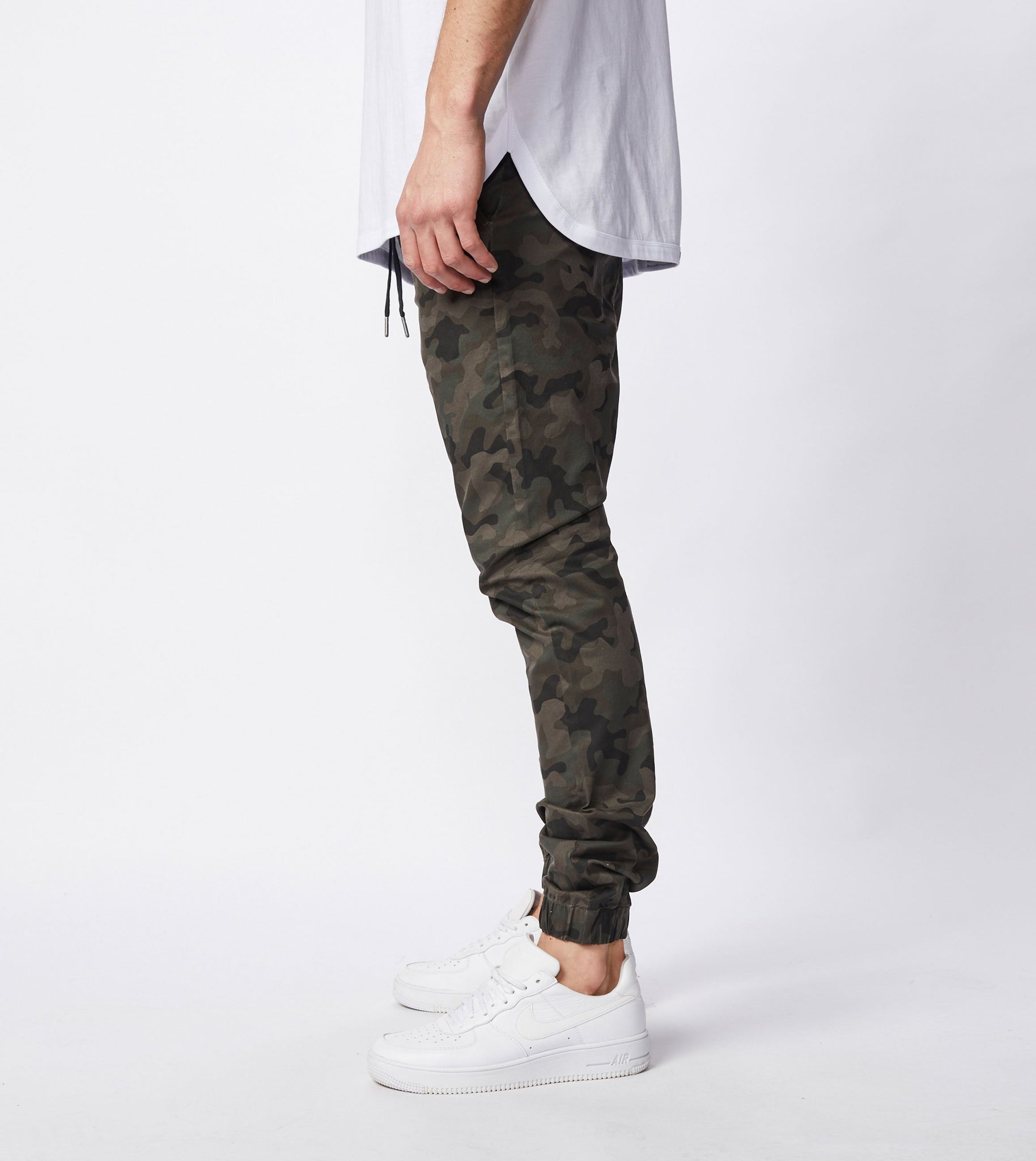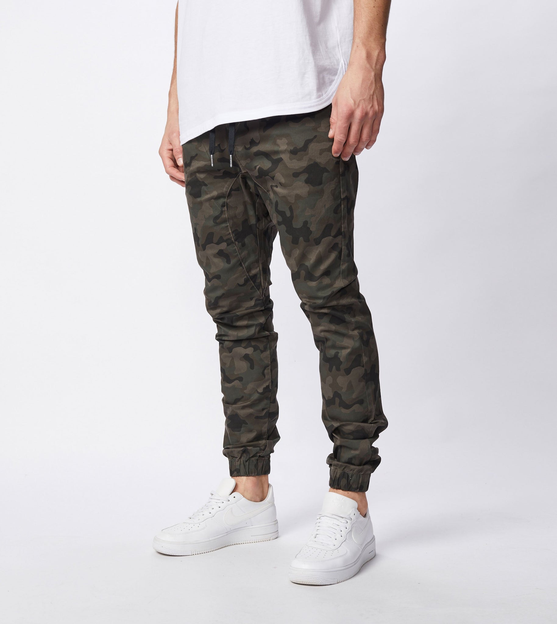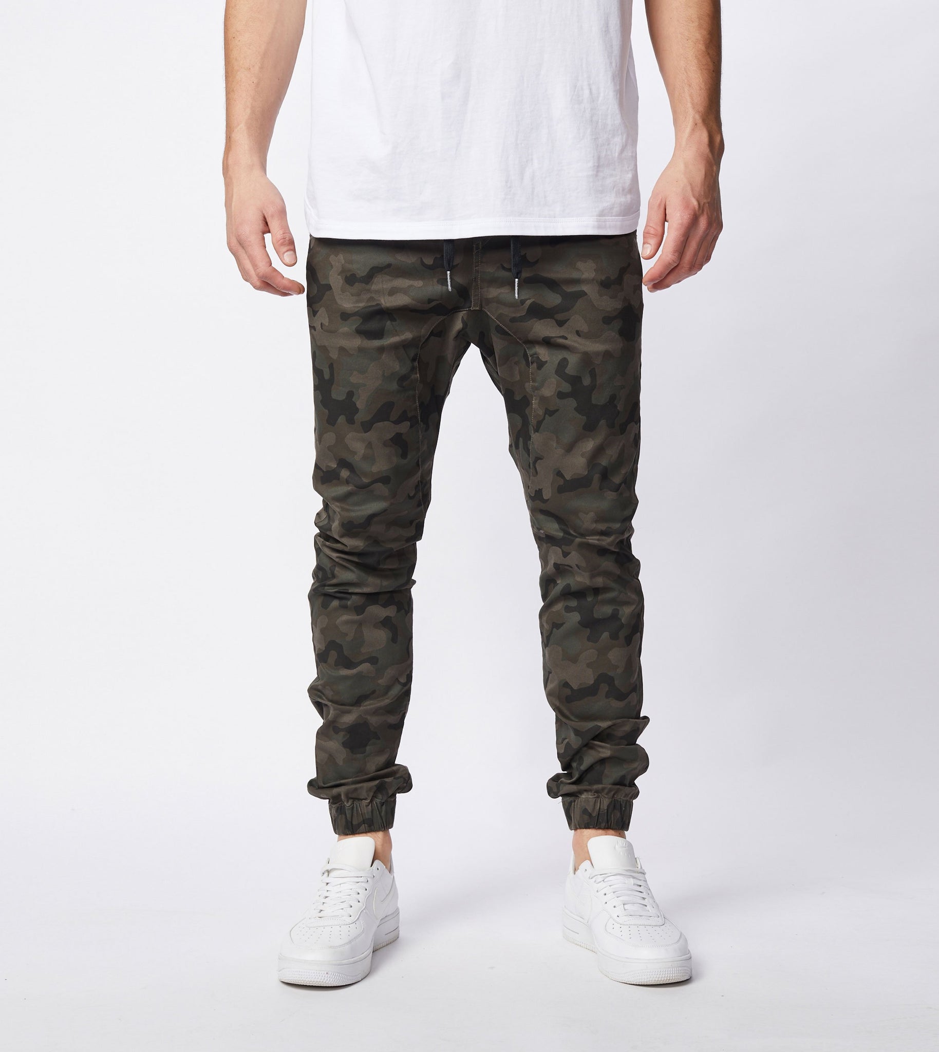 The ZANEROBE Sureshot Jogger in Dark Camo - signature jogger pants that started a menswear revolution. Worn with Supper Rugger Tee in White.