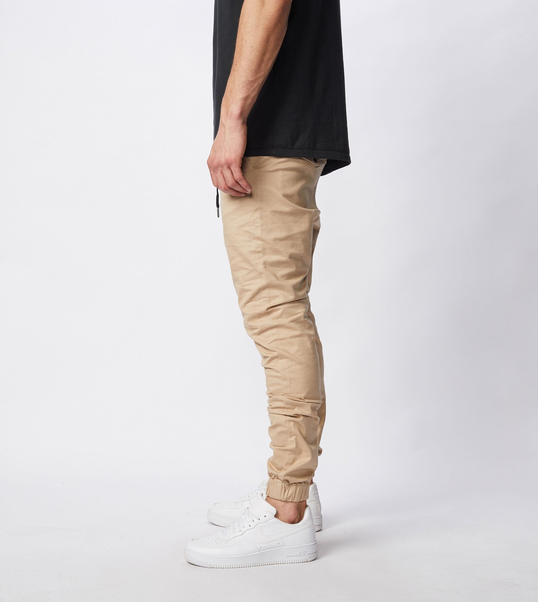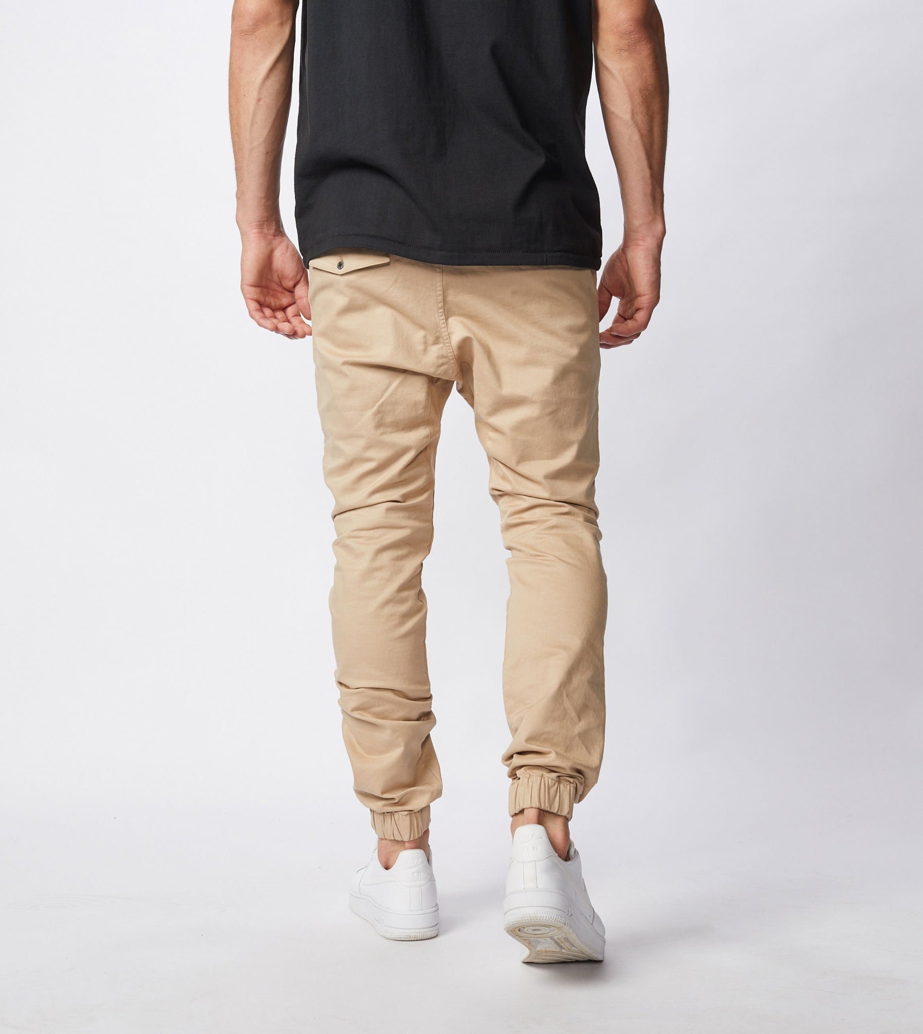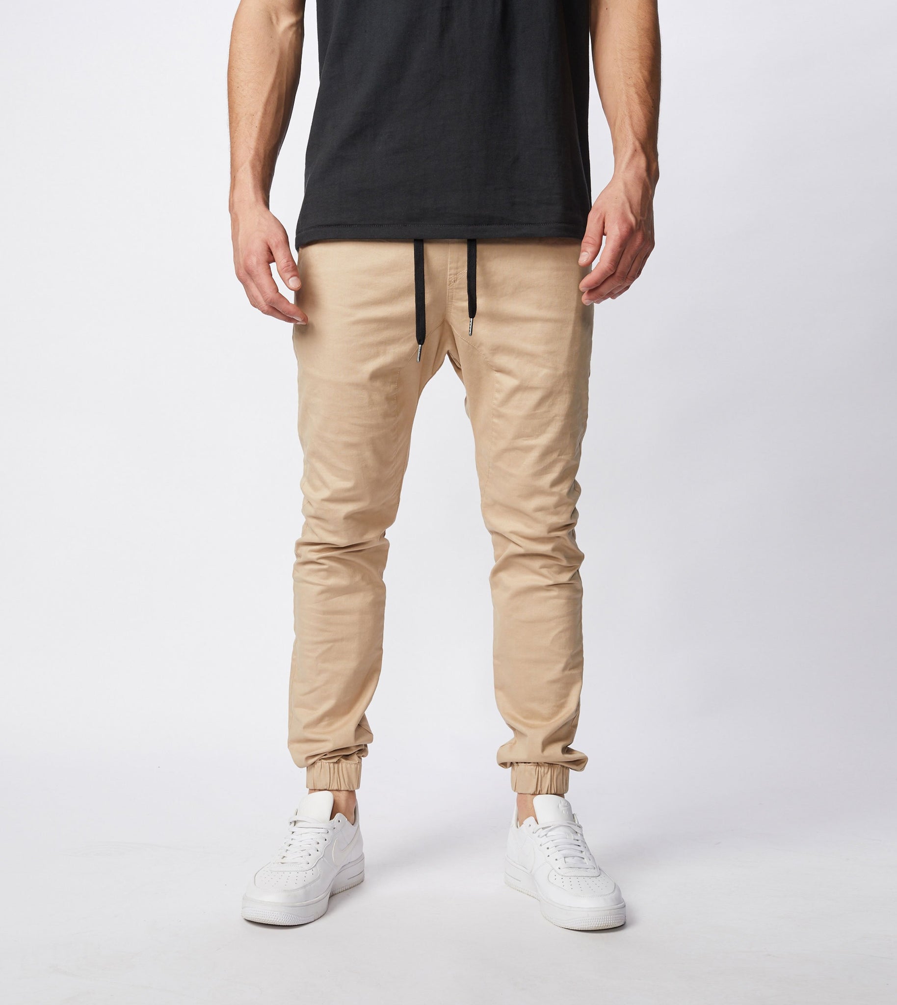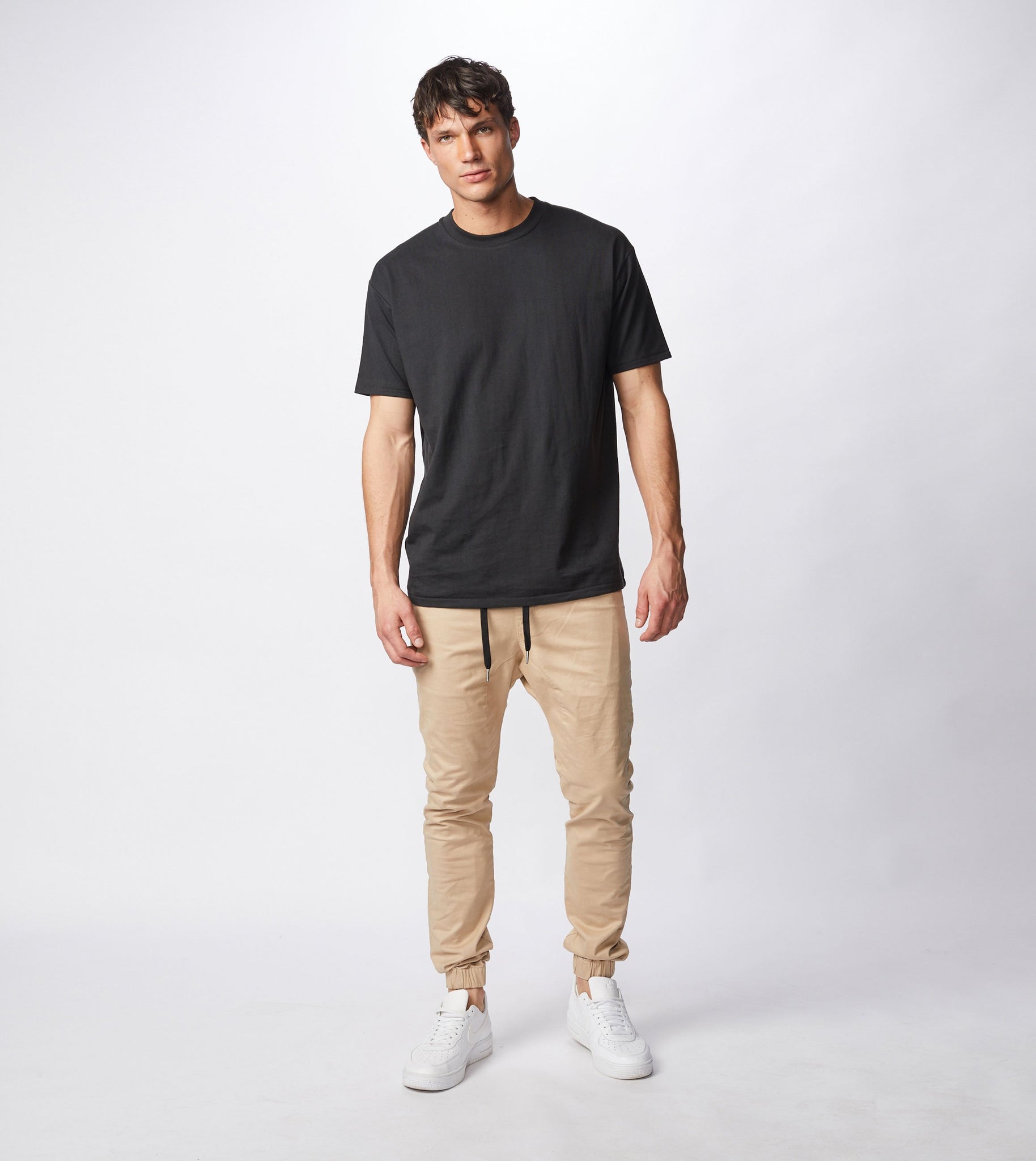 The ZANEROBE Sureshot Jogger in Tan - signature jogger pants that started a menswear revolution. Worn with black Box Tee.